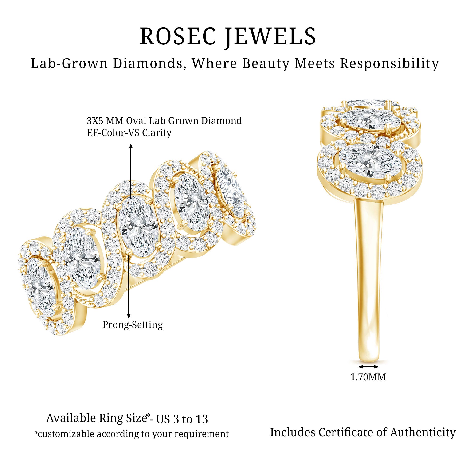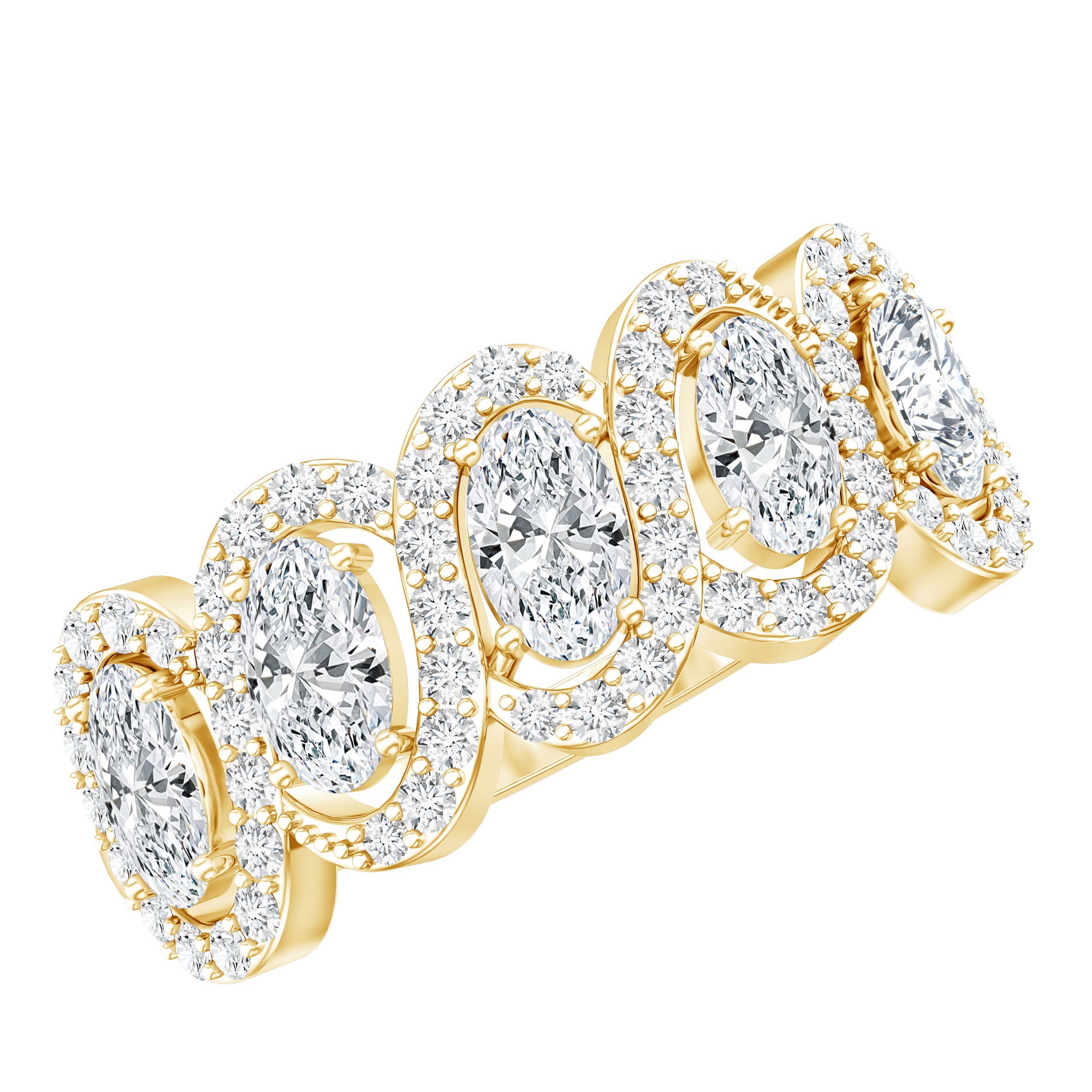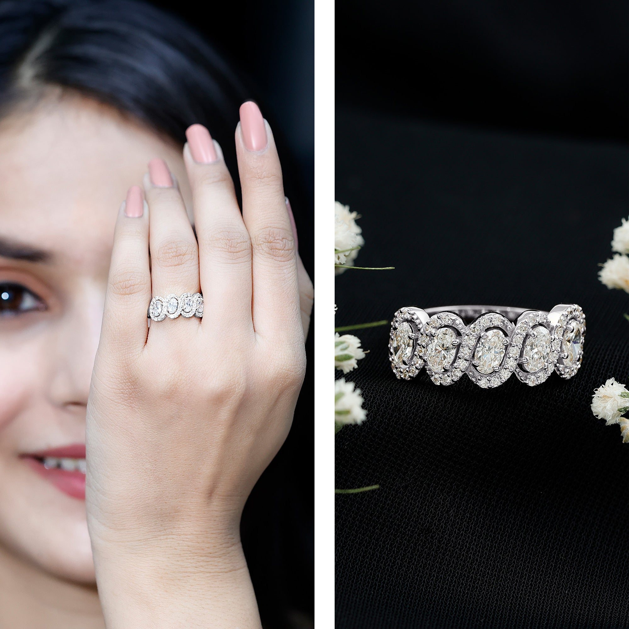This Diamond Wedding Ring completes the moment when love is in the air, it is crafted to shine with timeless beauty. This Half Eternity Ring is curated with oval shaped 5 lab made diamonds that take the spotlight, held in prong setting. Adding to its elegance, each oval-shaped gemstone is surrounded by diamond halos, enhancing the beauty of the overall design. This Anniversary Ring for Women comes with a certificate of authenticity and a signature jewelry box so, you can store your ring safely when not in use. With customization options available, you can make this Wedding Eternity Band Ring truly one-of-a-kind.