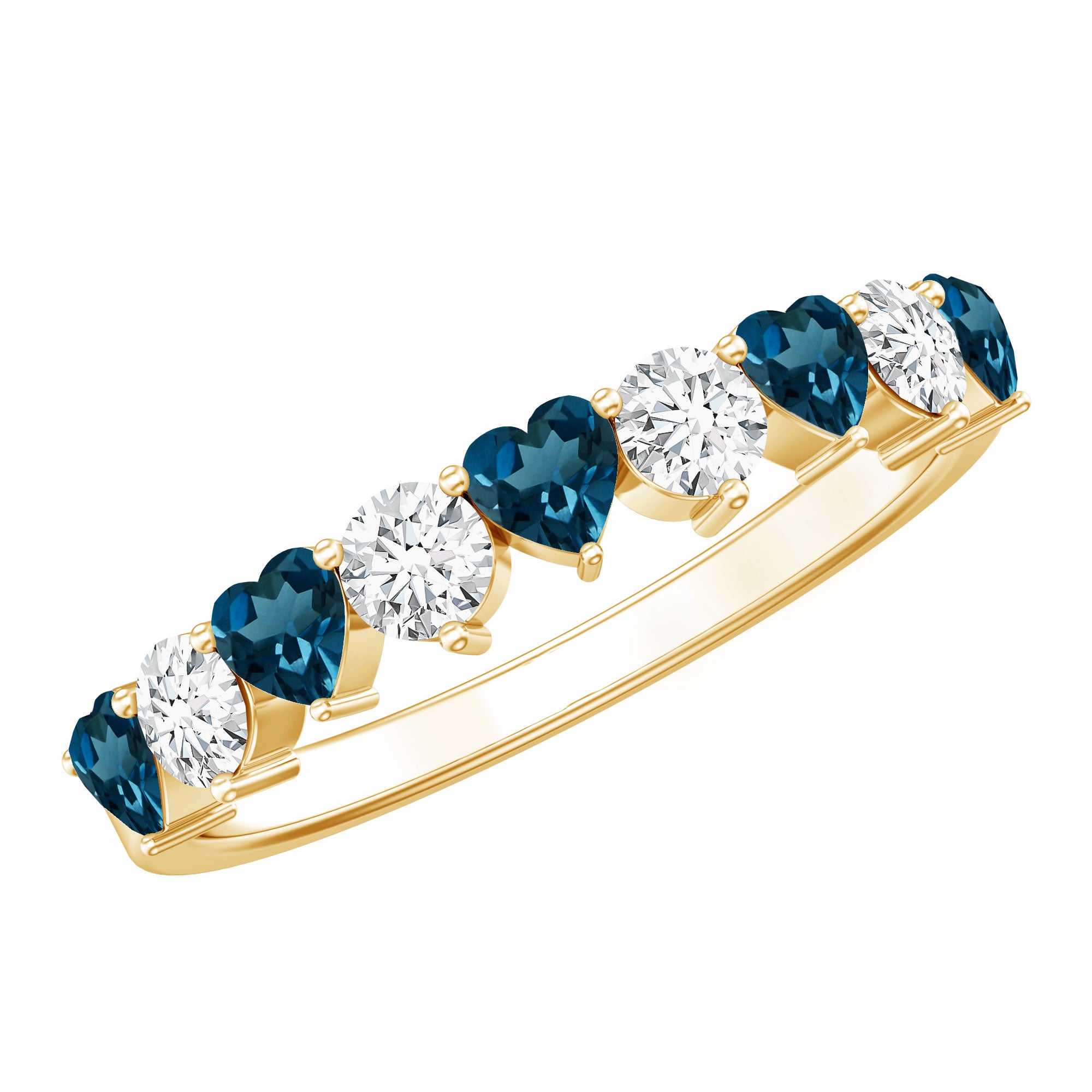A piece of jewelry that conveys the essence of love. This Blue Topaz Wedding Band embodies significance in every aspect. Crafted to celebrate the enduring connections that last a lifetime, this Heart Eternity Ring serves as an elegant emblem of commitment, meticulously designed to enhance your daily attire. It showcases carefully chosen 4 MM heart-shaped London Blue Topaz gemstones, securely set in prong settings. Each london blue topaz is accompanied by sparkling round-cut moissanites, each nestled within delicate heart-shaped frames. The alternating design creates a harmonious interplay of contrast and brilliance, imparting a gentle romantic glow to the overall aesthetic. Created with care and precision, the Heart Wedding Band features a half eternity style, offering perfect balance and comfort for everyday wear. It is ideal for individuals who appreciate jewelry with a personal touch, embodying both style and sentiment in equal measure. Whether worn solo or stacked with other rings, it brings a subtle elegance to your hand. The heart motifs introduce a romantic touch, making it a considerate choice for an anniversary, a promise, or simply a meaningful gift. This handcrafted Half Eternity Band serves as a tender reminder of enduring love and the cherished moments shared along the journey. Whether commemorating a significant occasion or merely expressing your feelings for someone special, this Eternity Stackable Ring is a timeless treasure, designed to be valued every day.