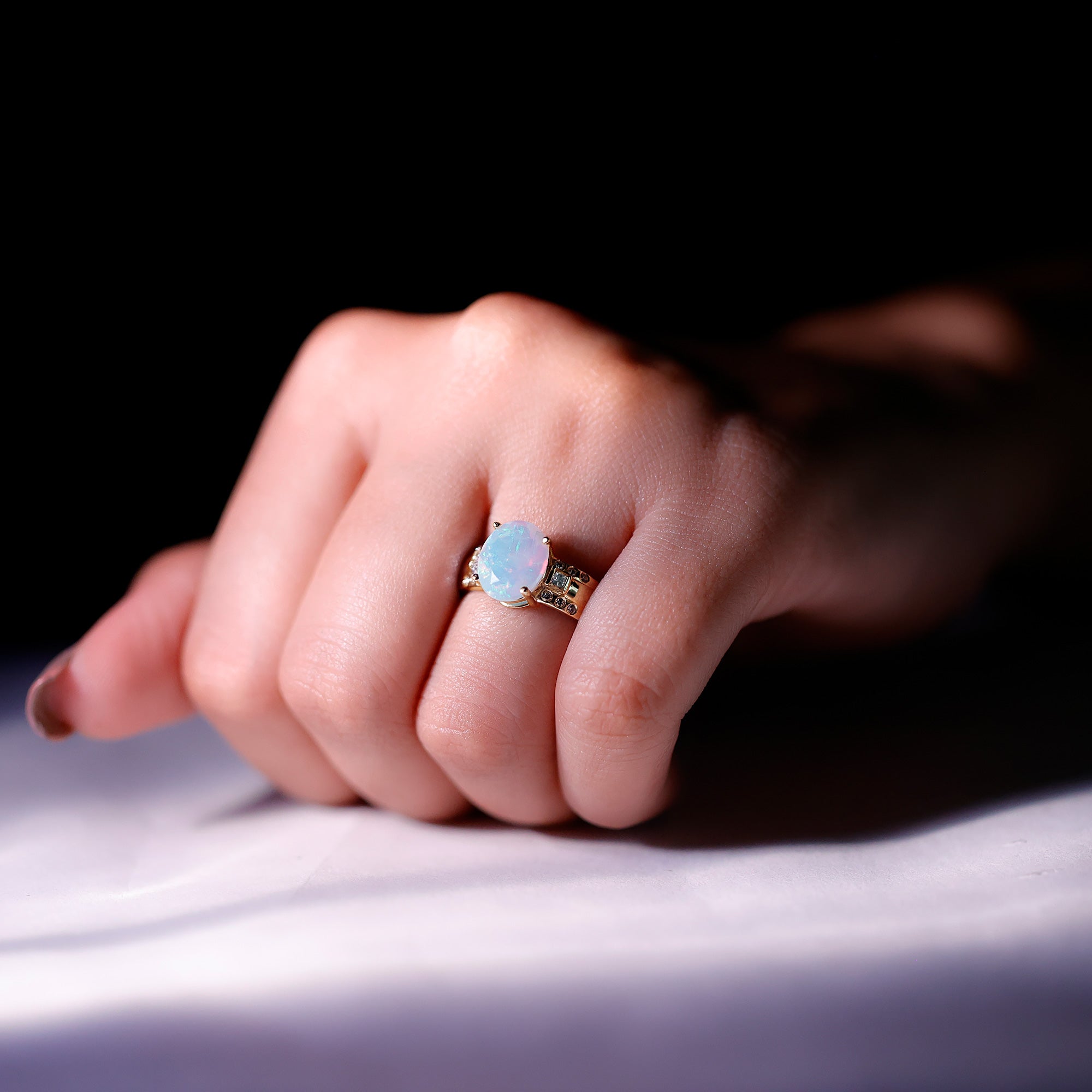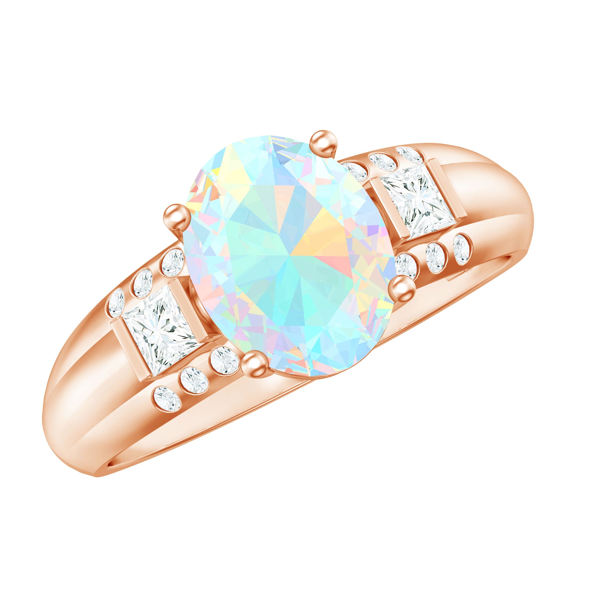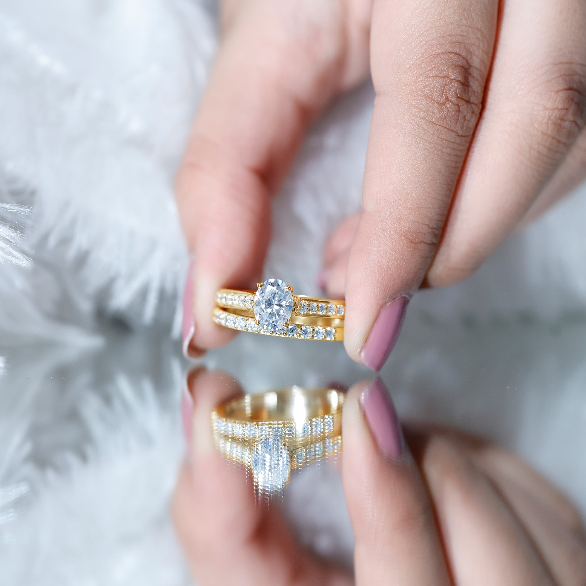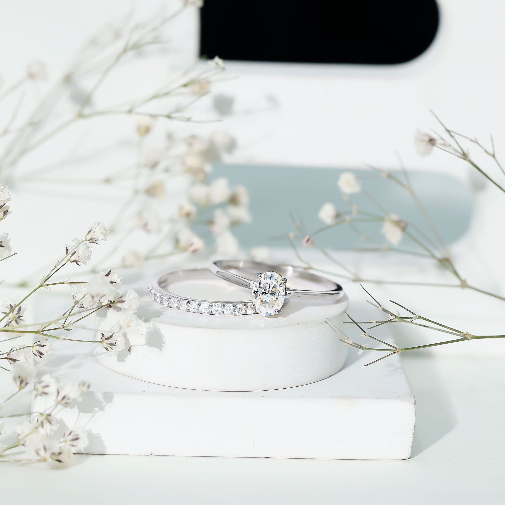 Halo settings, thin bands, and elongated shapes like oval or pear enhance face-up size.