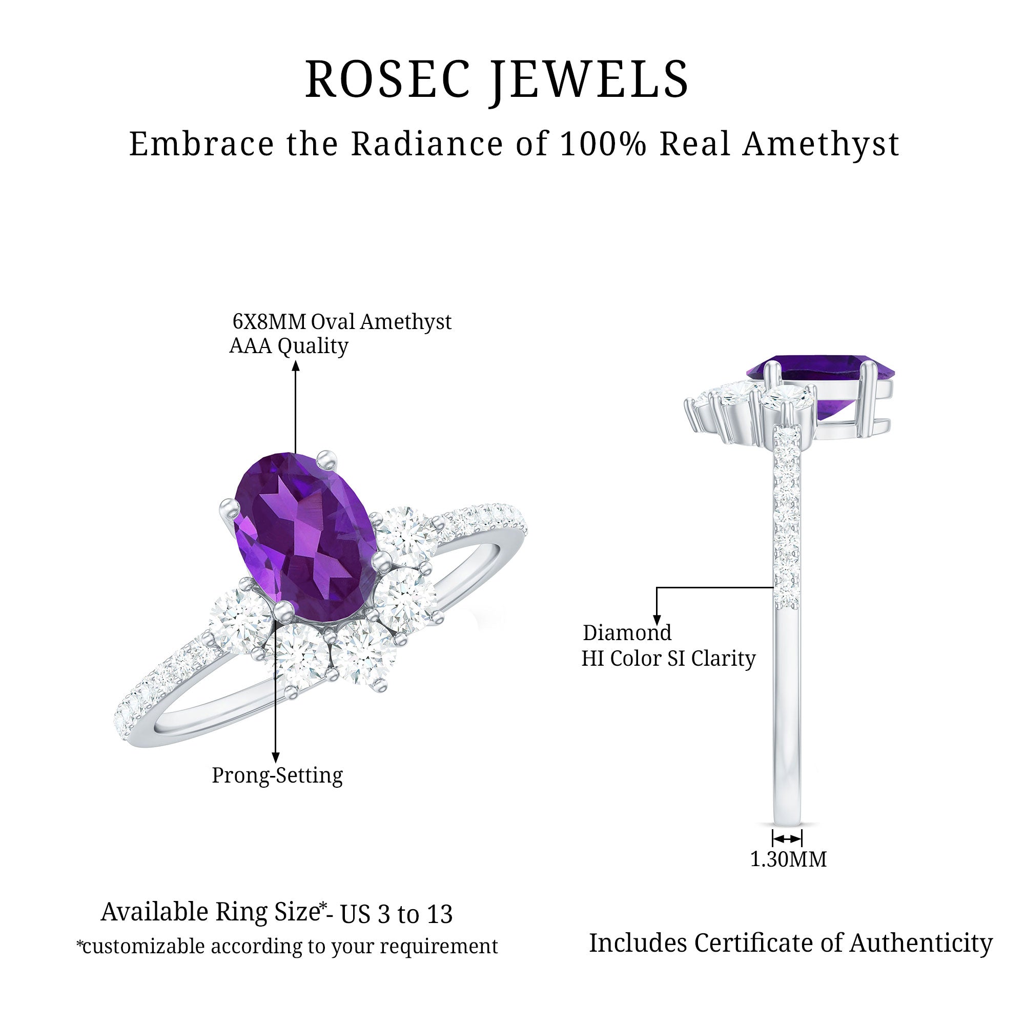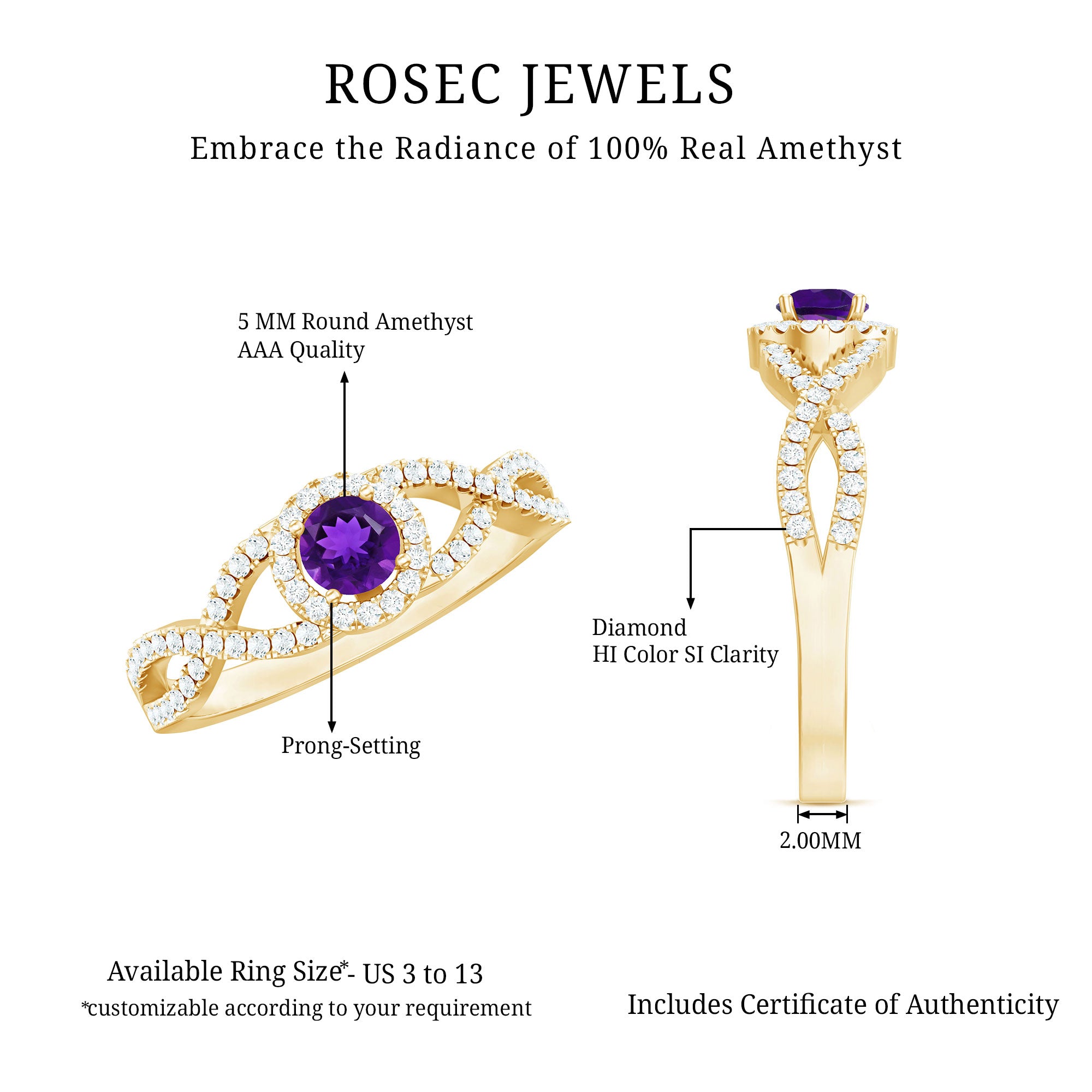 Rosec Jewels is known to handcraft the top-notch quality of amethyst engagement ring. From vintage amethyst engagement rings to simple amethyst engagement rings, our collection have it all! Our artisans are open to customize amethyst engagement rings on your demand. We use hallmarked gold, and certified amethyst to handcraft the engagement rings. Our company avail free shipping and 60 days free return policy, to ensure trust from customer’s side.
