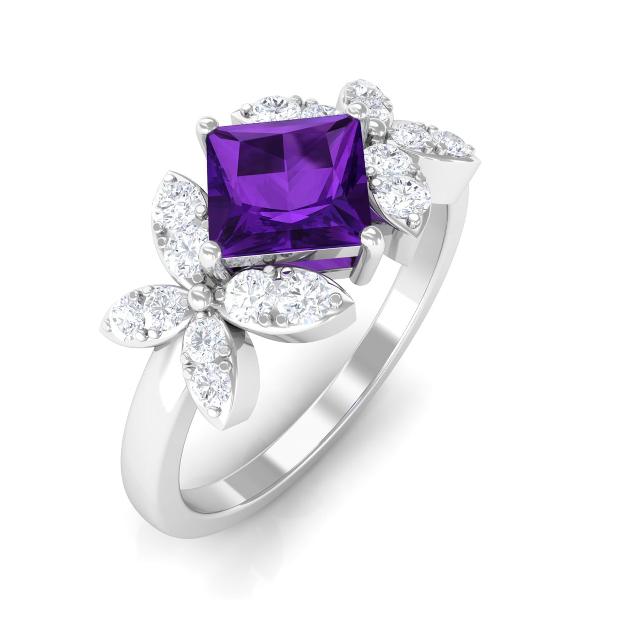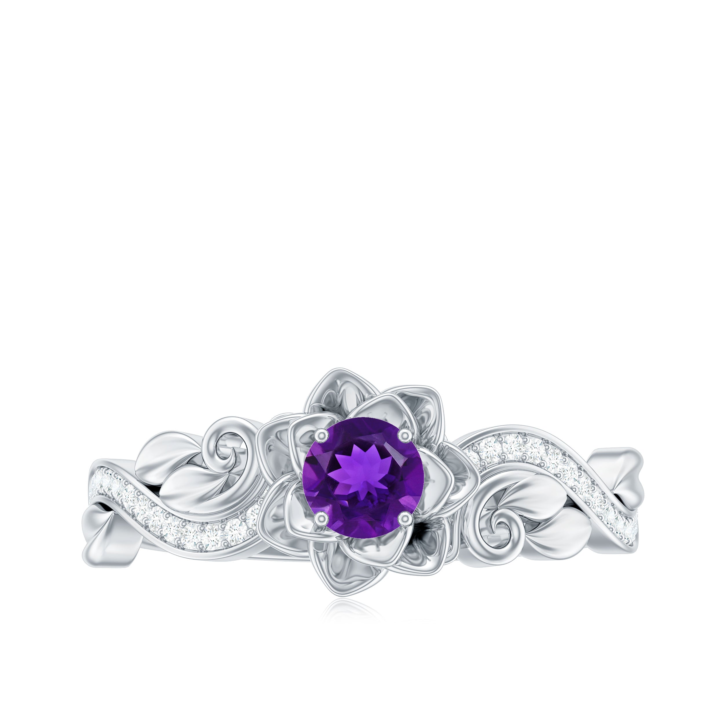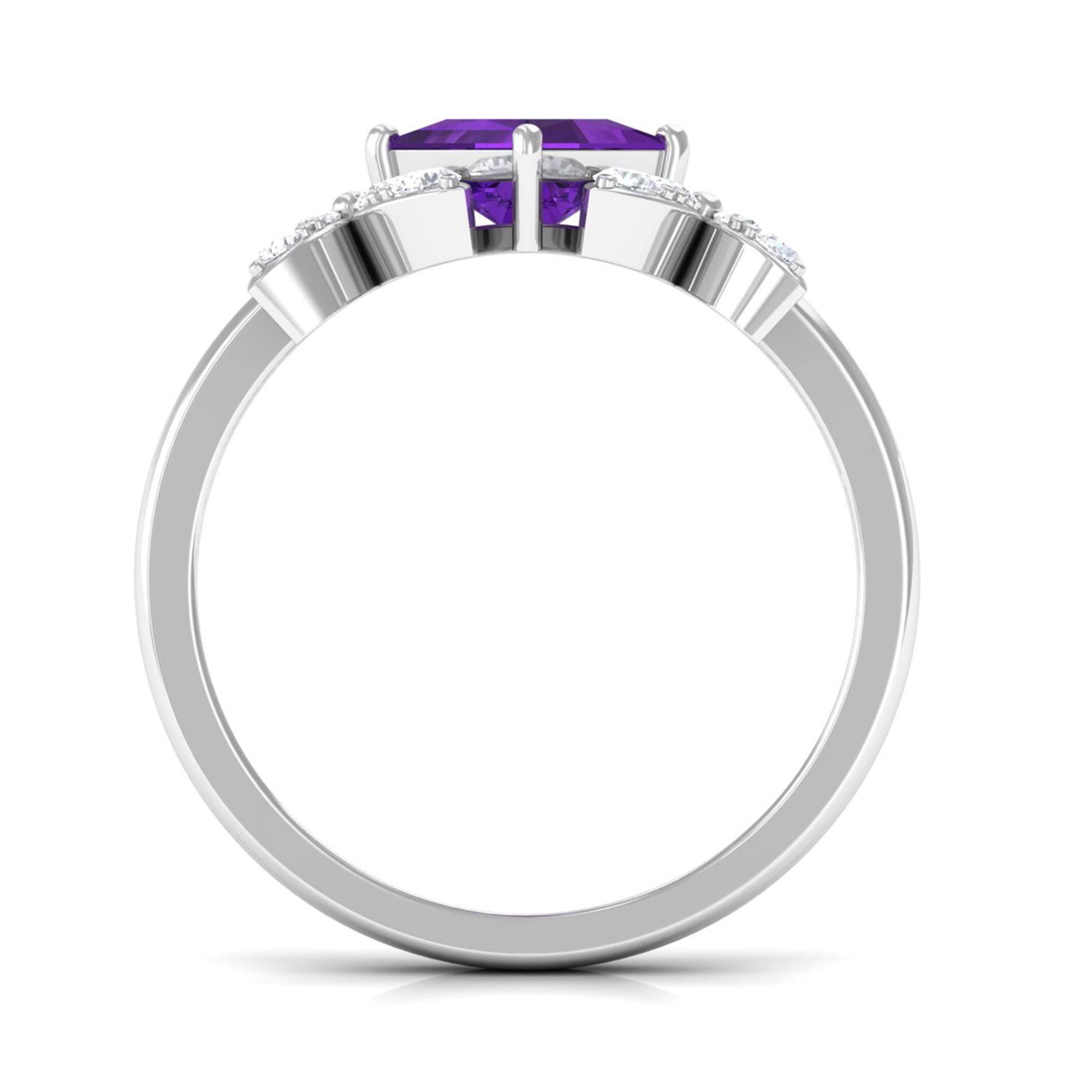 Halo is a setting of gemstone rings in which small accents of gemstone surround the center stone. Our amethyst halo rings are rings with center amethyst surrounded by small accents of diamonds and moissanites. Diamond and moissanites accents help in adding more brilliance to the amethyst rings. The benefit of the Halo designs is that the style is a blend of modern and classic styles and appears bigger as compared to solitaire.