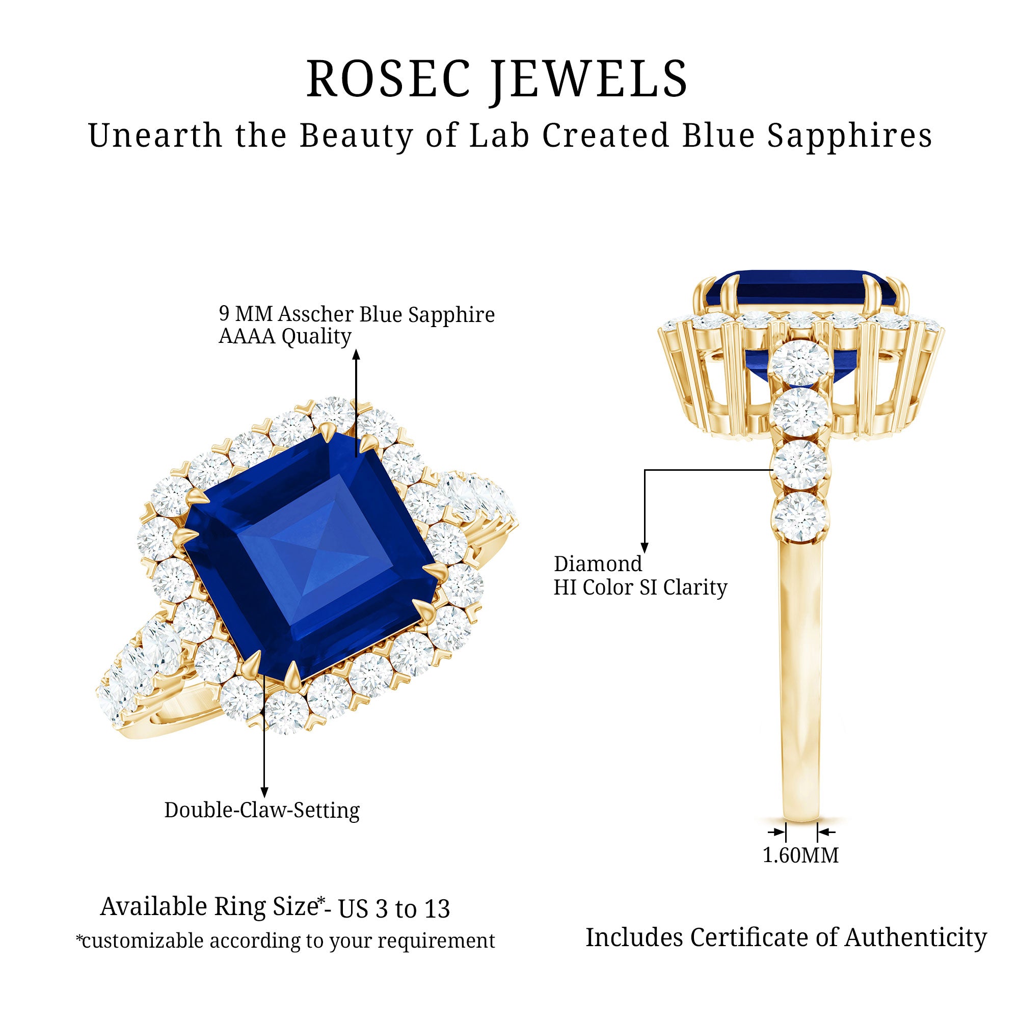 Asscher is a square step cut—so it can appear slightly smaller than some elongated shapes at the same carat weight. If you want more finger coverage, consider a halo setting or a wider band design.