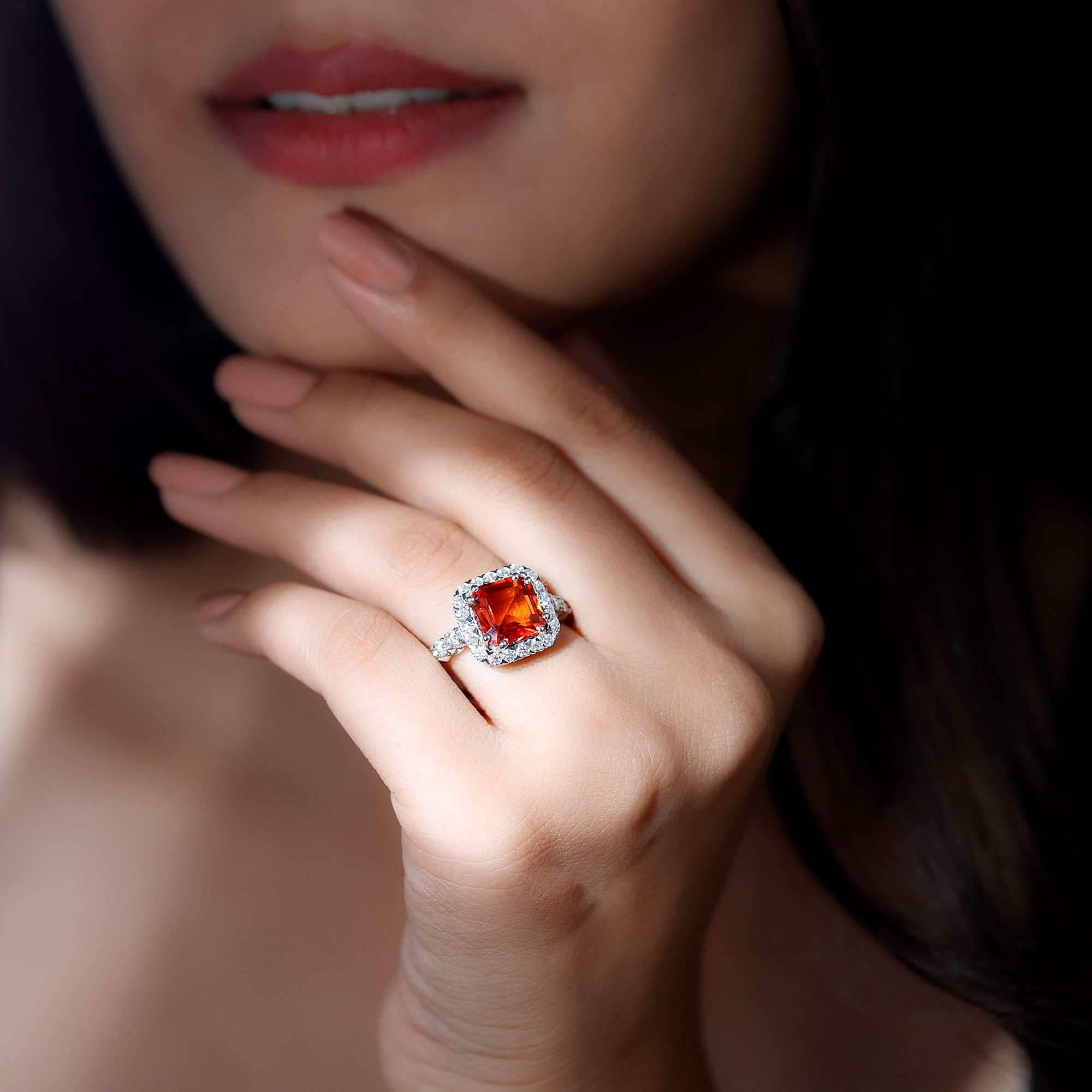 Asscher is a square step cut with cropped corners. It’s known for a structured, Art Deco look and a “hall of mirrors” style sparkle with clean reflections.