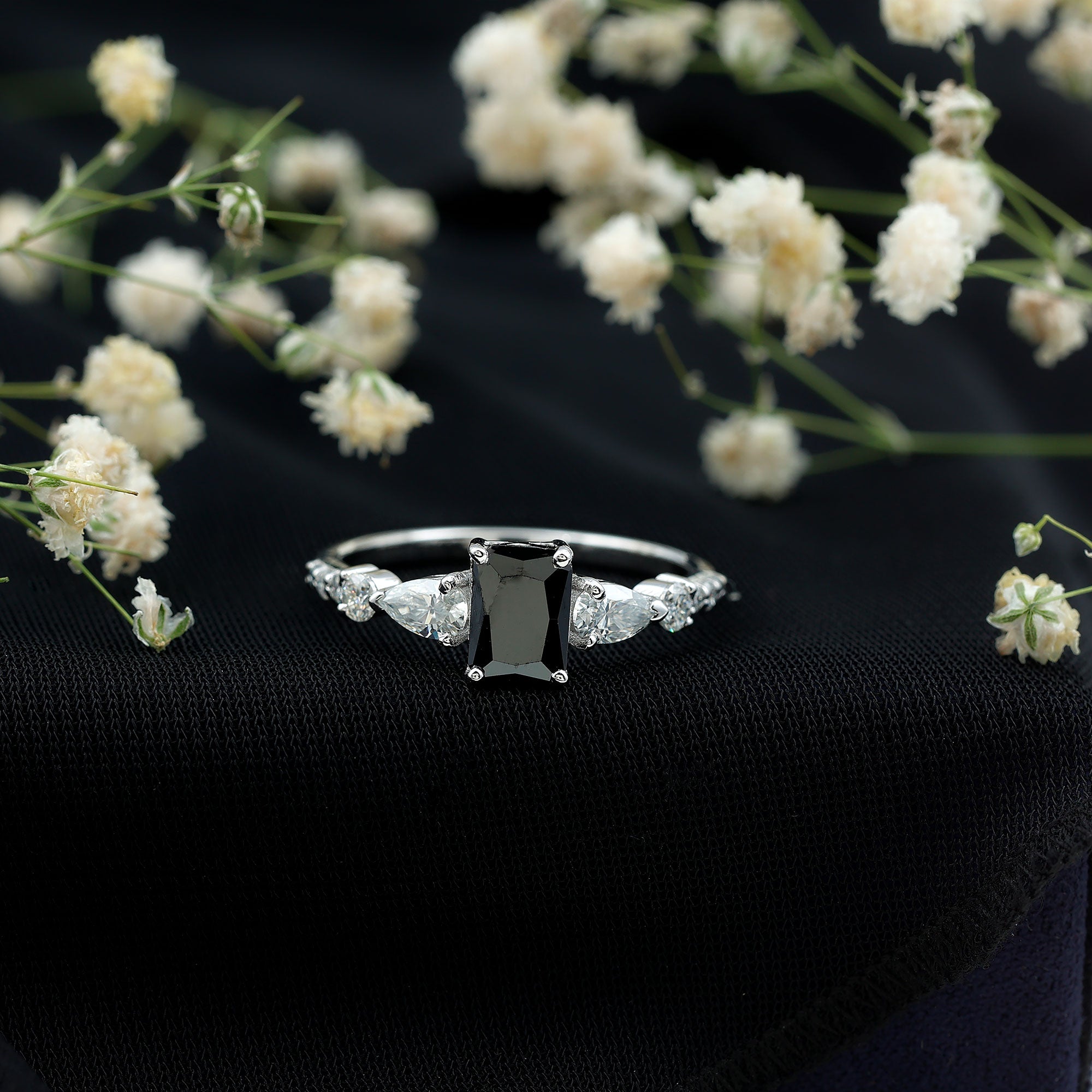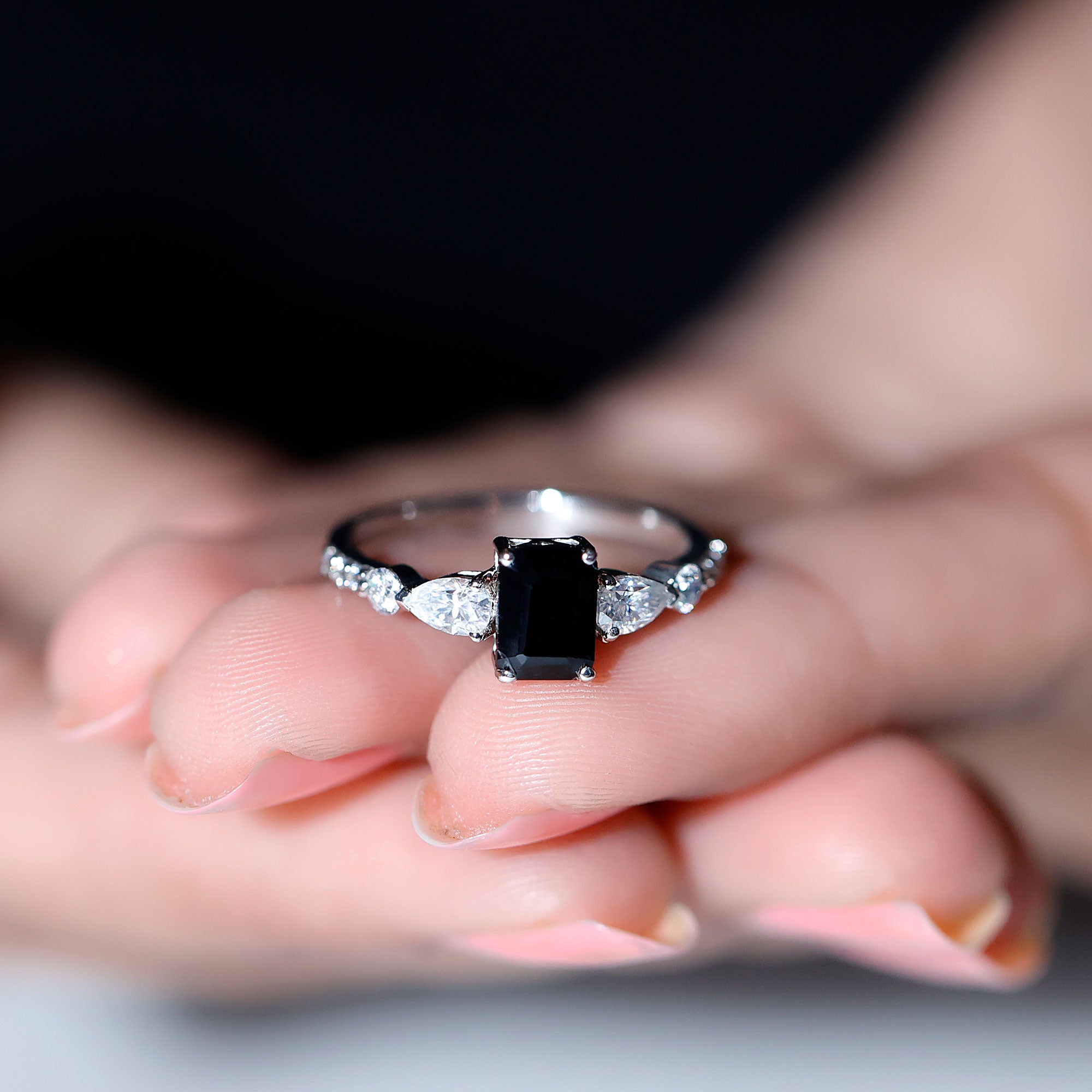 Three Stone lab Created Engagement Ring in Black Diamonds: These rings symbolizing past, present and future of couples relationship through three gemstones are beautiful as well as meaningful choices. These similar or different gemstones add a sentimental value, promising a shared future.