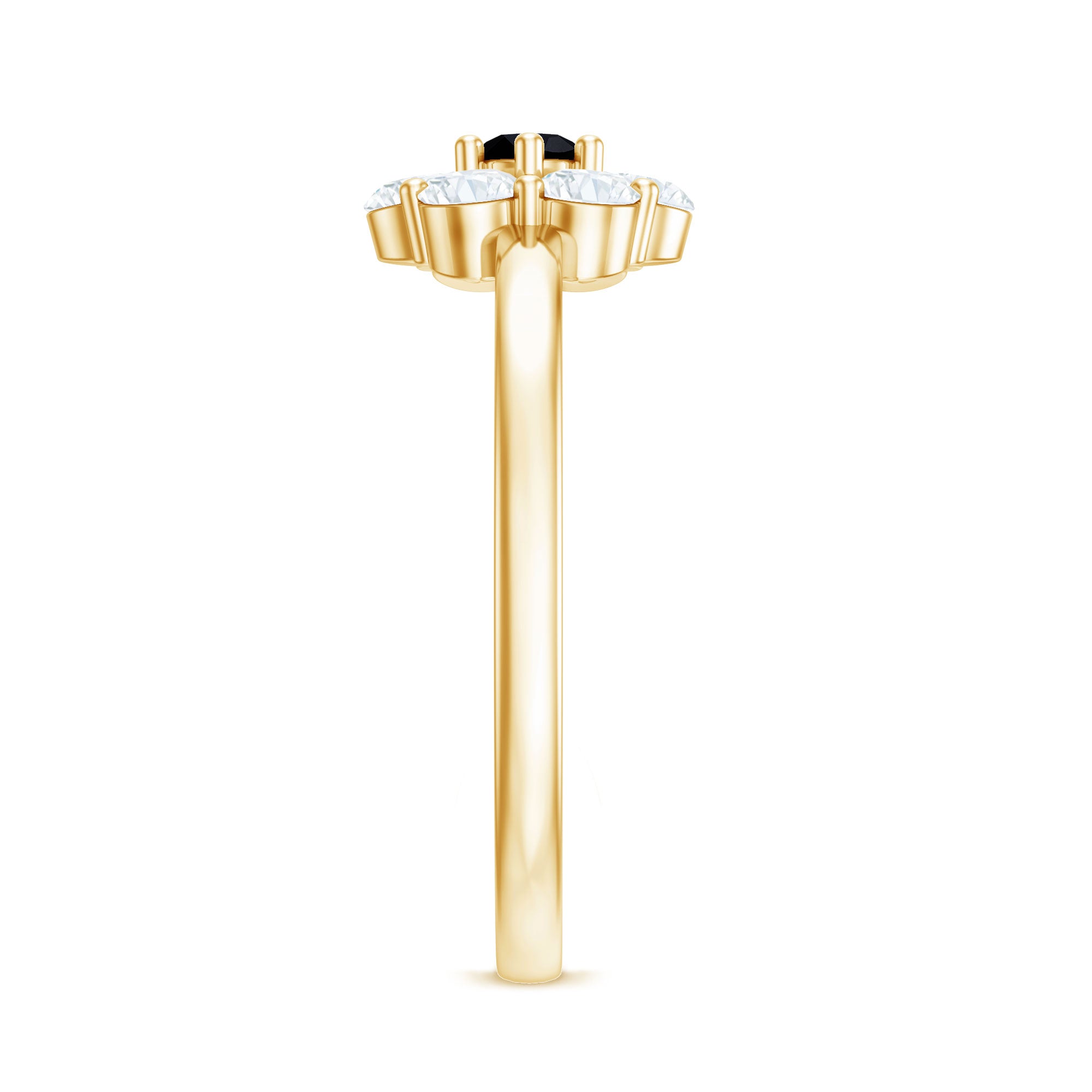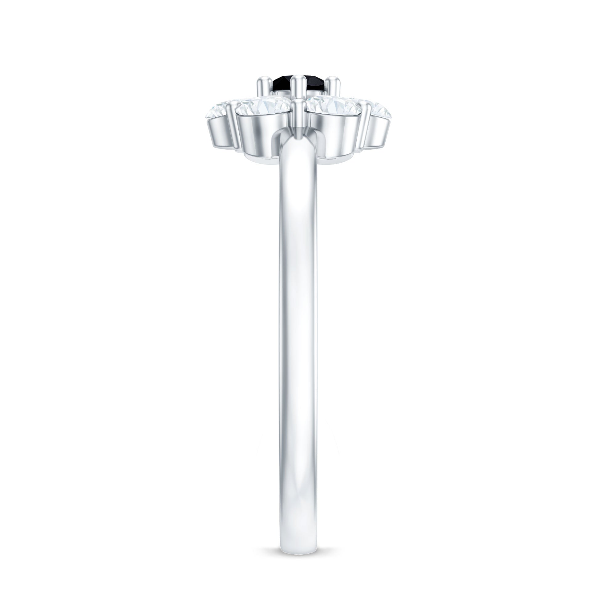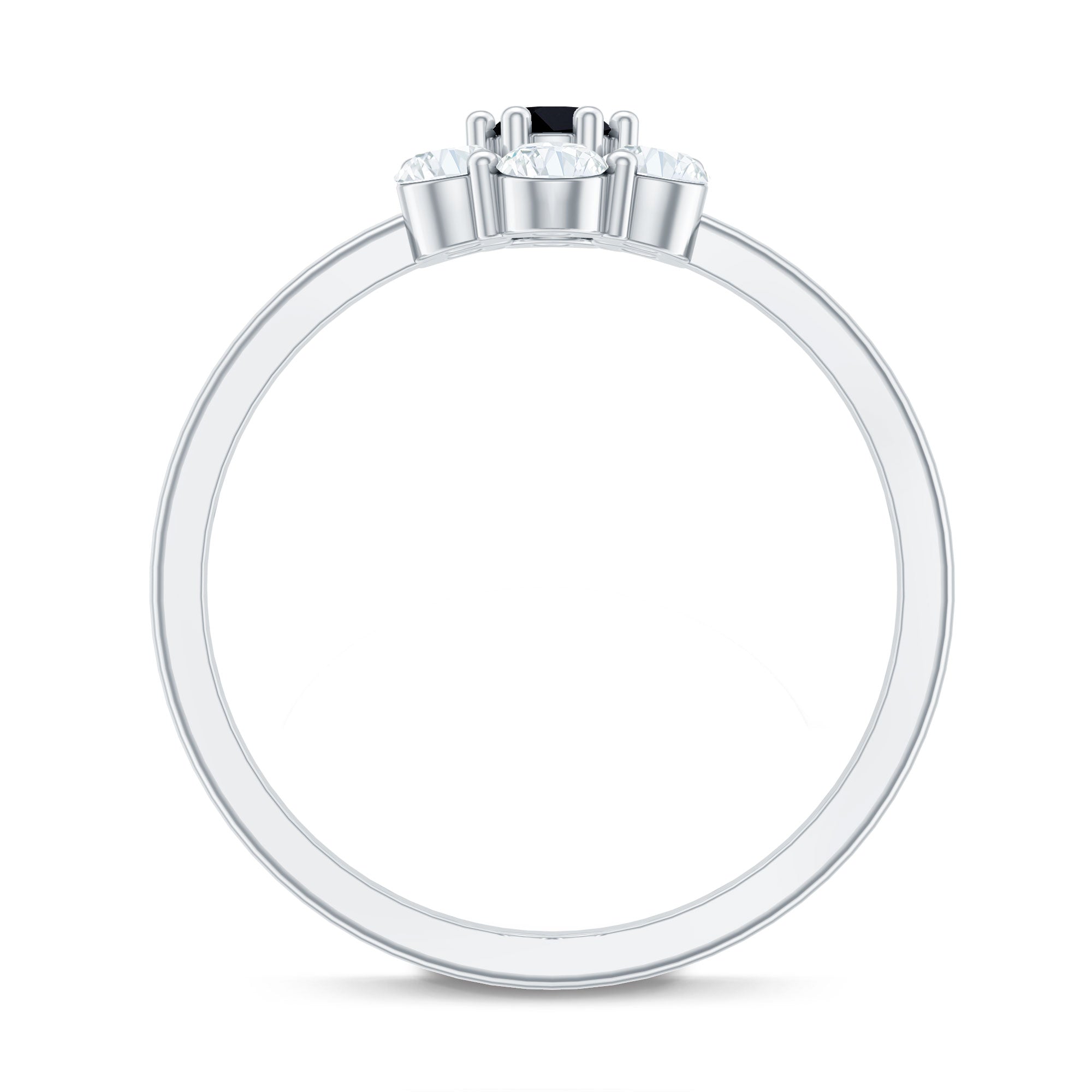 Edgy and sparkly, this ring style incorporates a shimmering row of Diamond/Moissanite all around the Center Stone of the Black Diamond. If you fancy a simple Black Diamond Ring but have a thing for sparkles, you won’t find a better pick. It also visually appeals with its monochromatic combination of black and white.