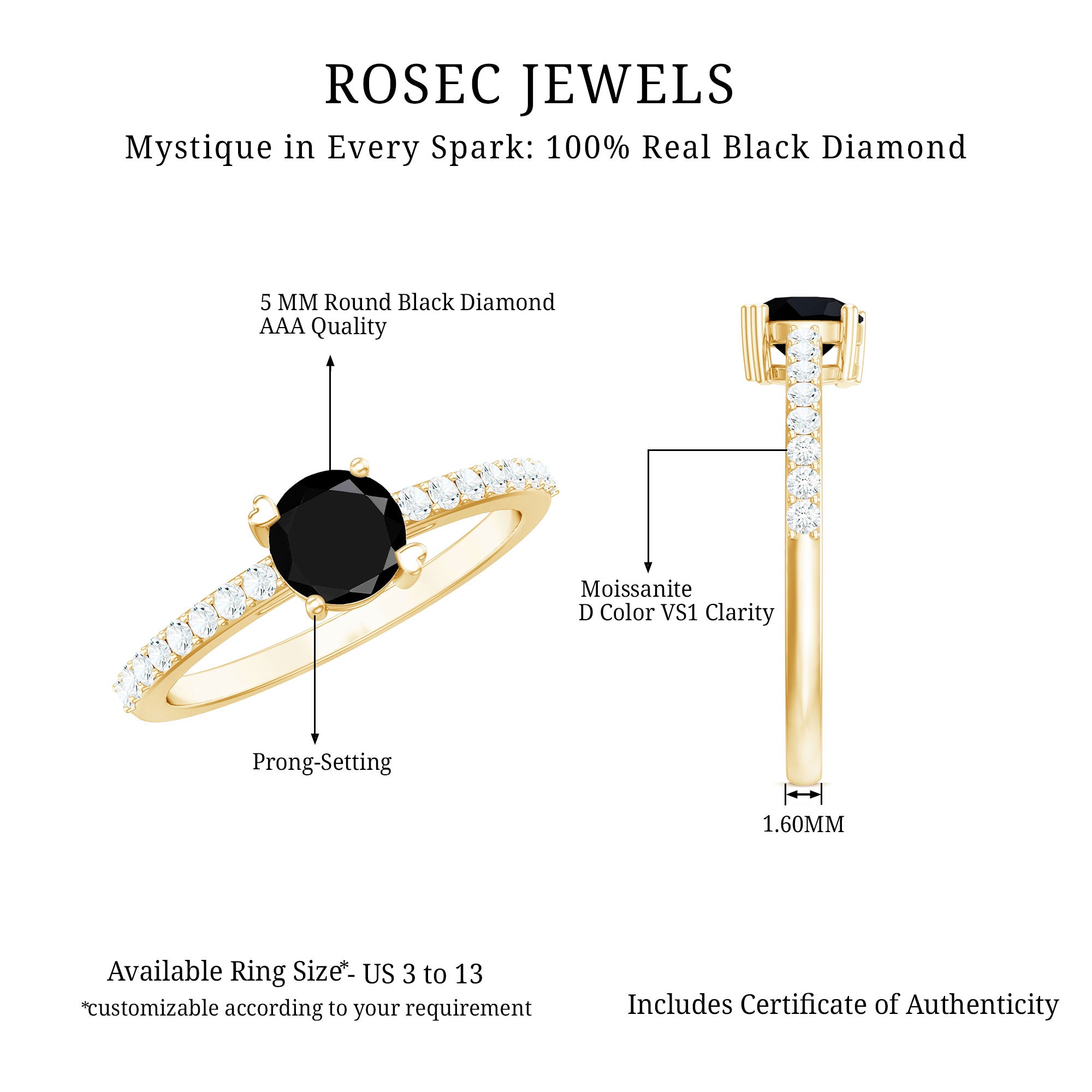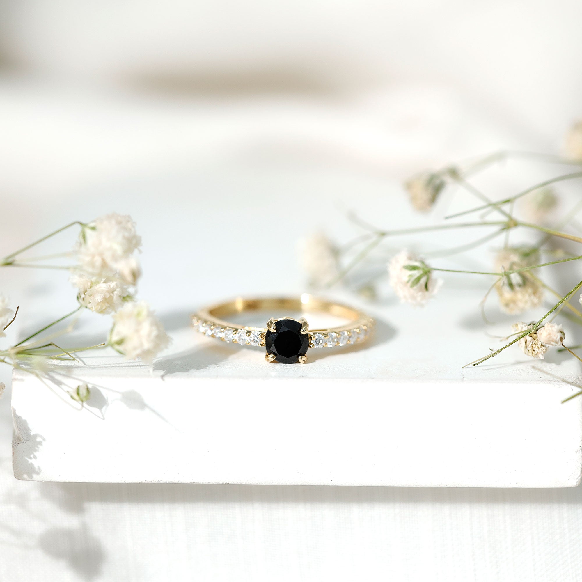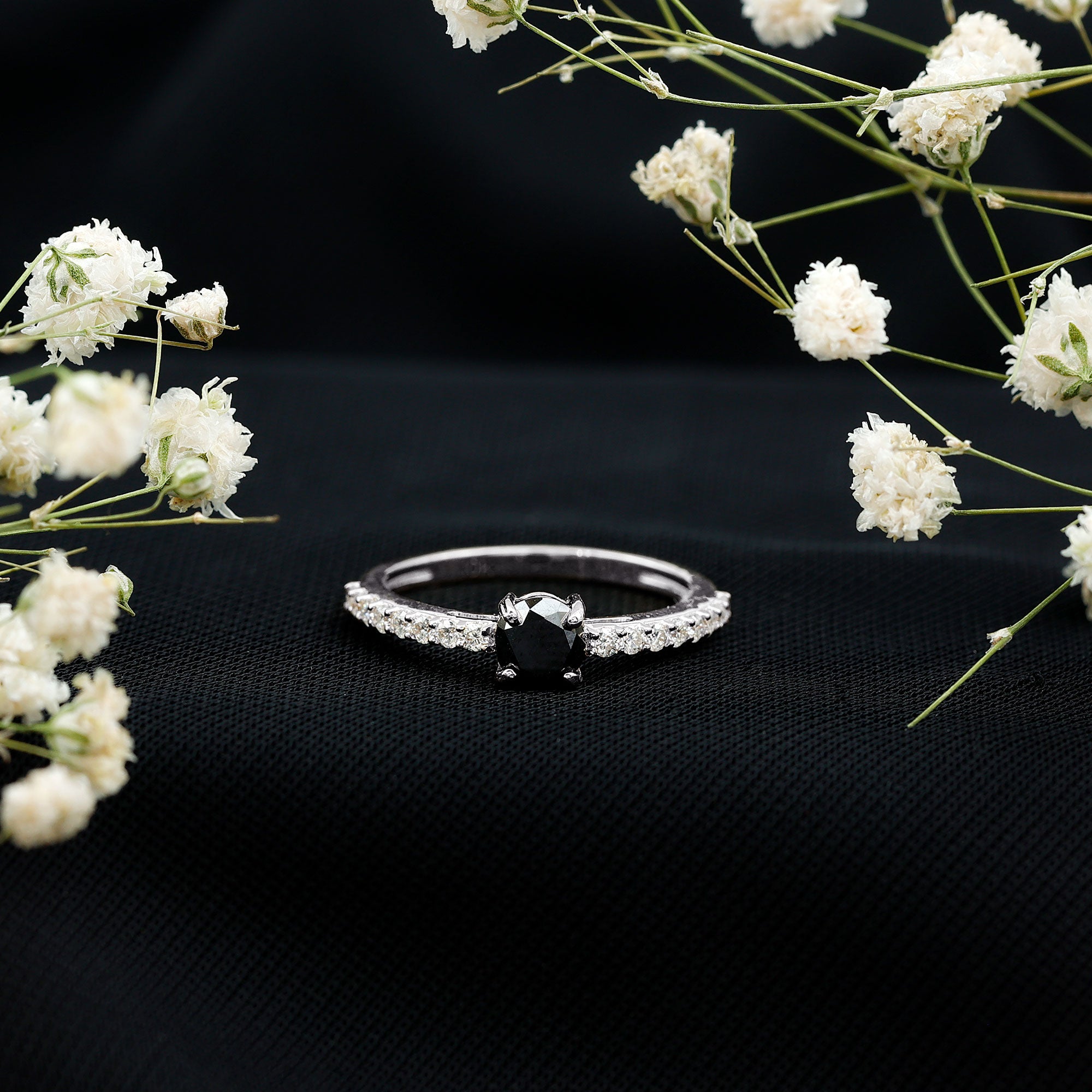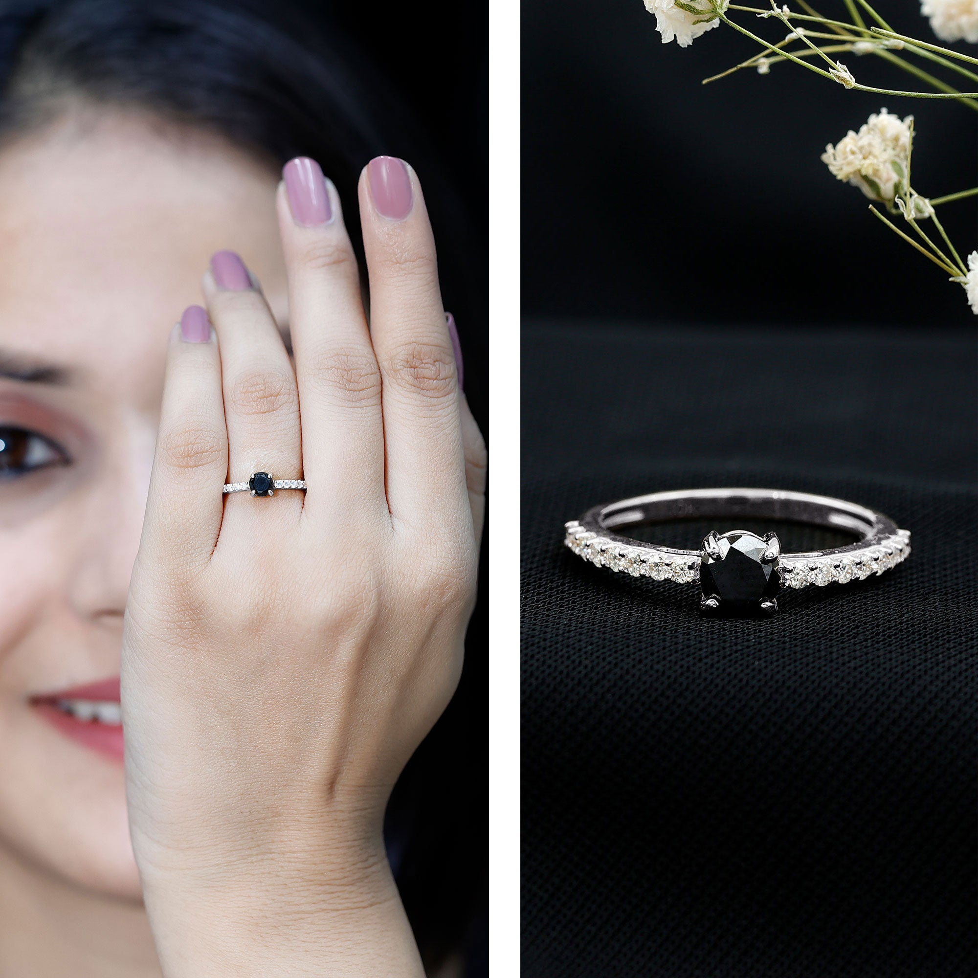 Edgy and sparkly, this ring style incorporates a shimmering row of Diamond/Moissanite all around the Center Stone of the Black Diamond. If you fancy a simple Black Diamond Ring but have a thing for sparkles, you won’t find a better pick. It also visually appeals with its monochromatic combination of black and white.