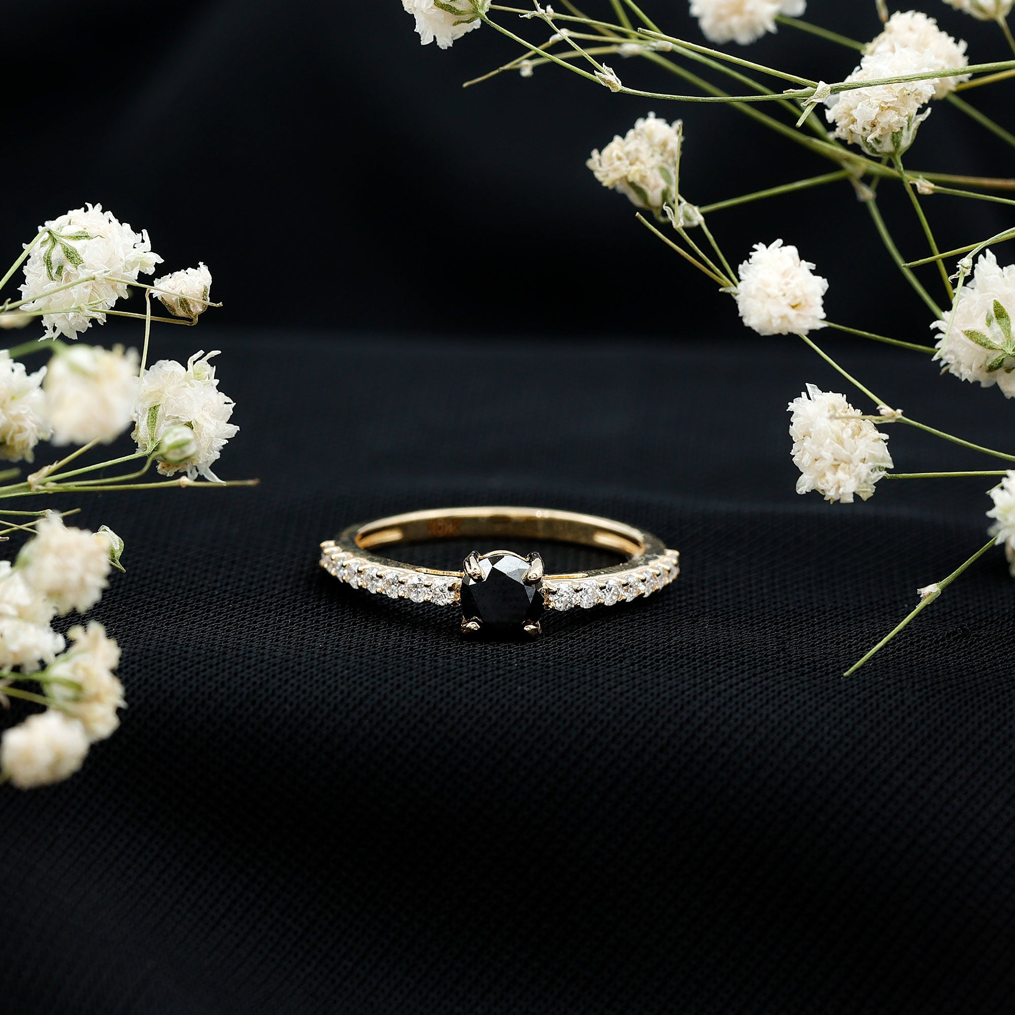 A Black Diamond Solitaire Ring is characterized by an enormous Single Stone of Bold Black Diamond that is the center of all attraction. The most versatile yet Simple Black Diamond Engagement Rings that you’ll get to witness are fashioned in this style. Precisely, the size of Black Diamond here is close to 6 MM or more which helps it capture much attention. For a classic appeal, the Black Diamond Solitaire is fashioned in Round Shape, while Marquise, Pear, or Princess Cut Black Diamond Rings speak to the more fancy sense of style. To lend an old-world charm to the ring, a Black Diamond fashioned in Cushion, Asscher, or Emerald Cut fits well.