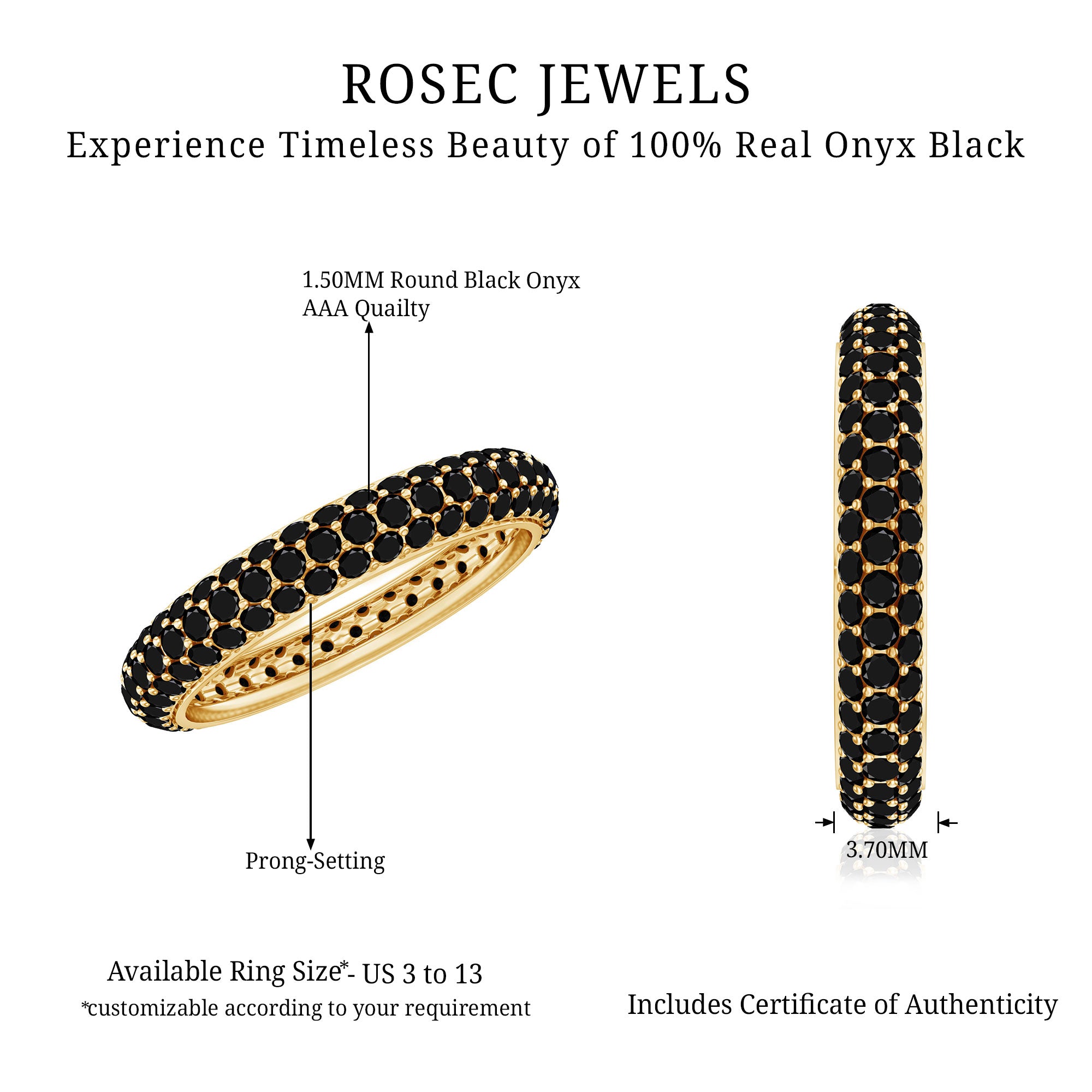 A Modern Classic, this Eternity Ring is paraded by a row of Black Onyx that are typically uniform in size. You’ll find no better style to flaunt your Black Onyx. But don’t take it to mean that it is all aesthetics. This style has been crafted in a way that carries an equally beautiful meaning behind it. The eternity pattern of stones commemorates the kind of love that lasts till the end of time (eternally). That’s why it also makes for an iconic Black Onyx Wedding Ring.