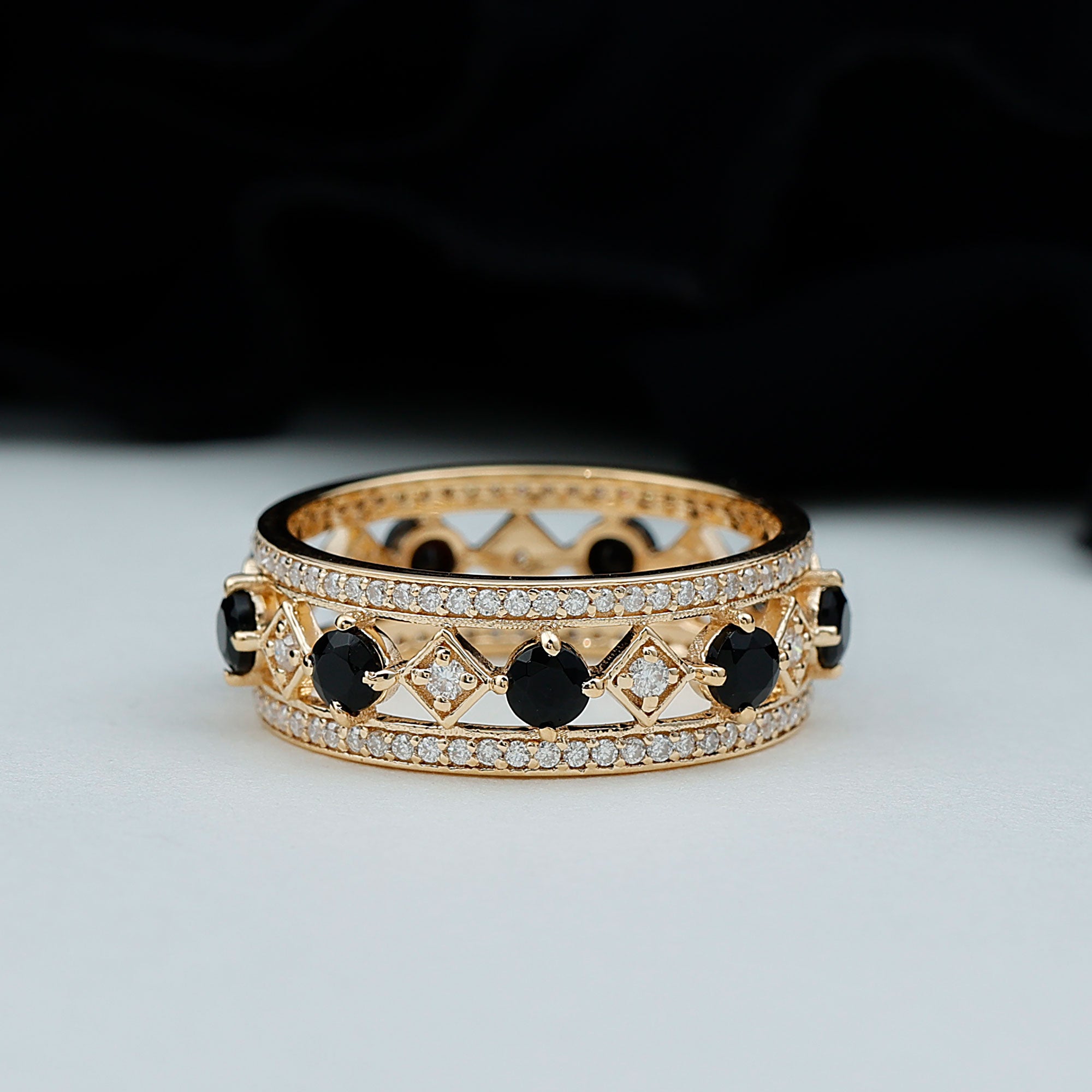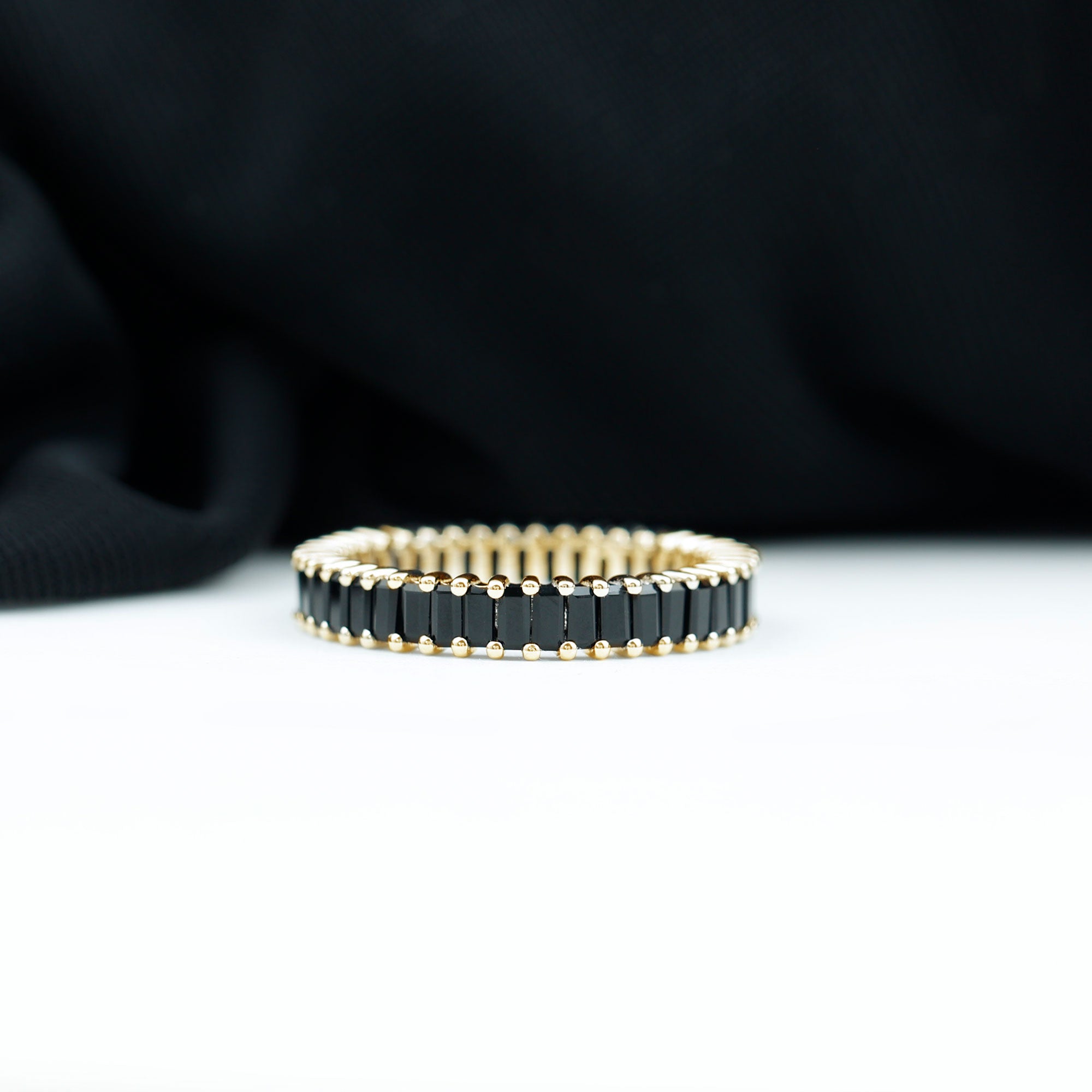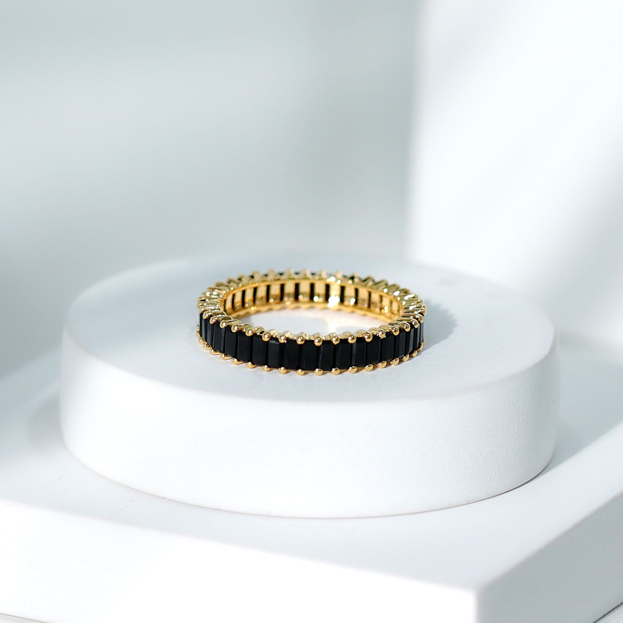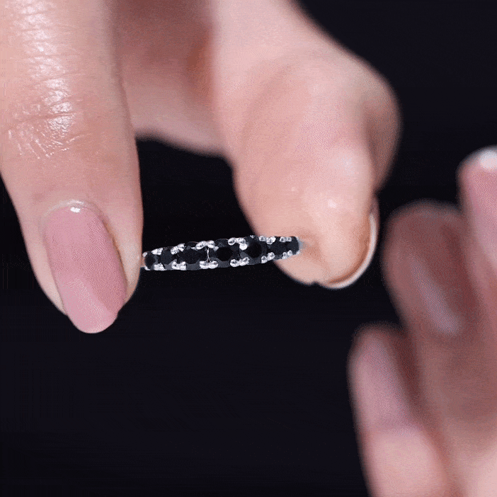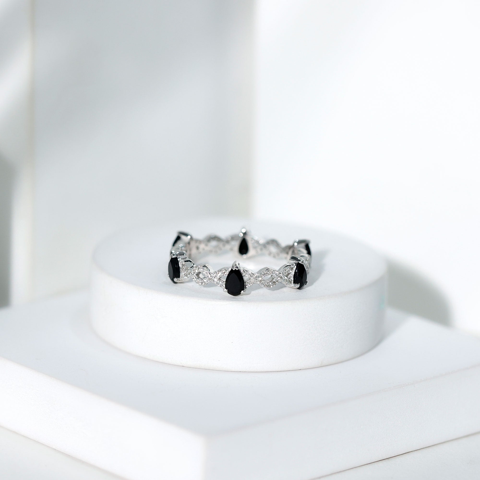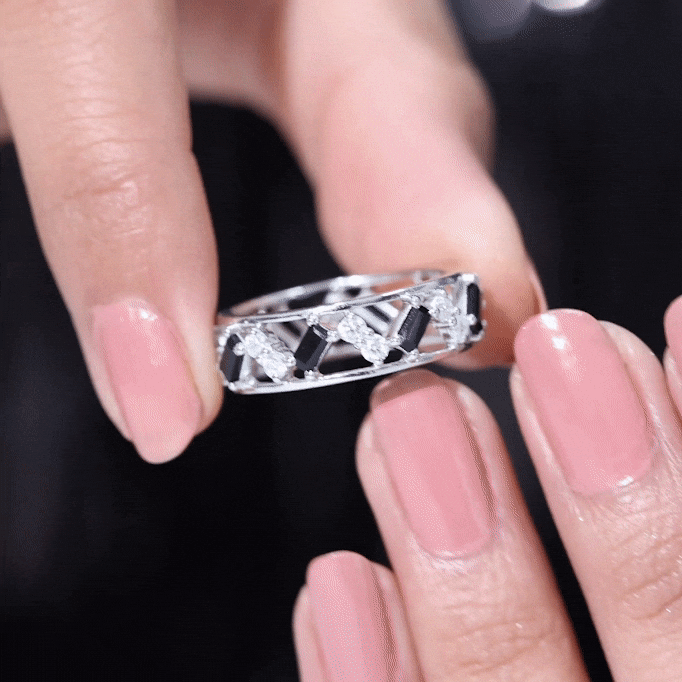 A Modern Classic, this Eternity Ring is paraded by a row of Black Onyx that are typically uniform in size. You’ll find no better style to flaunt your Black Onyx. But don’t take it to mean that it is all aesthetics. This style has been crafted in a way that carries an equally beautiful meaning behind it. The eternity pattern of stones commemorates the kind of love that lasts till the end of time (eternally). That’s why it also makes for an iconic Black Onyx Wedding Ring.