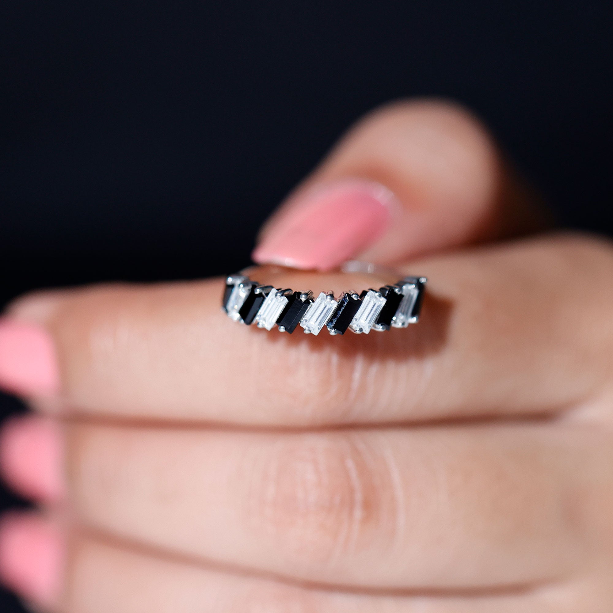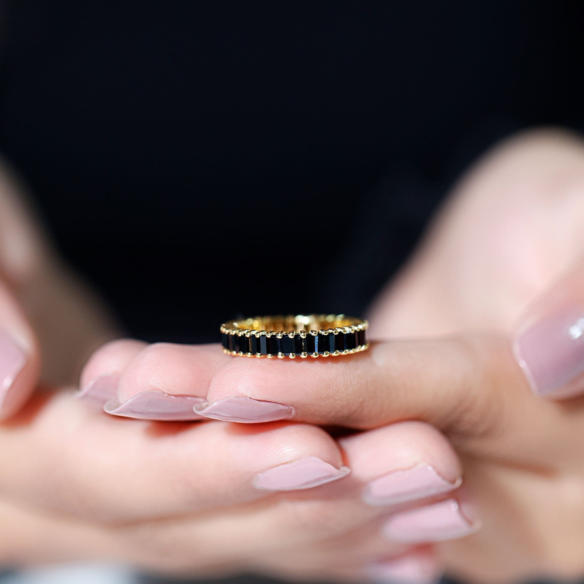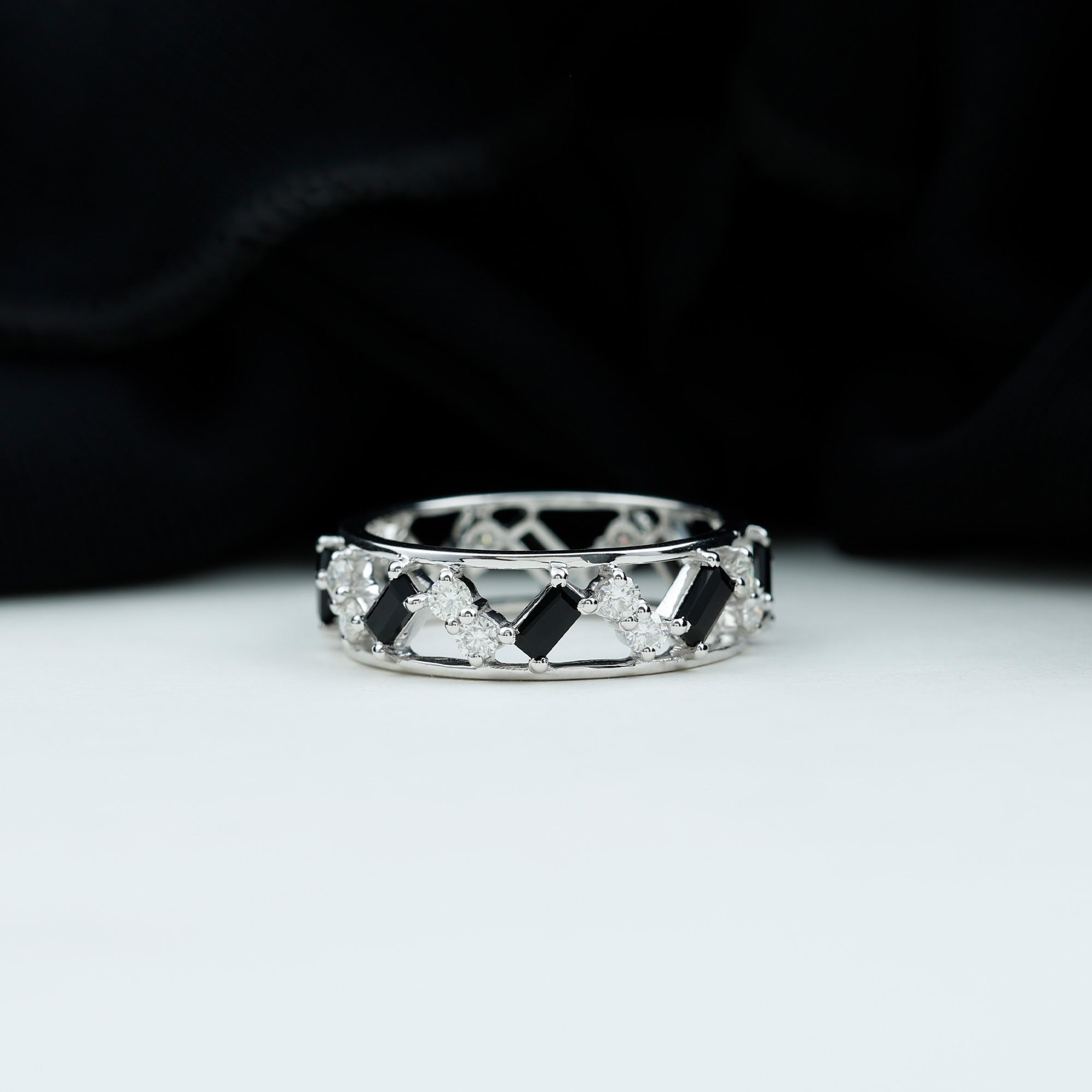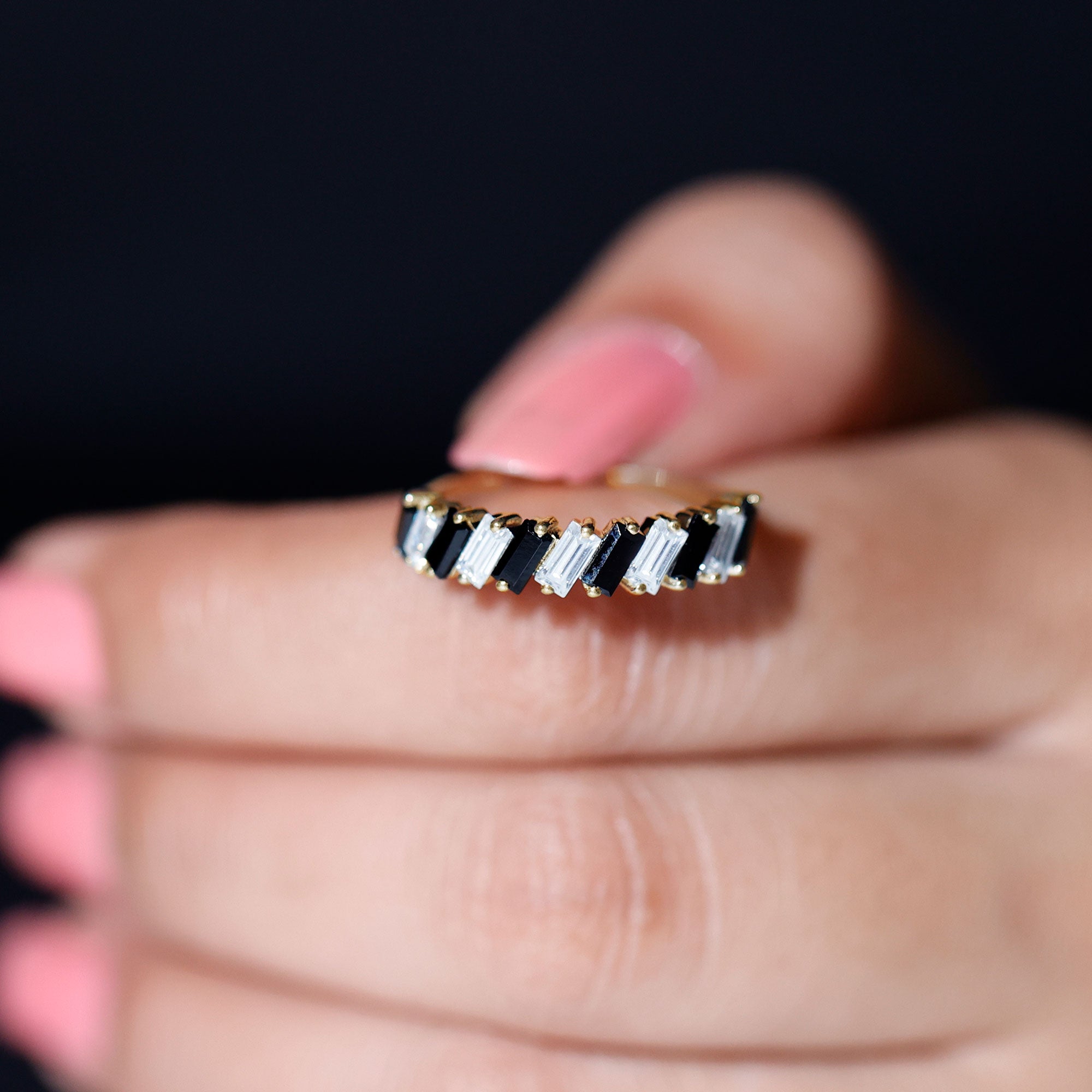 A Modern Classic, this Eternity Ring is paraded by a row of Black Onyx that are typically uniform in size. You’ll find no better style to flaunt your Black Onyx. But don’t take it to mean that it is all aesthetics. This style has been crafted in a way that carries an equally beautiful meaning behind it. The eternity pattern of stones commemorates the kind of love that lasts till the end of time (eternally). That’s why it also makes for an iconic Black Onyx Wedding Ring.