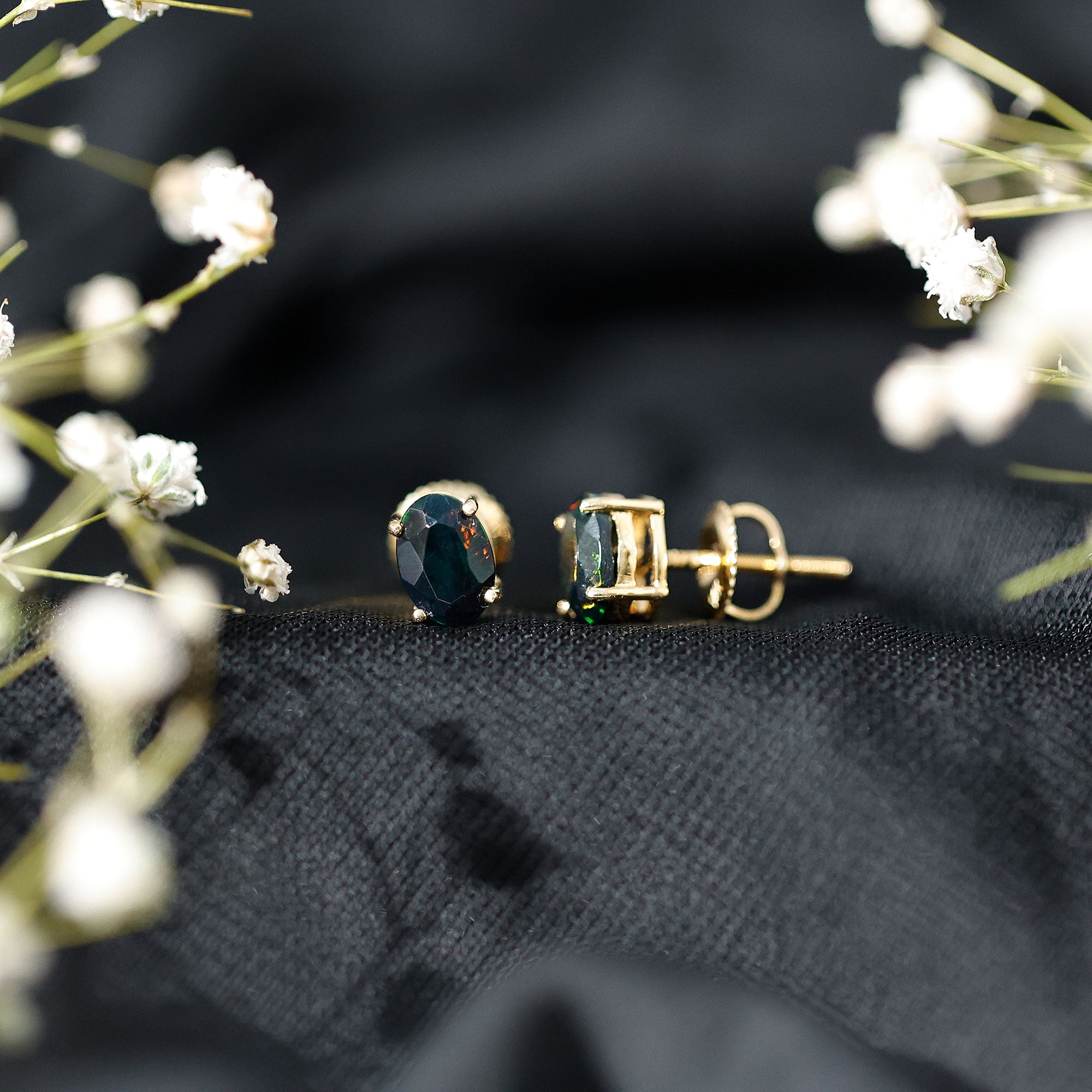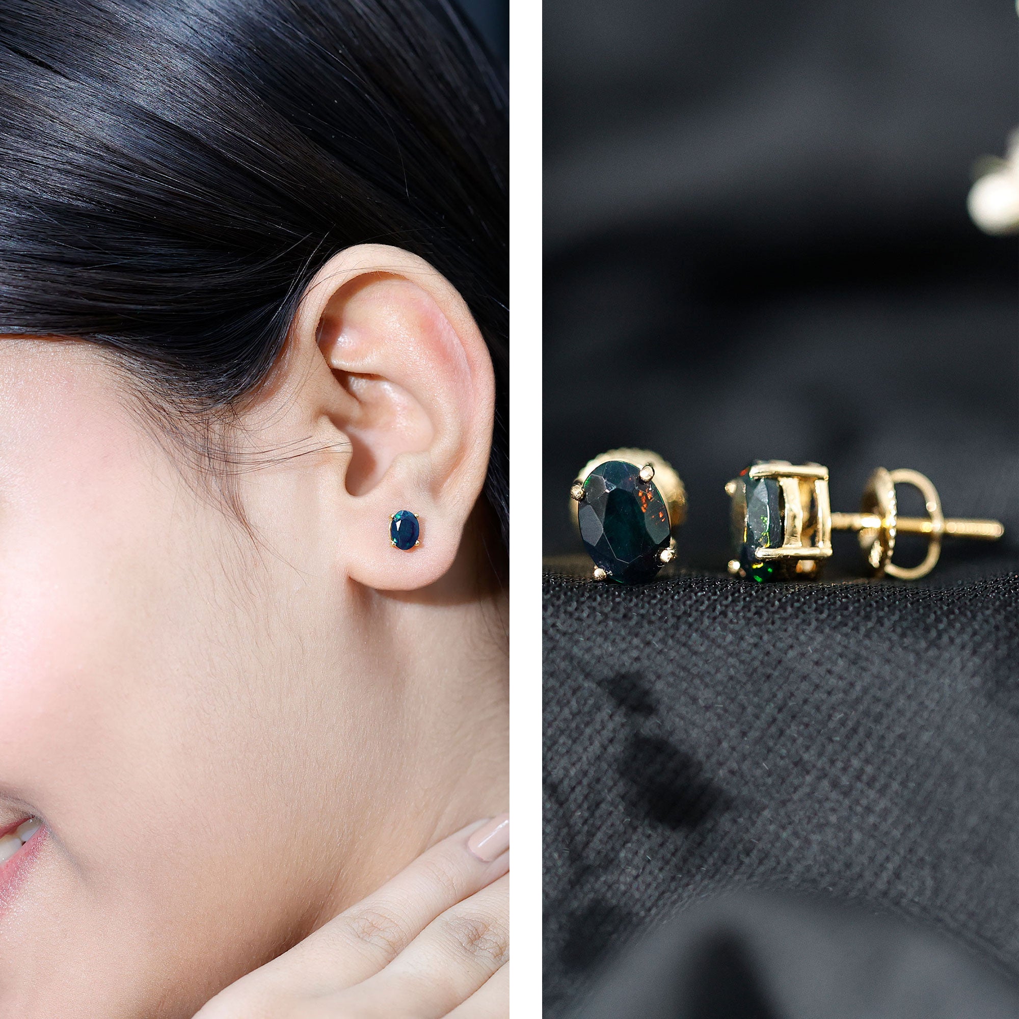 Black Opal earrings are the world's most elegant yet sophisticated, often cherished for their dark shades, creating a dazzling contrast with precious white gold or yellow gold metal. Black Opal, a member of the semi-precious gemstone family, distinguishes itself with its deep body tone ranging from intense grey to jet black. Its allure is further heightened by its captivating play of colors. Additionally, it holds special significance as the birthstone for October. The different earpieces crafted from black opal gemstone is a versatile accessory, whether you go for a simple solitaire design or sparkling halo black opal earrings, we have earpieces for every taste and occasion.