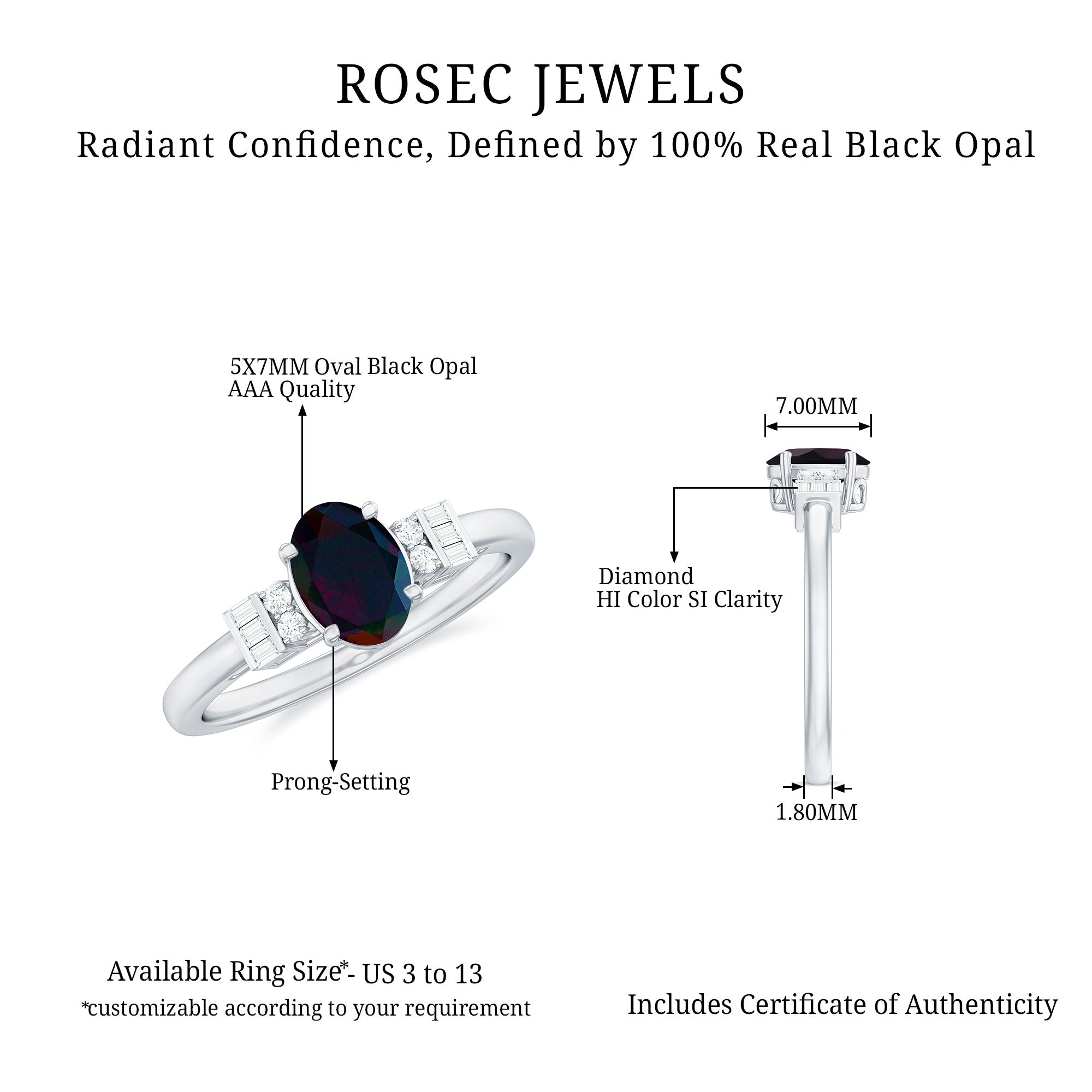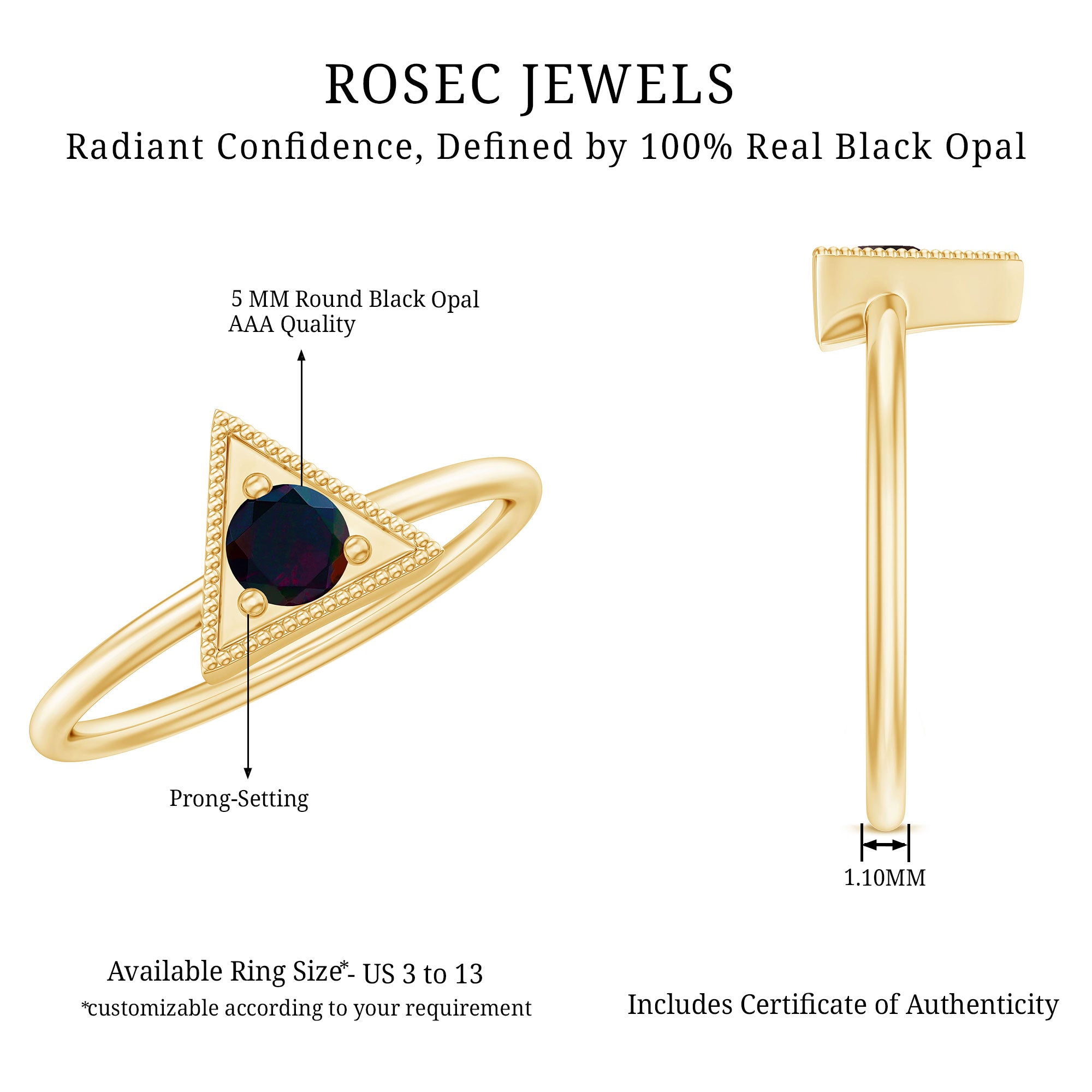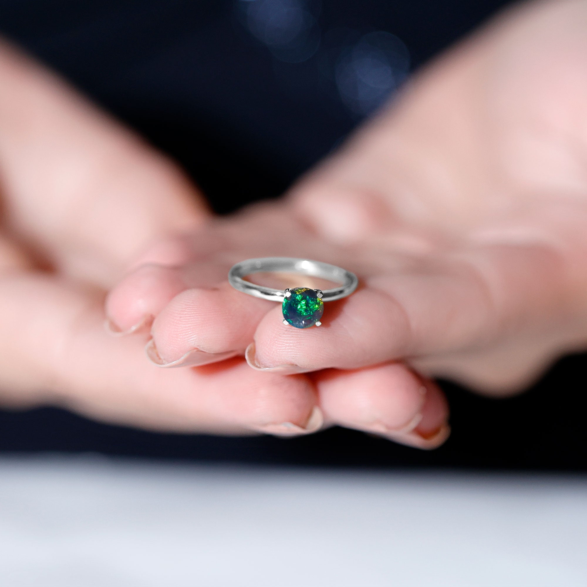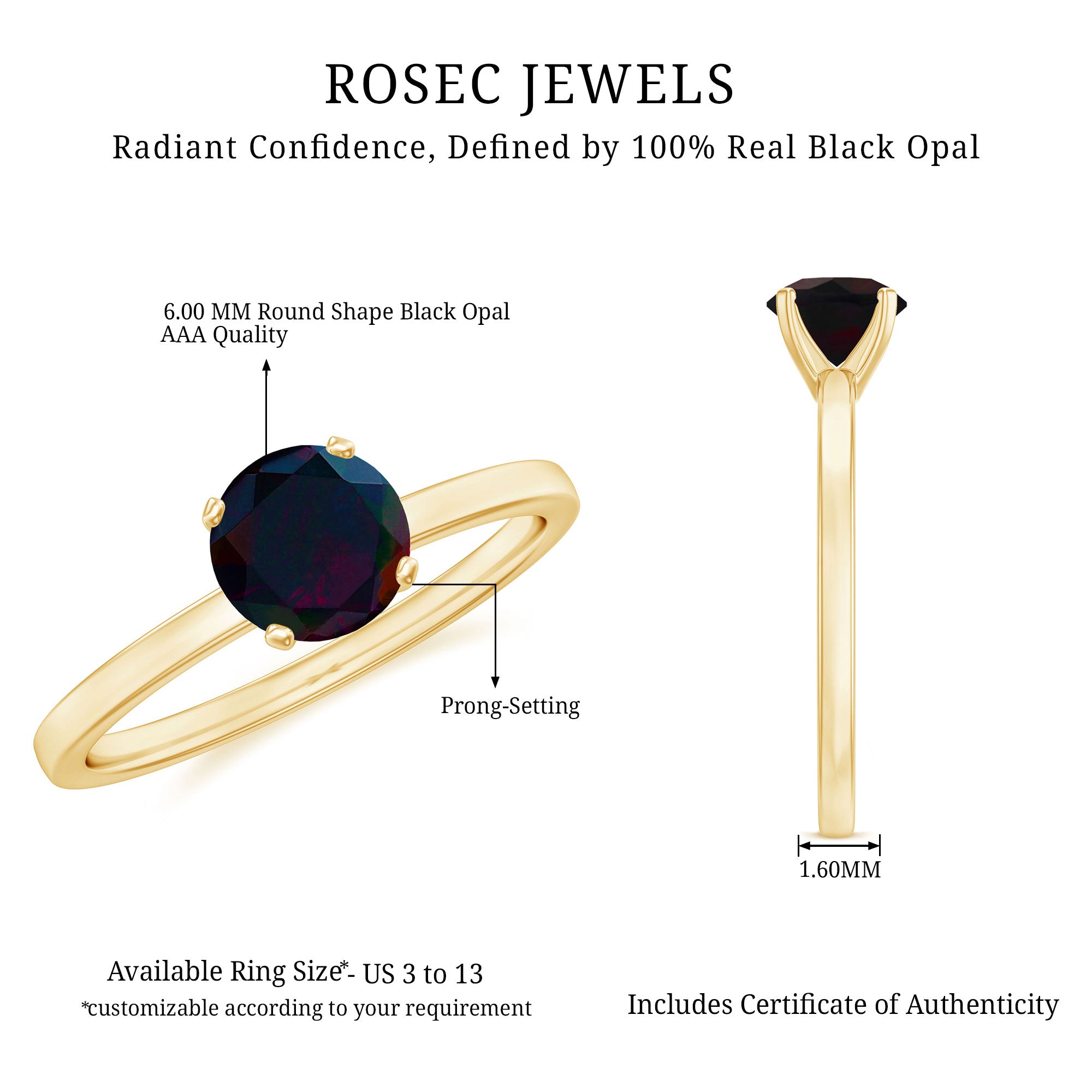 Black opal rings are visually appealing, due to the striking play of colors of black center stone. The mesmerizing effect created by the diffraction of light on the dark black opal body enhances the brilliance of rainbow colors.