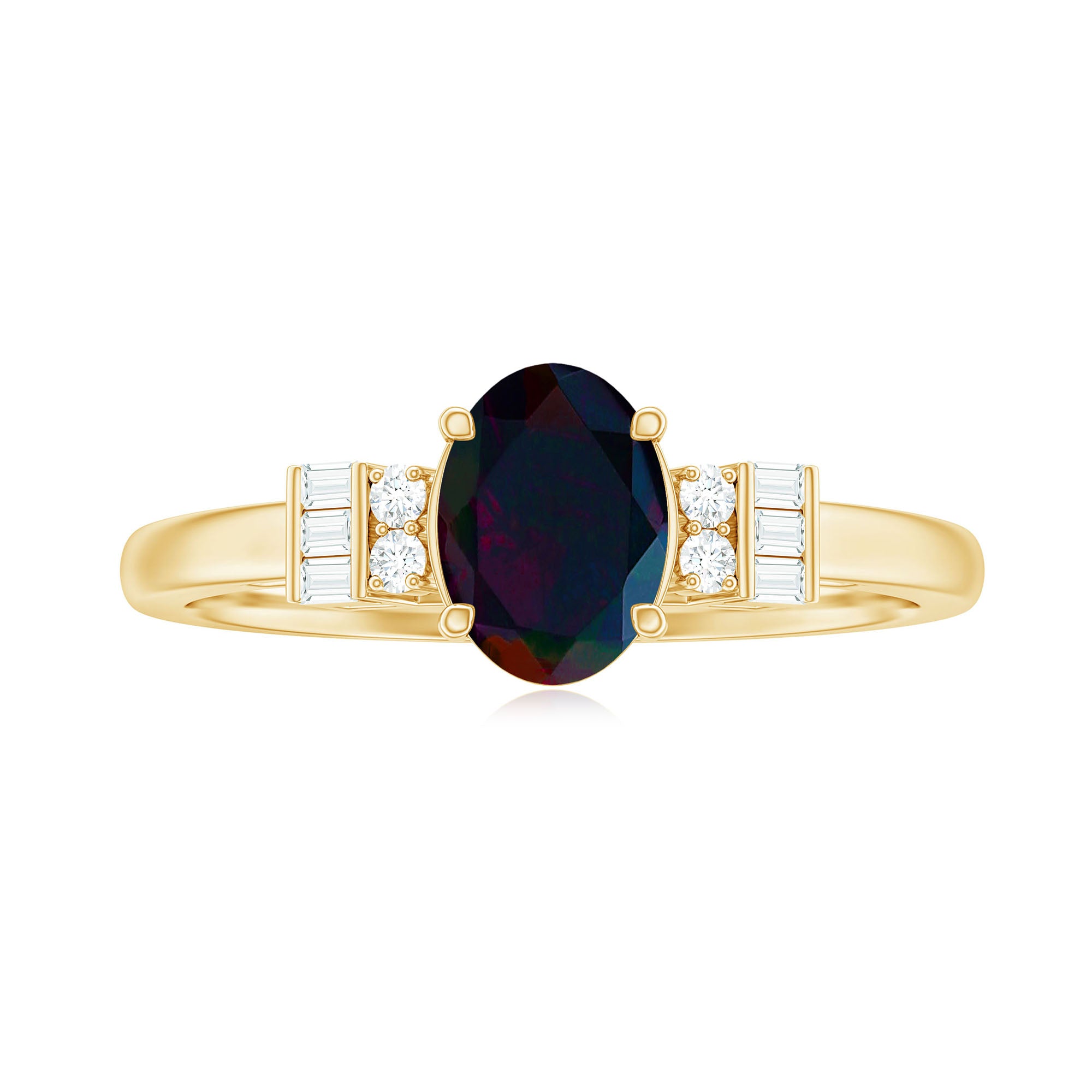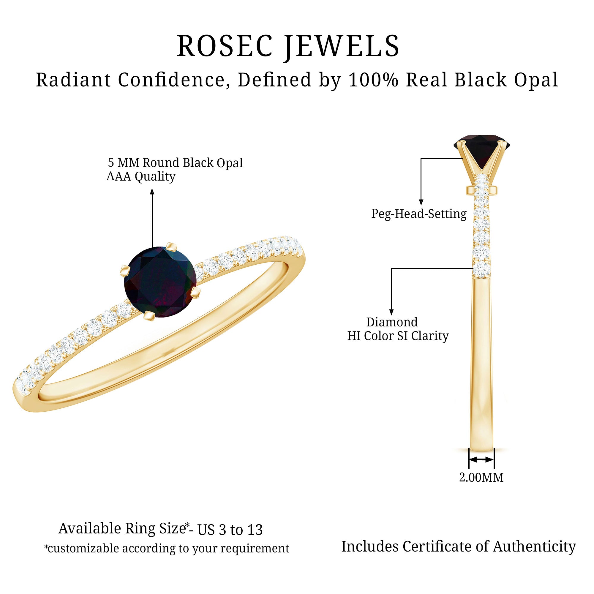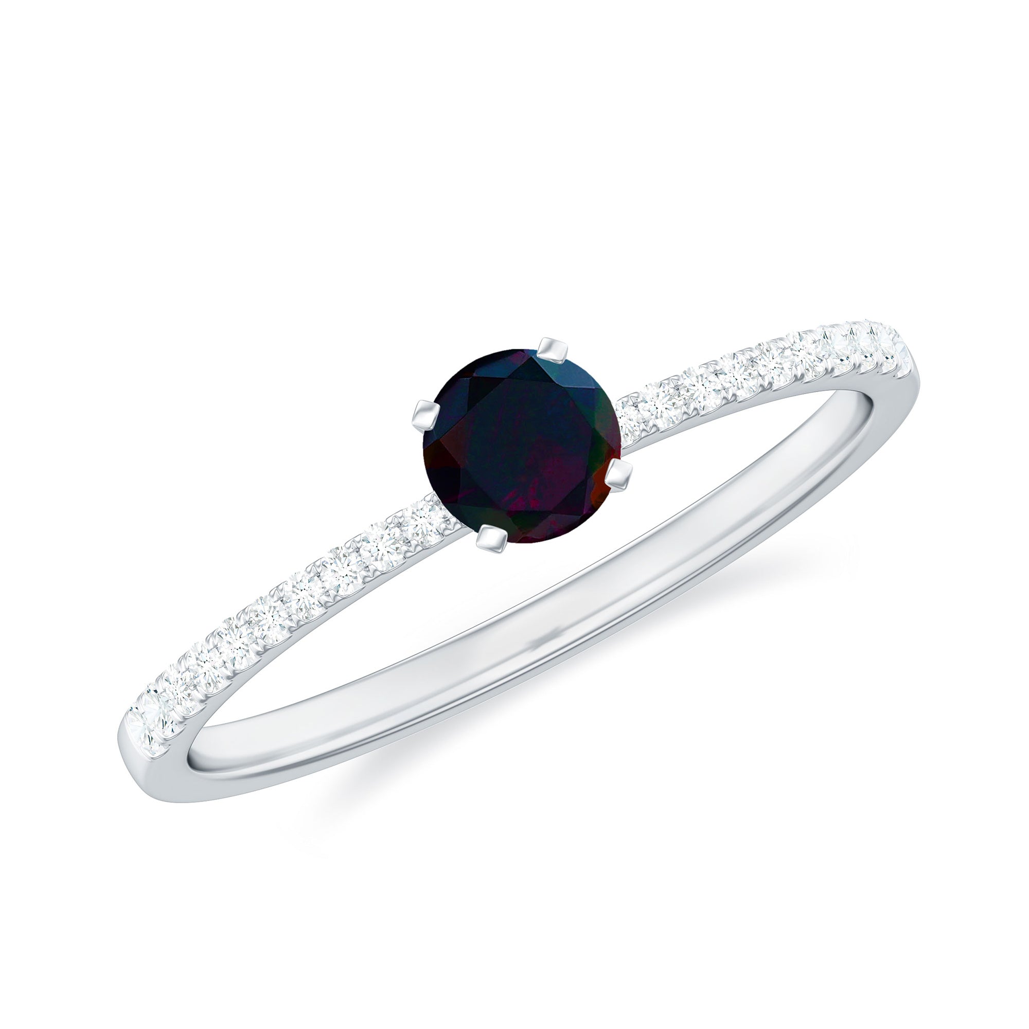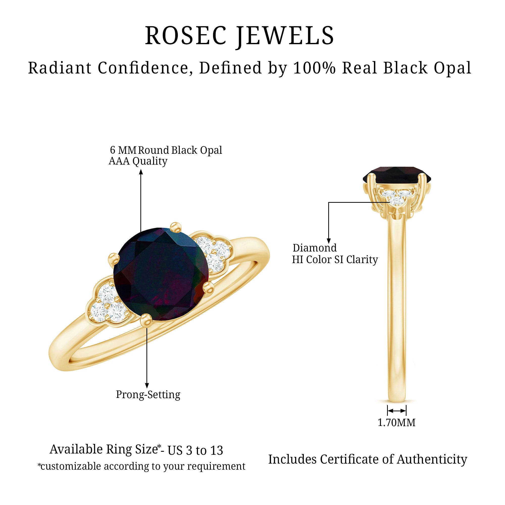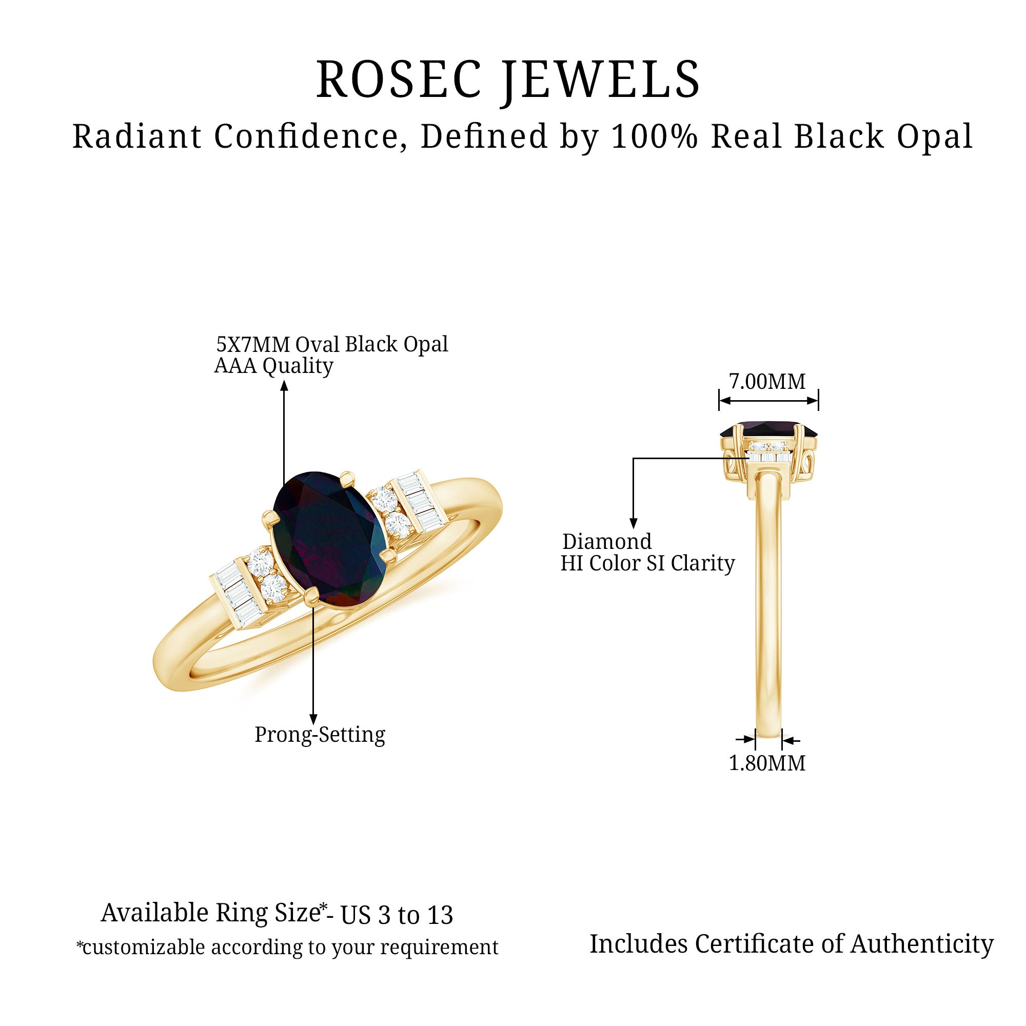 Black opal rings are visually appealing, due to the striking play of colors of black center stone. The mesmerizing effect created by the diffraction of light on the dark black opal body enhances the brilliance of rainbow colors.