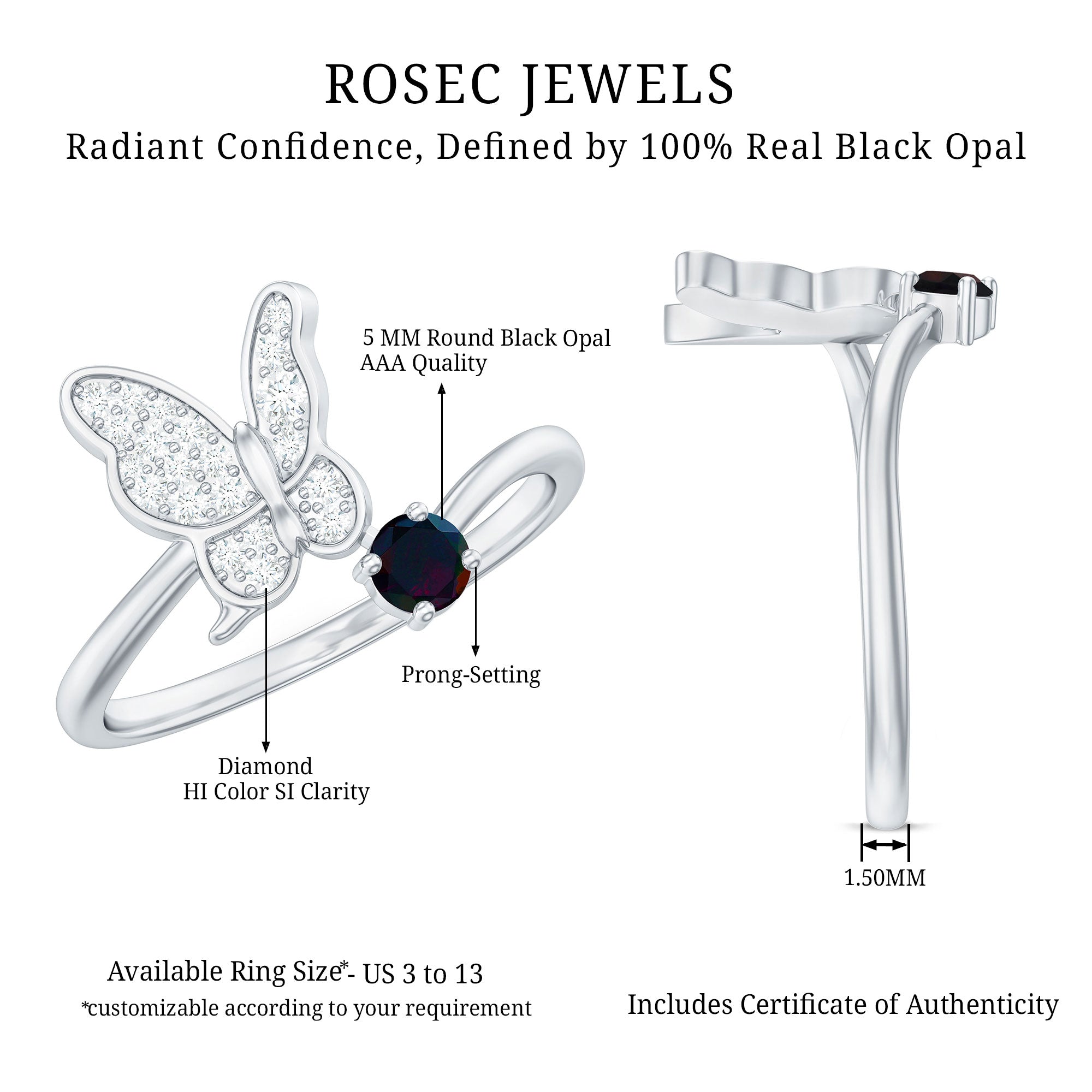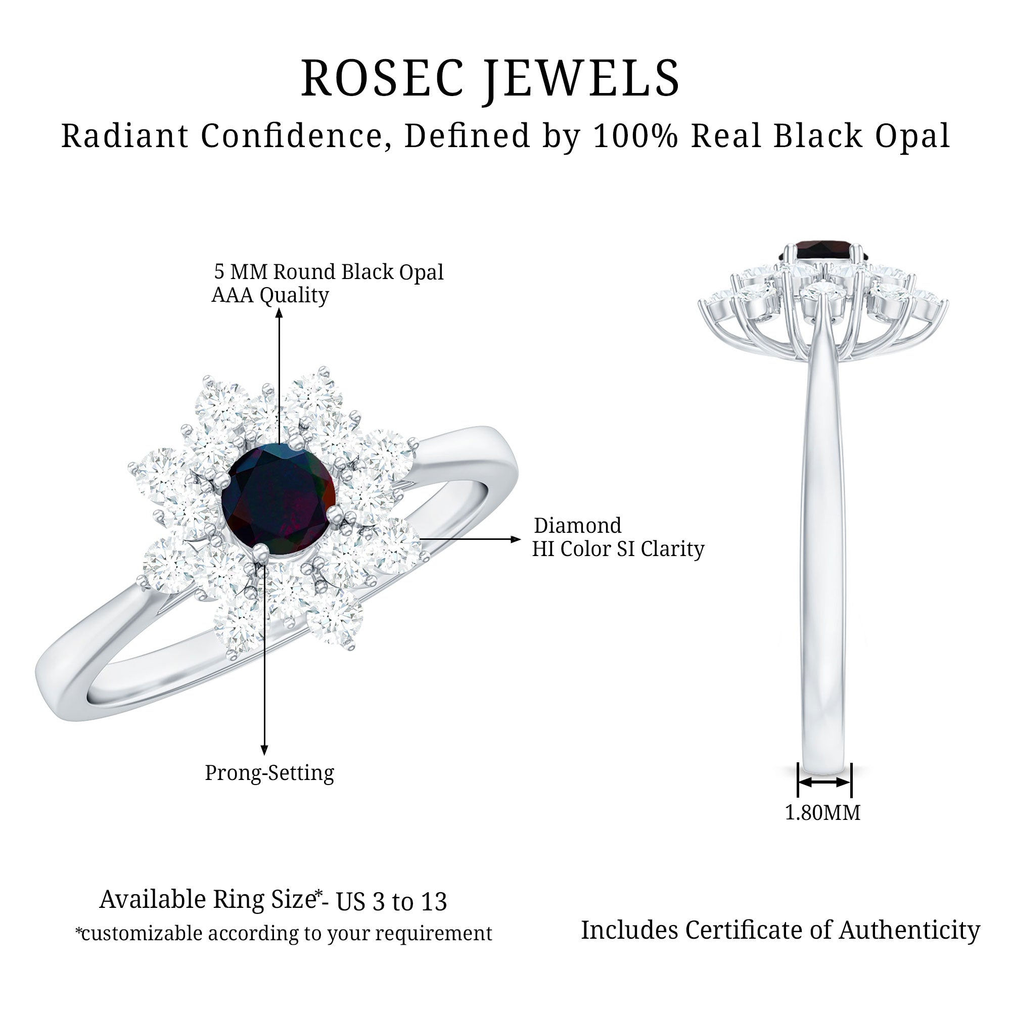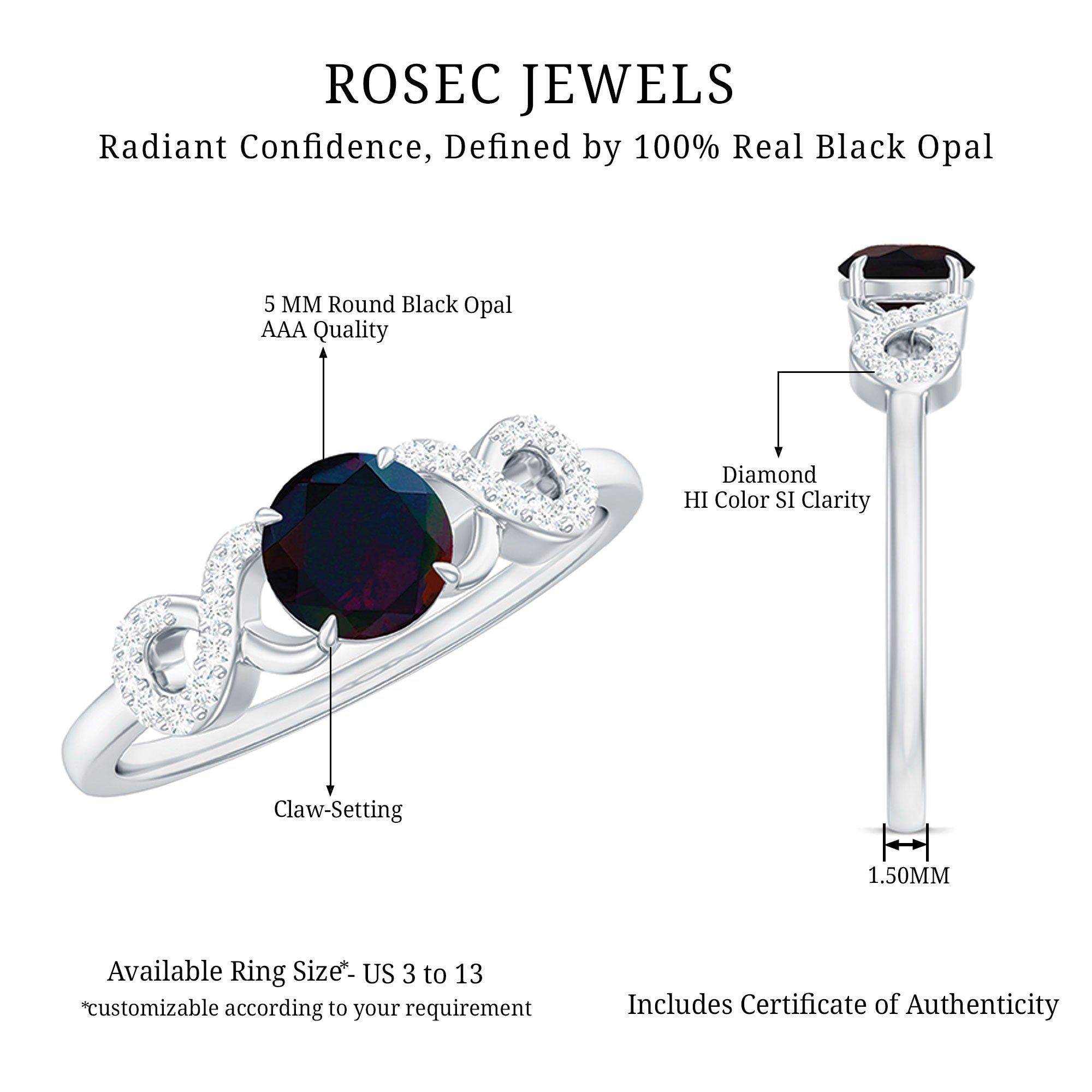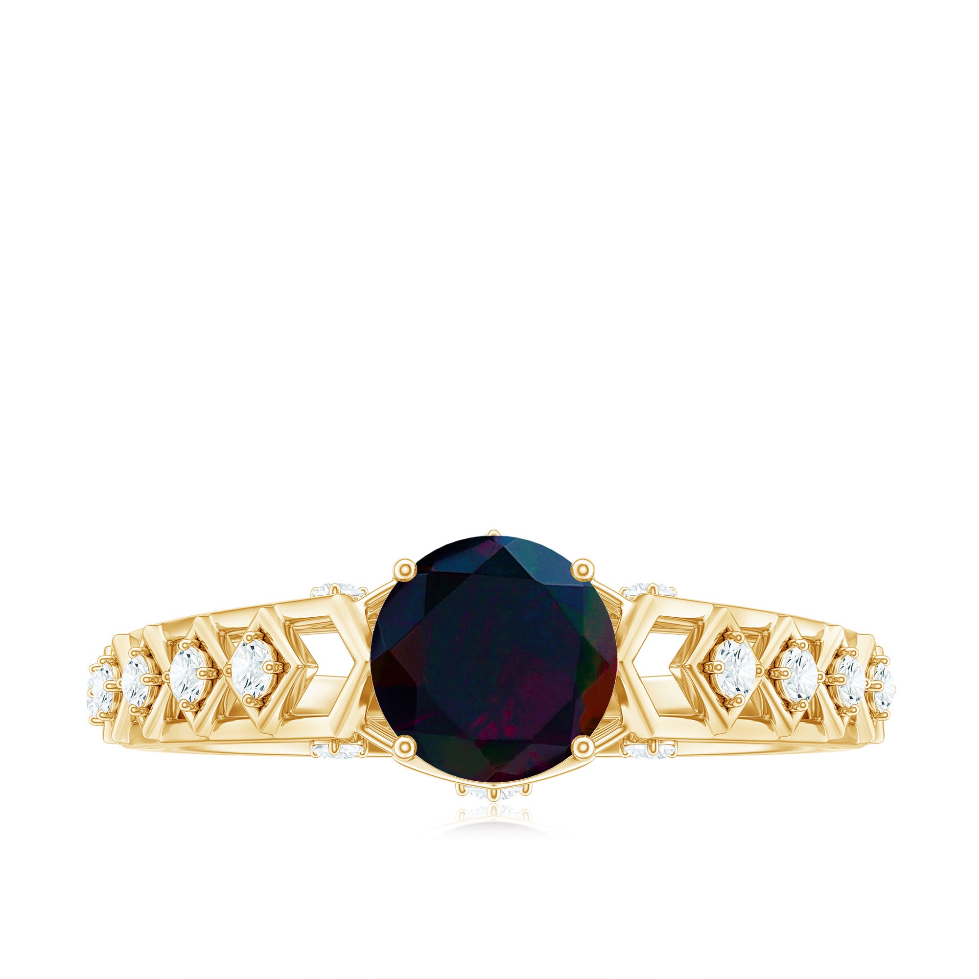 Black opal rings are visually appealing, due to the striking play of colors of black center stone. The mesmerizing effect created by the diffraction of light on the dark black opal body enhances the brilliance of rainbow colors.