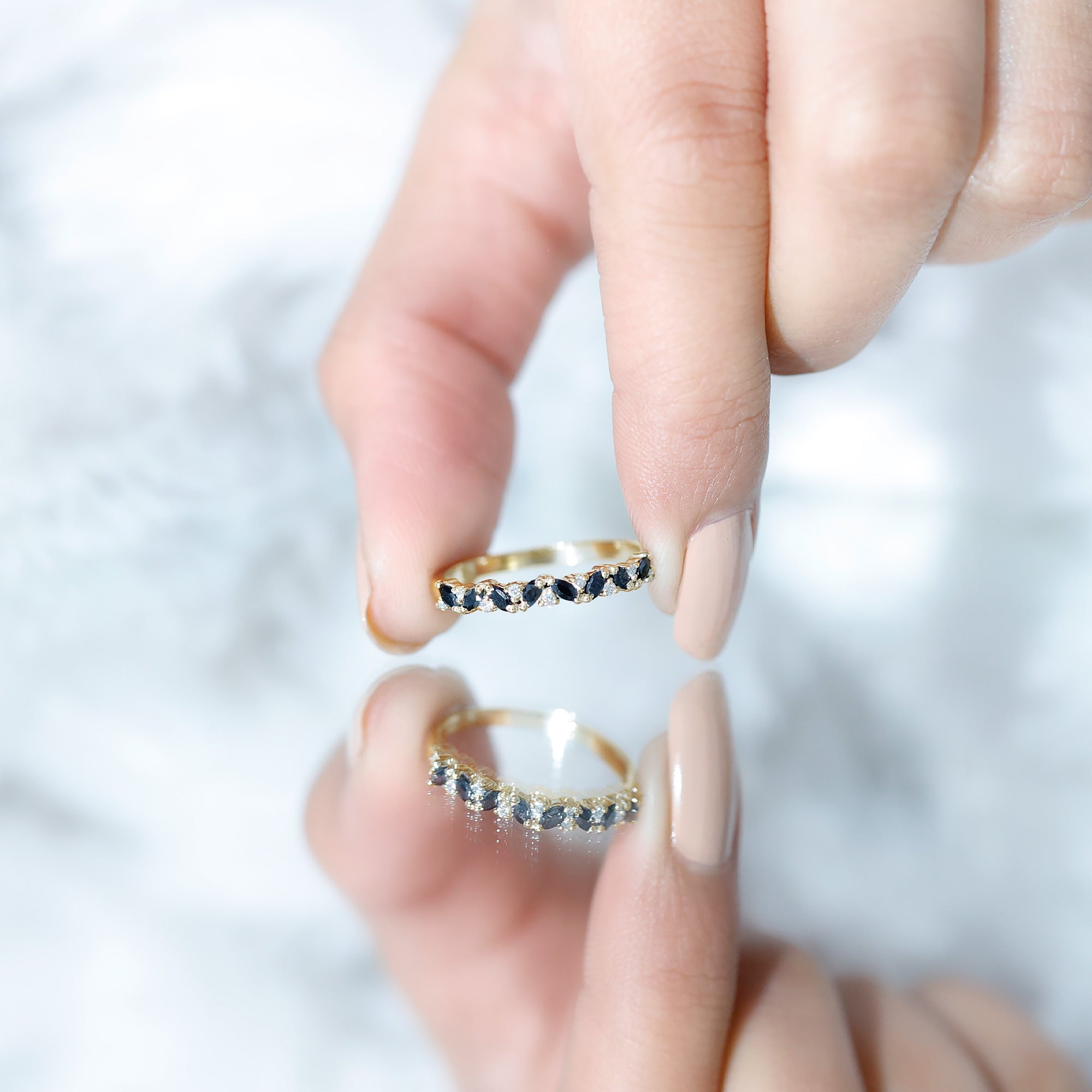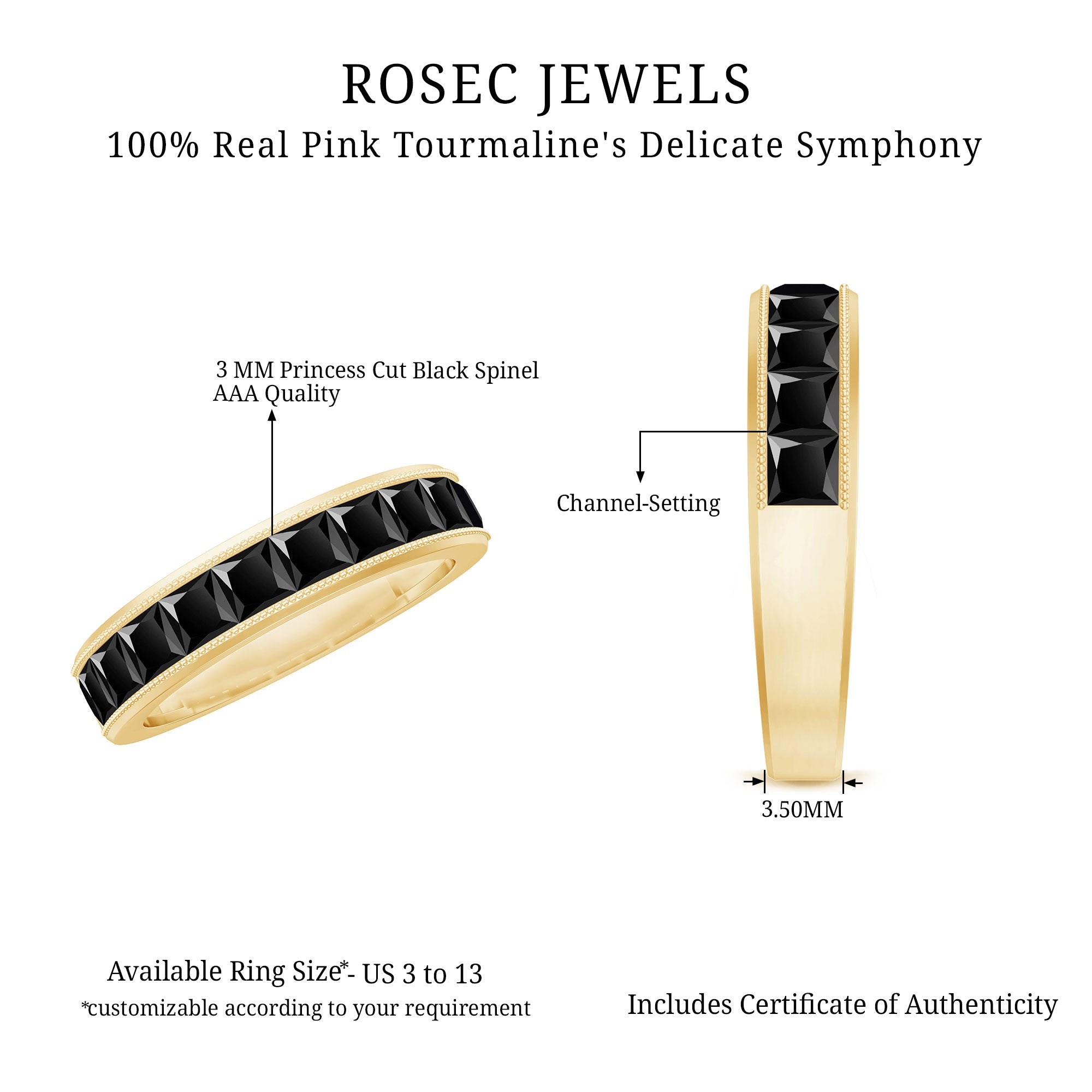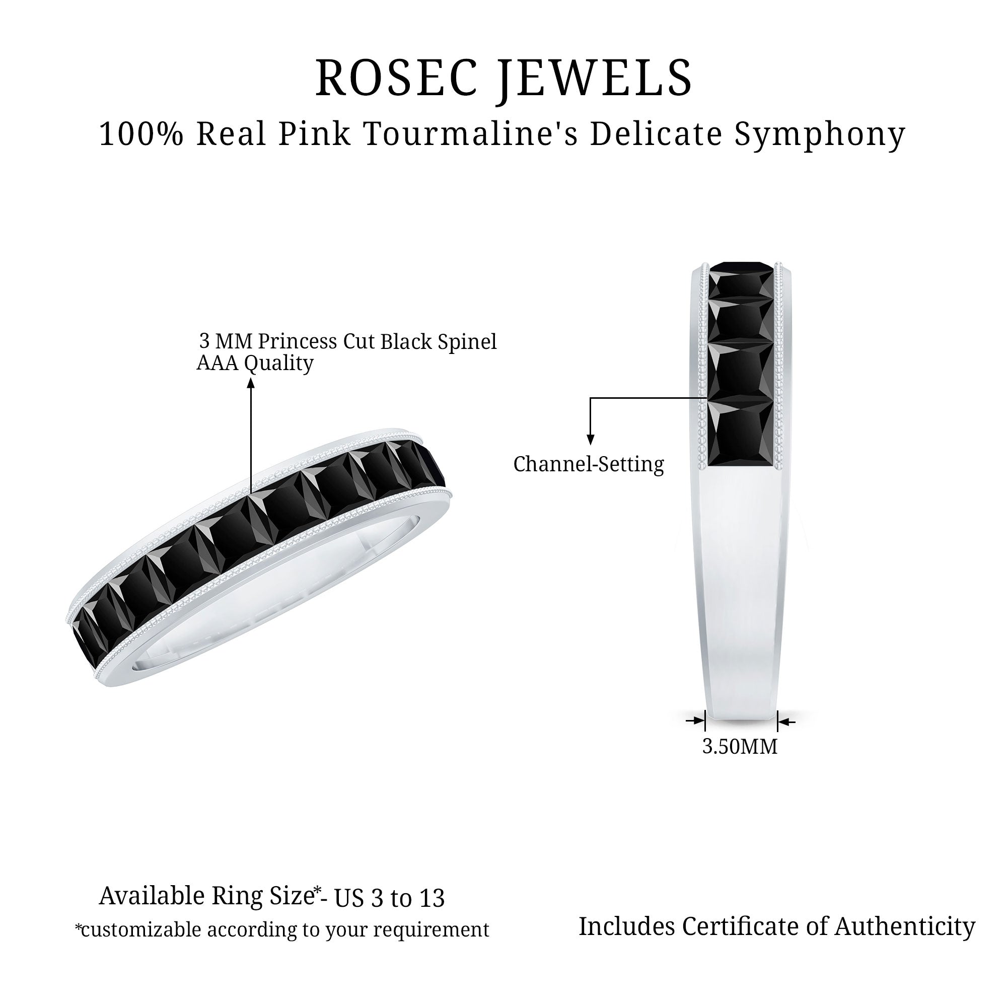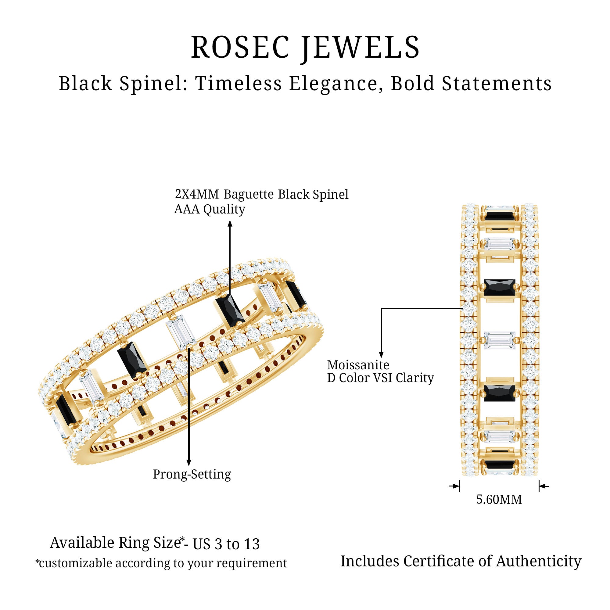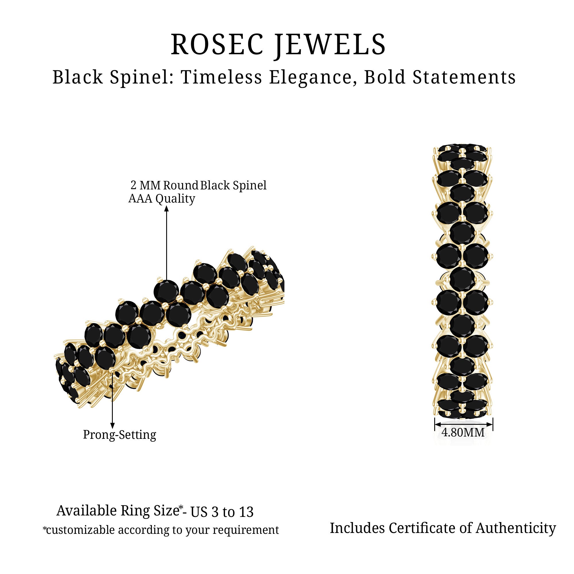 Black Spinel registers a fairly durable hardness rating of 8 out of 10 on Mohs Scale. That makes it highly resistant to regular wear and tear. So be it a Black Spinel Eternity Ring or the one fashioned in the Classic Solitaire Style, you can wear it everyday.