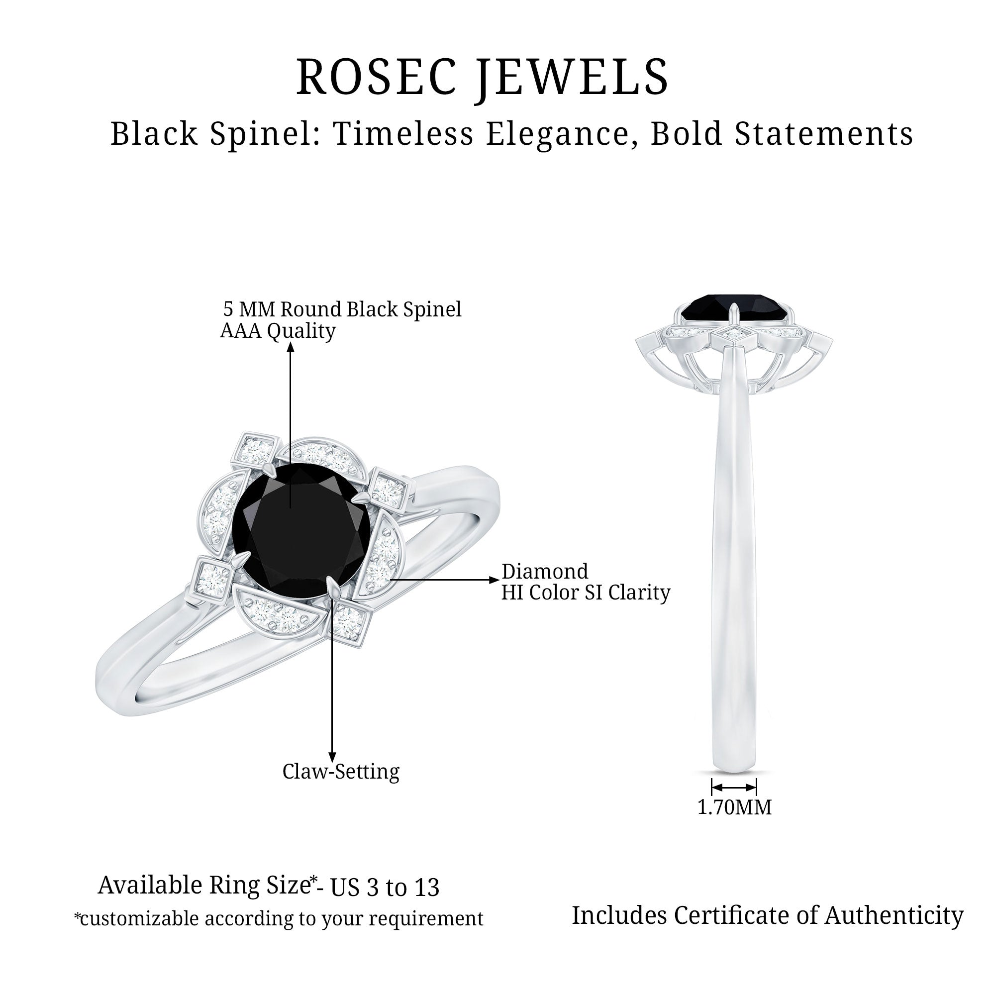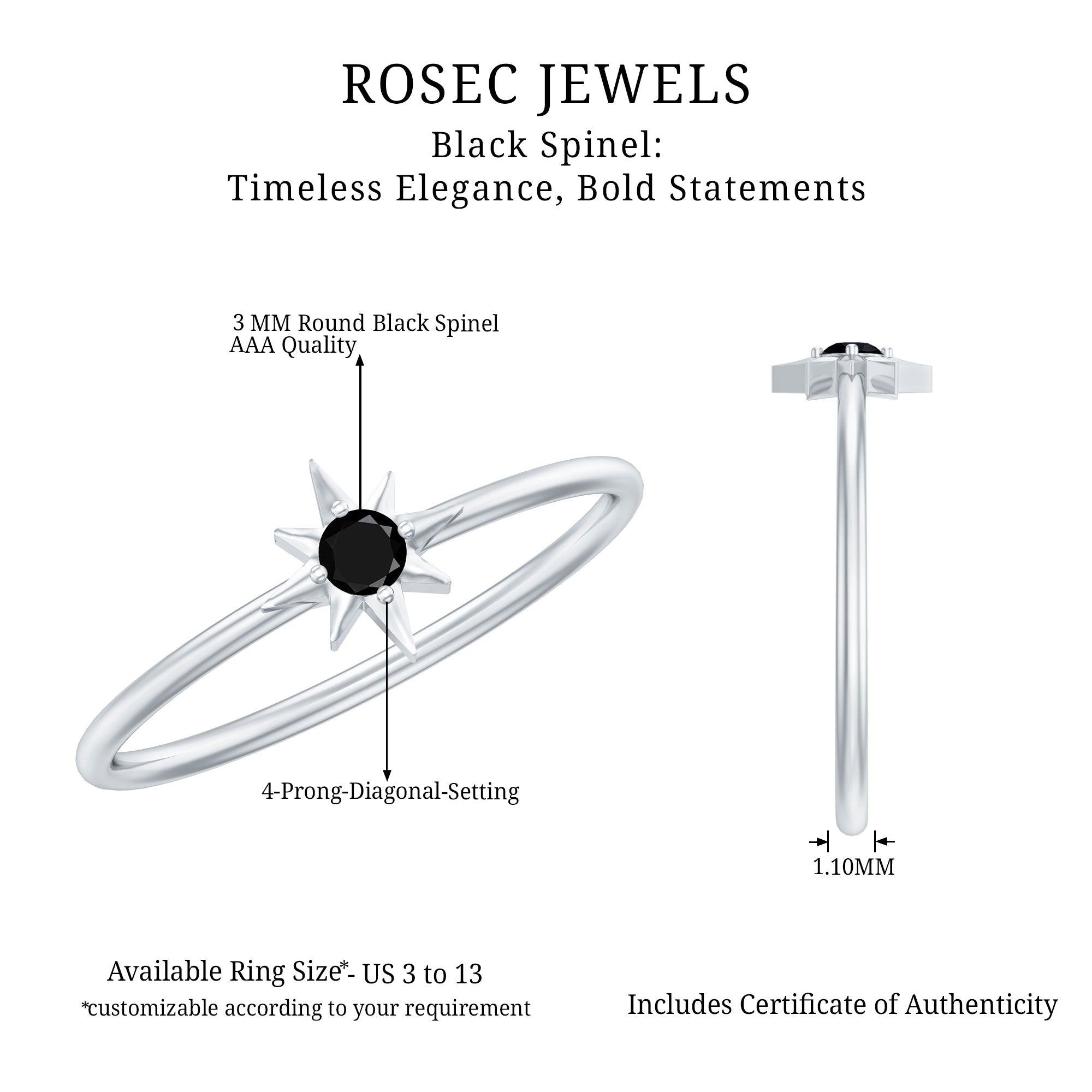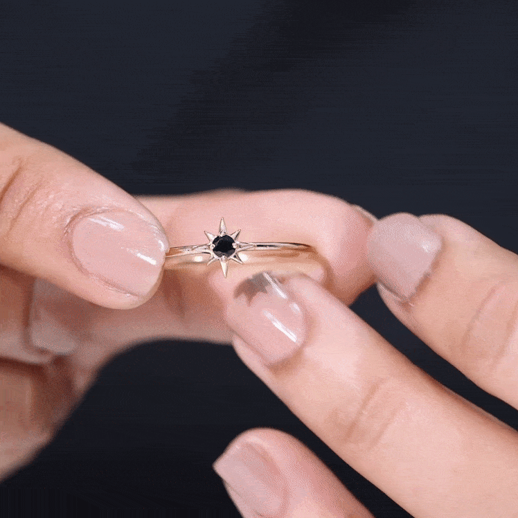 A Black Spinel Promise Ring might insinuate a specific meaning but it isn’t confined to a specific style. It can range from a Simple Solitaire Ring that exudes an understated aesthetic with a size of 4 MM or even less. Or for an exquisite visual appeal, be ornately detailed with nature-inspired designs, flower, and infinity motifs, or sparkling accents of Diamond/Moissanite. Behind that, it reflects upon the promise of eternal commitment (that usually precedes an engagement).