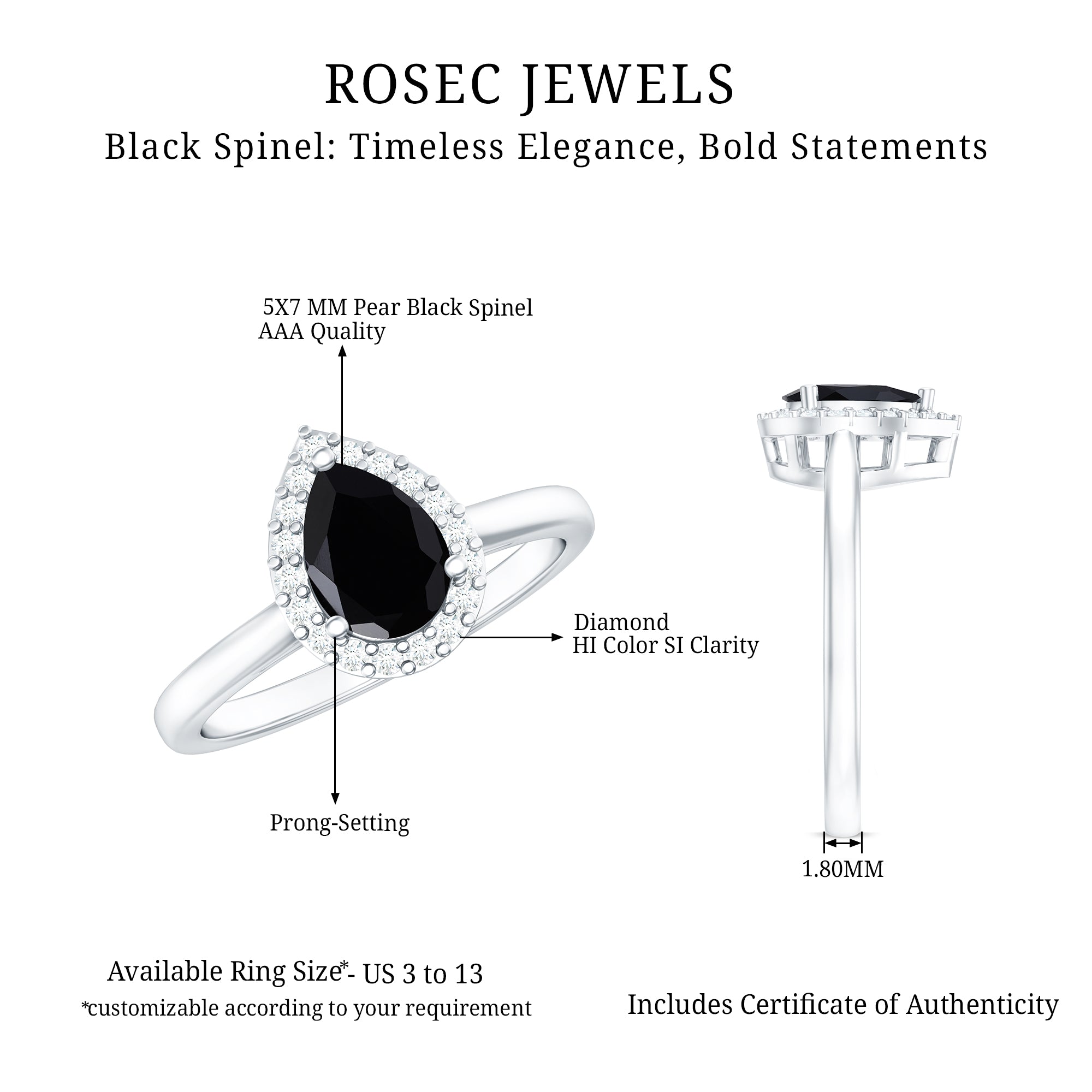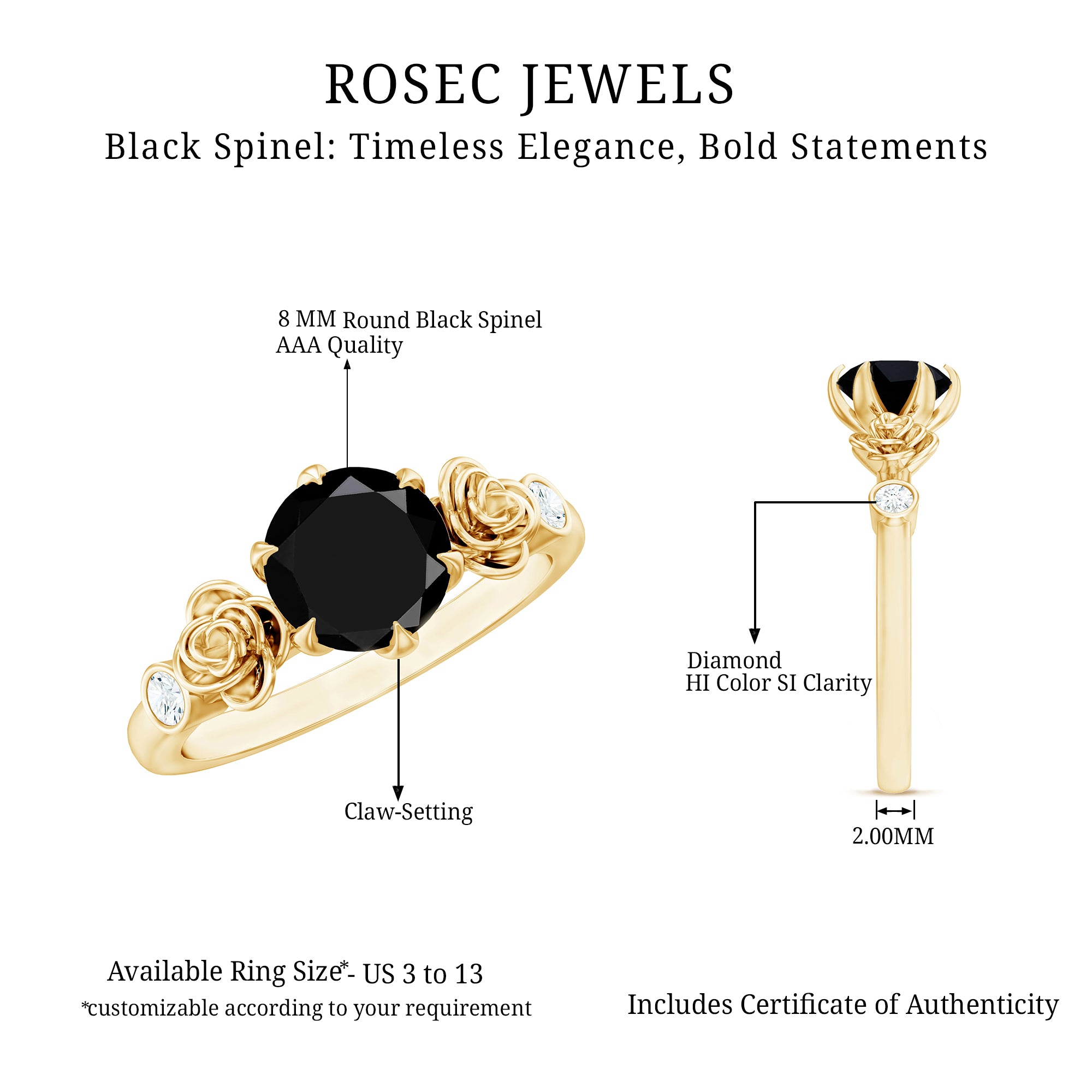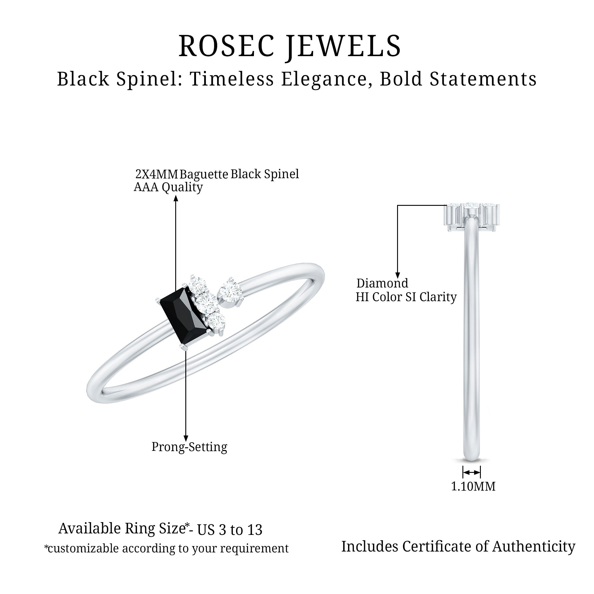 A Black Spinel Promise Ring might insinuate a specific meaning but it isn’t confined to a specific style. It can range from a Simple Solitaire Ring that exudes an understated aesthetic with a size of 4 MM or even less. Or for an exquisite visual appeal, be ornately detailed with nature-inspired designs, flower, and infinity motifs, or sparkling accents of Diamond/Moissanite. Behind that, it reflects upon the promise of eternal commitment (that usually precedes an engagement).