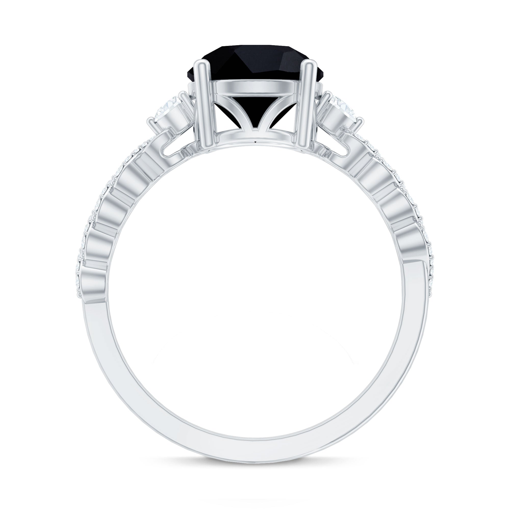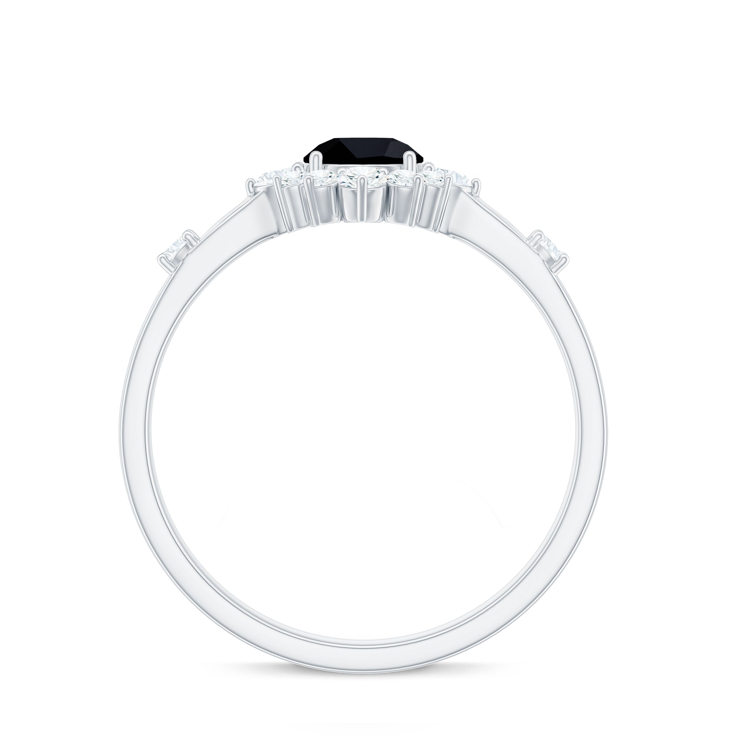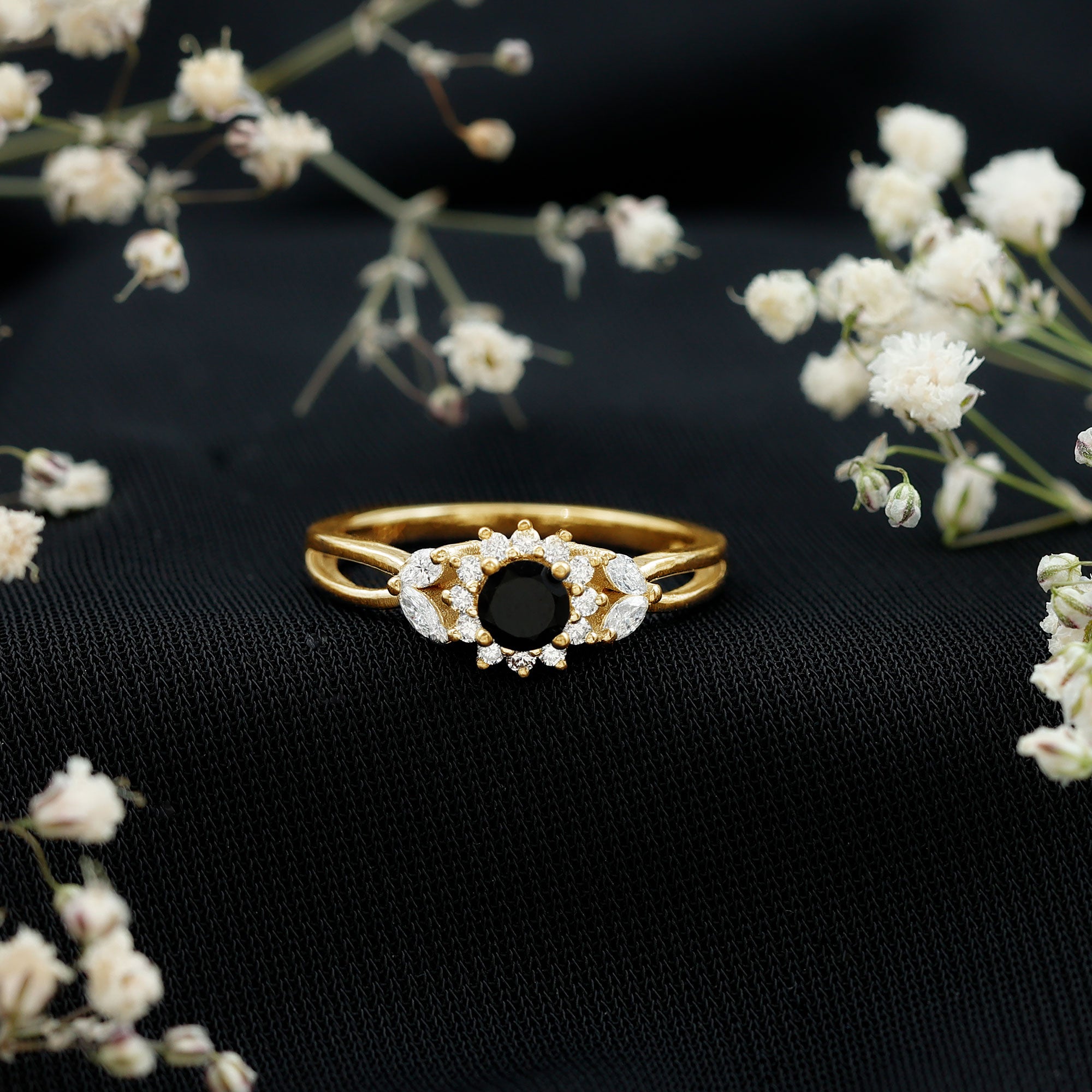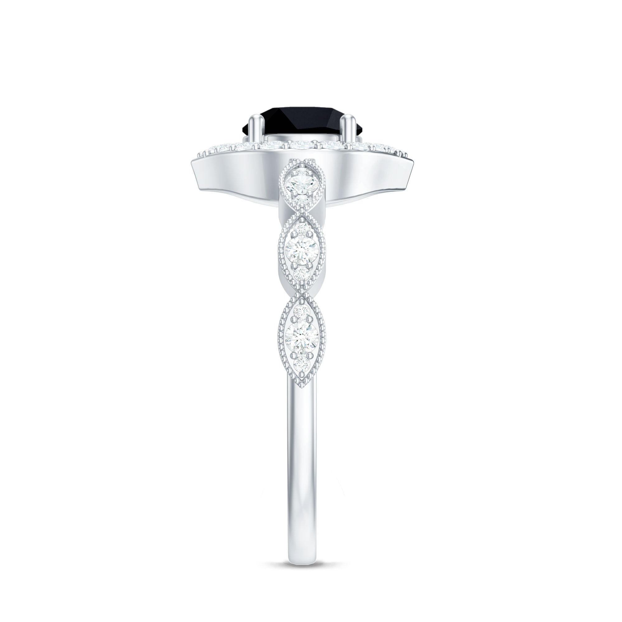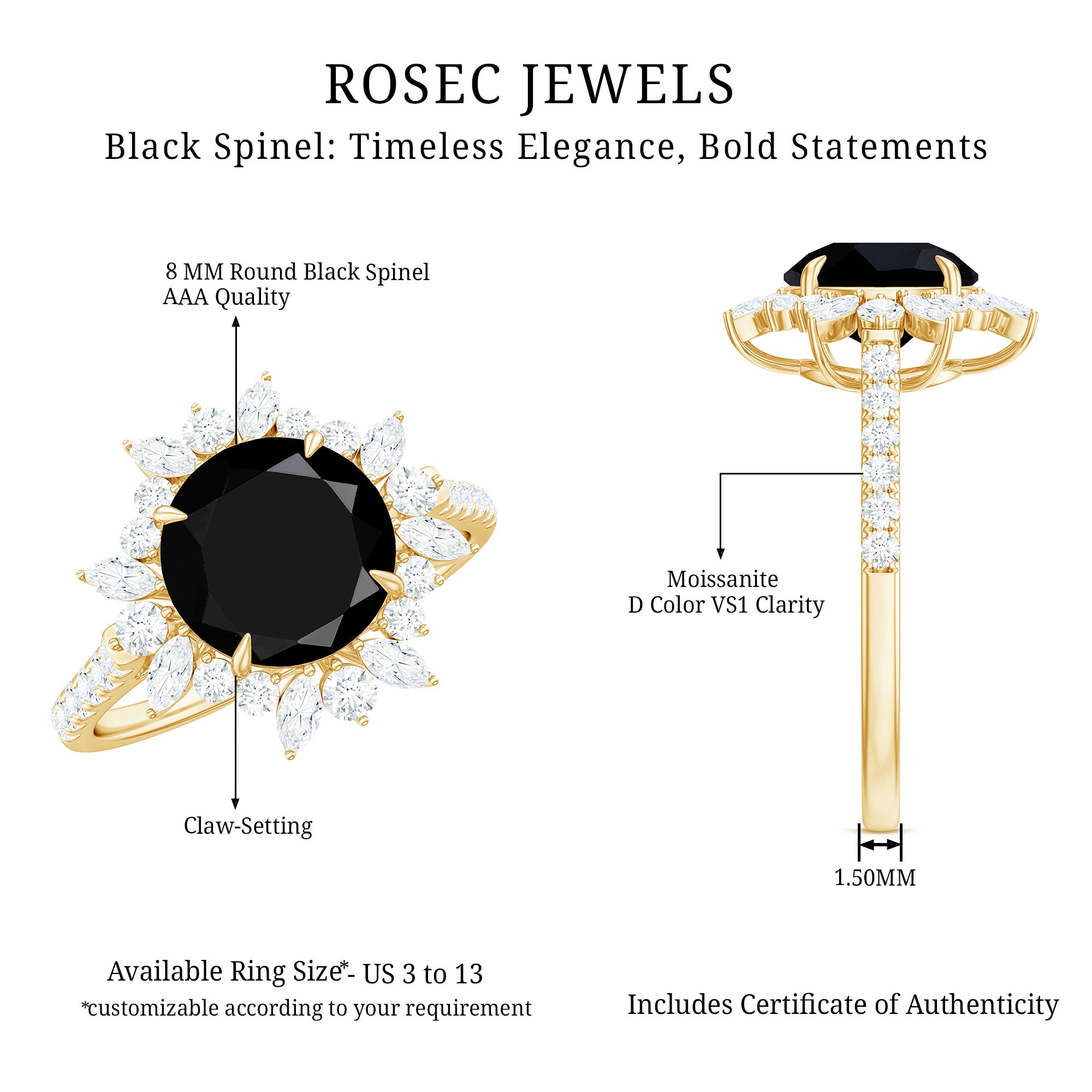 Lending an interesting visual appeal to the Black Spinel Solitaire Ring, a Halo encircles the Black Spinel with a parade of diamond/moissanite. The best part about a Halo is that it rewards more personality as well as an illusion of a larger-looking size to your Black Spinel. So, it is a unique blend of classic and flashy. That makes it another popular choice of the Black Spinel Engagement Ring.