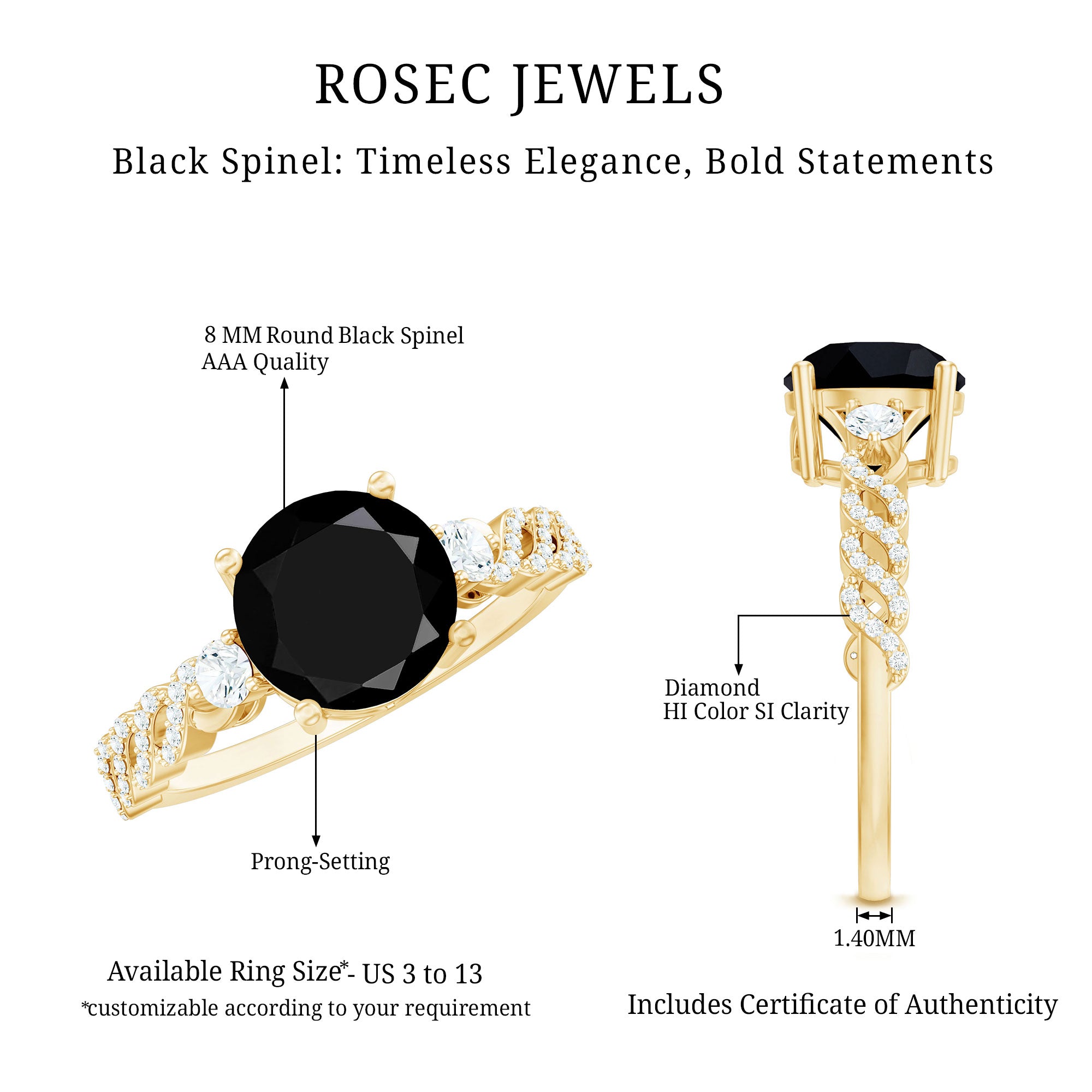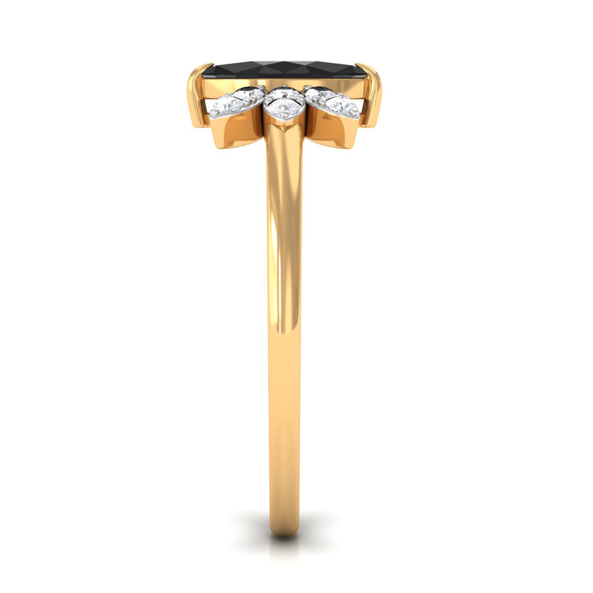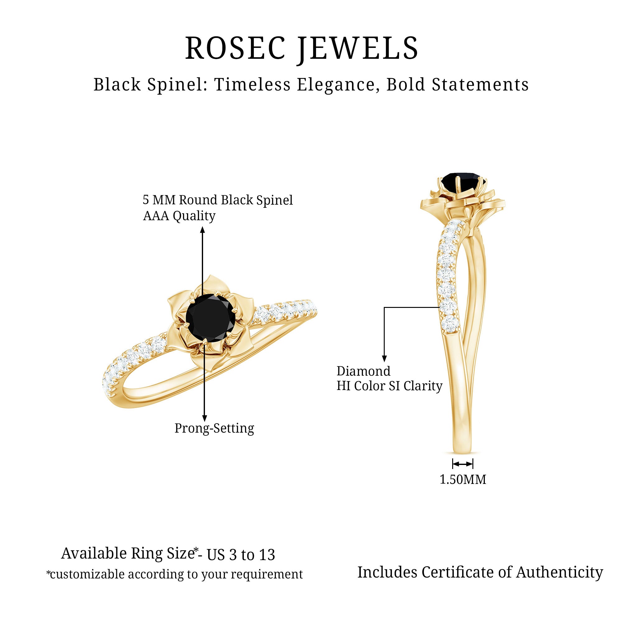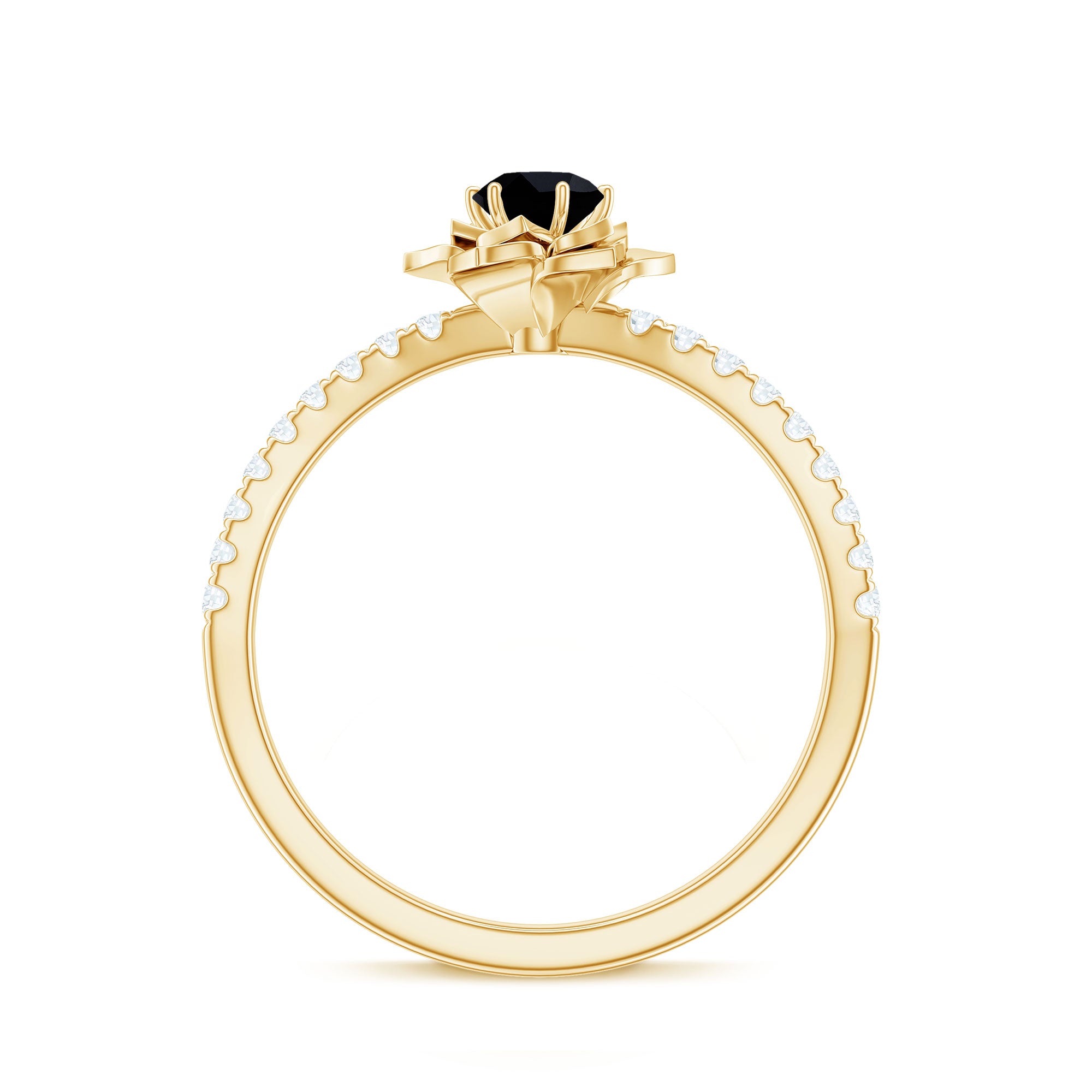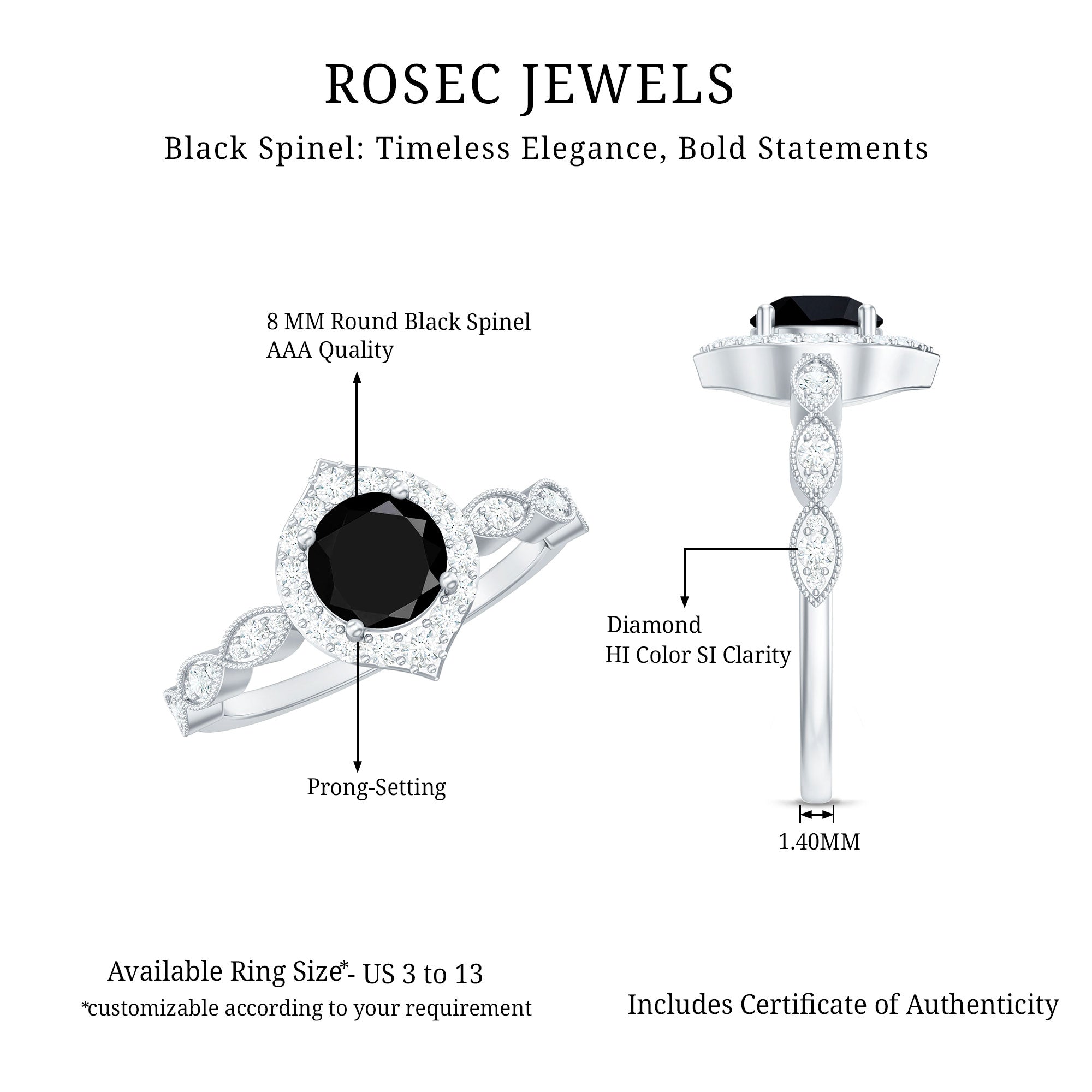 Lending an interesting visual appeal to the Black Spinel Solitaire Ring, a Halo encircles the Black Spinel with a parade of diamond/moissanite. The best part about a Halo is that it rewards more personality as well as an illusion of a larger-looking size to your Black Spinel. So, it is a unique blend of classic and flashy. That makes it another popular choice of the Black Spinel Engagement Ring.