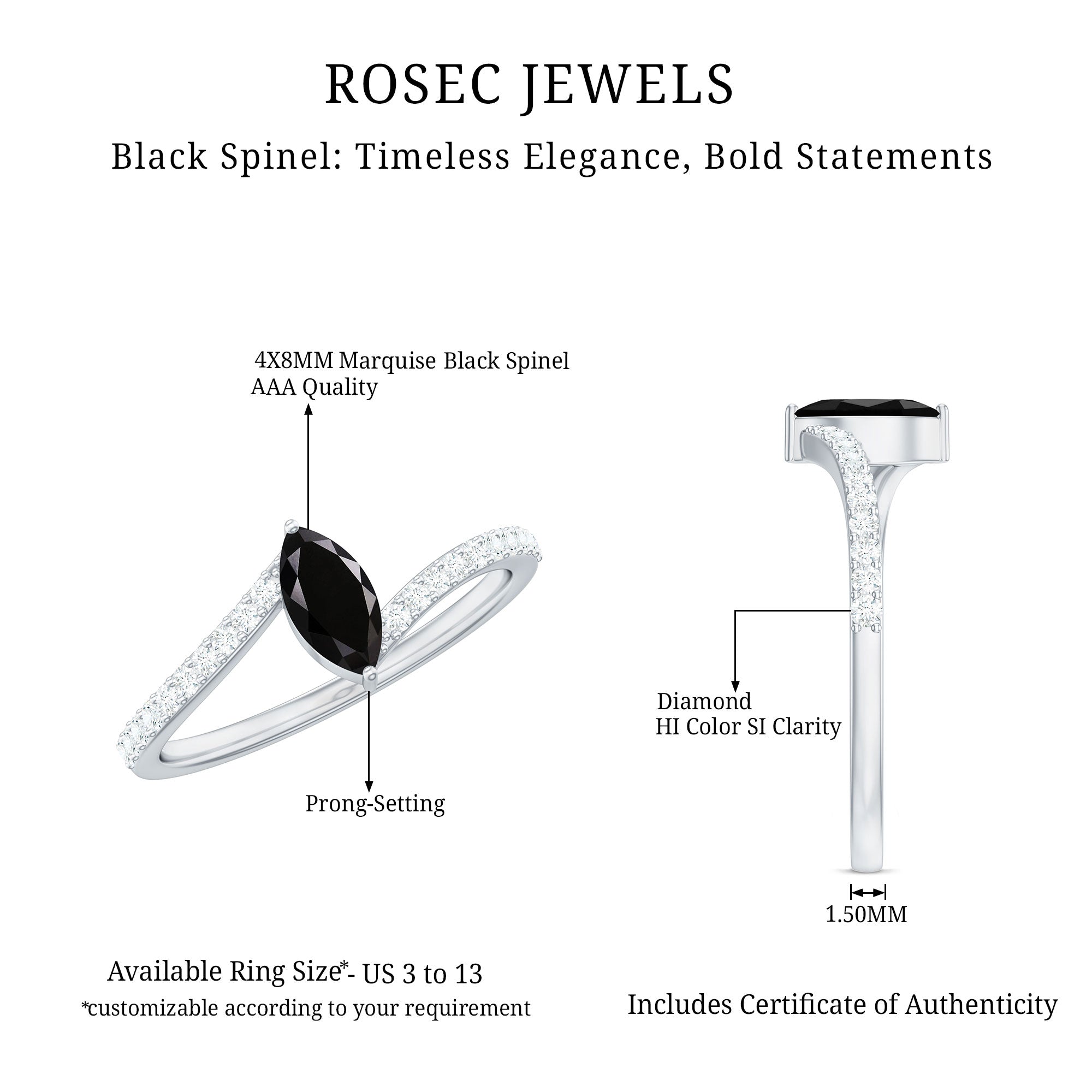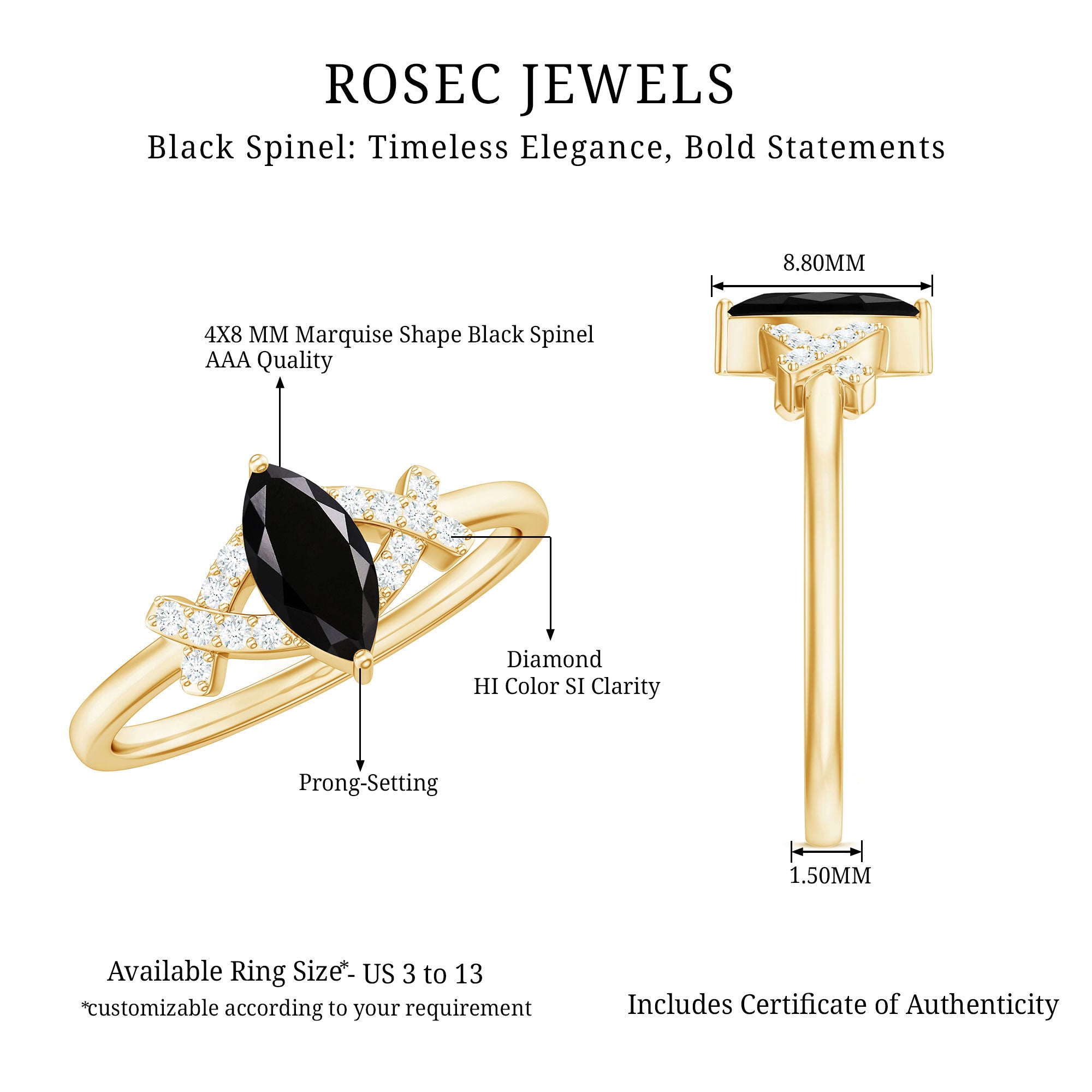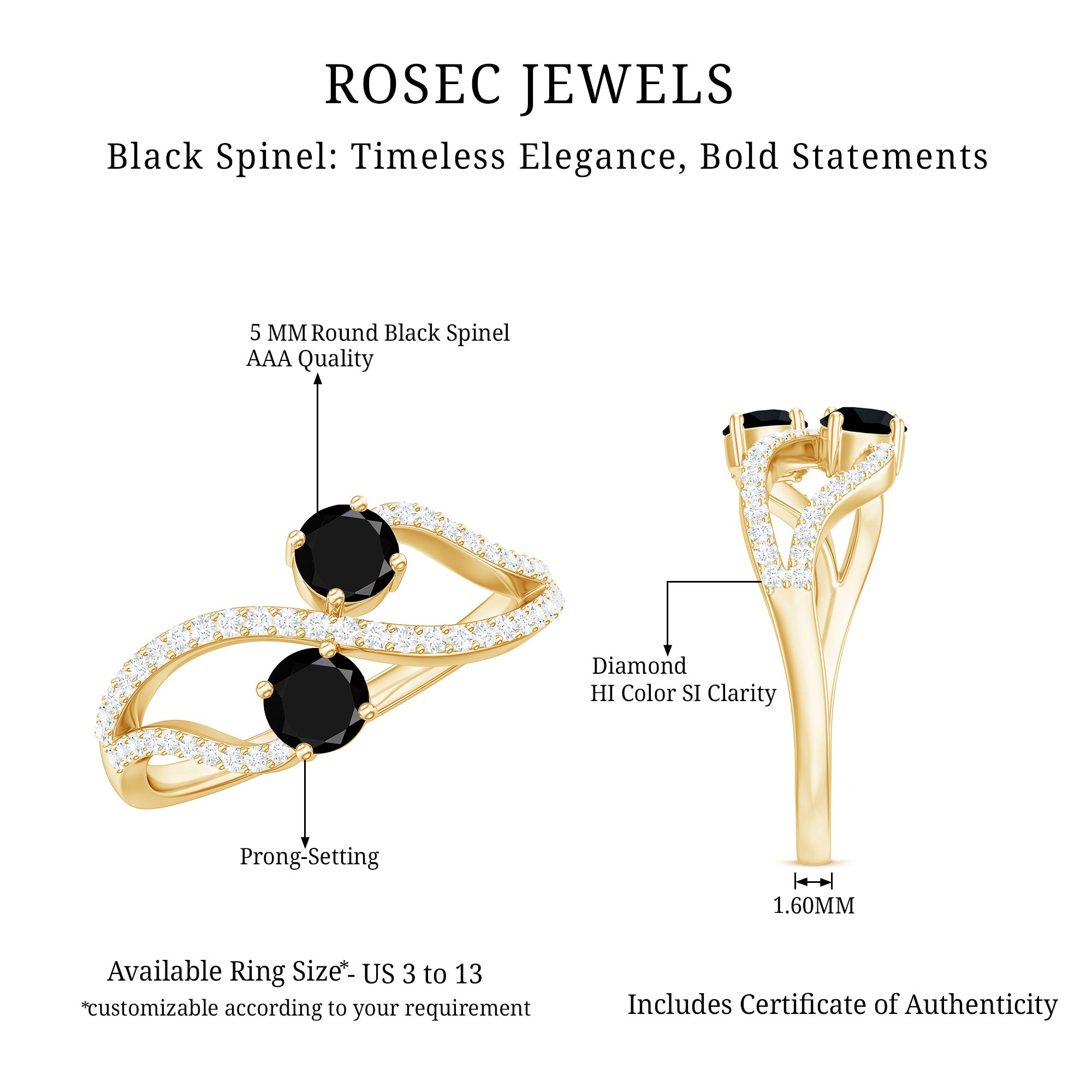 Adorned with the Centerpiece of Black Spinel that single-handedly captures all attention, a Solitaire Ring is one of the most classic choices of rings out there! The size of Black Spinel here is comparatively enormous, i.e., 6 MM or more. A Solitaire-style Black Spinel Engagement Ring is the go-to emblem of love for couples who like to abide by conventions but also fancy the bold pop of black. The Black Spinel Solitaire could range from the understated round shape to fancier Marquise, Pear, and even go beyond to give off a vintage vibe by being fashioned in princess or Cushion, Emerald, or Asscher cut.