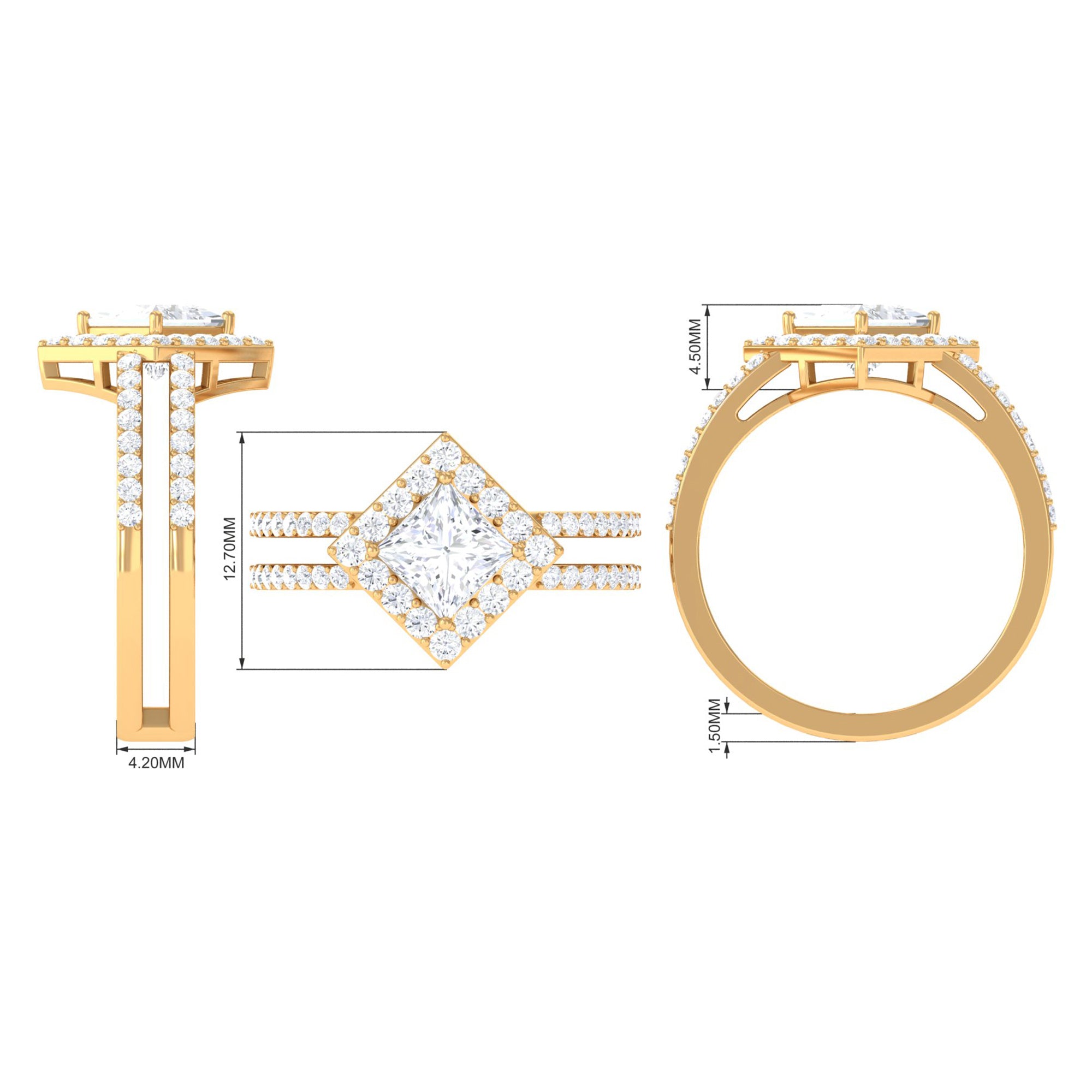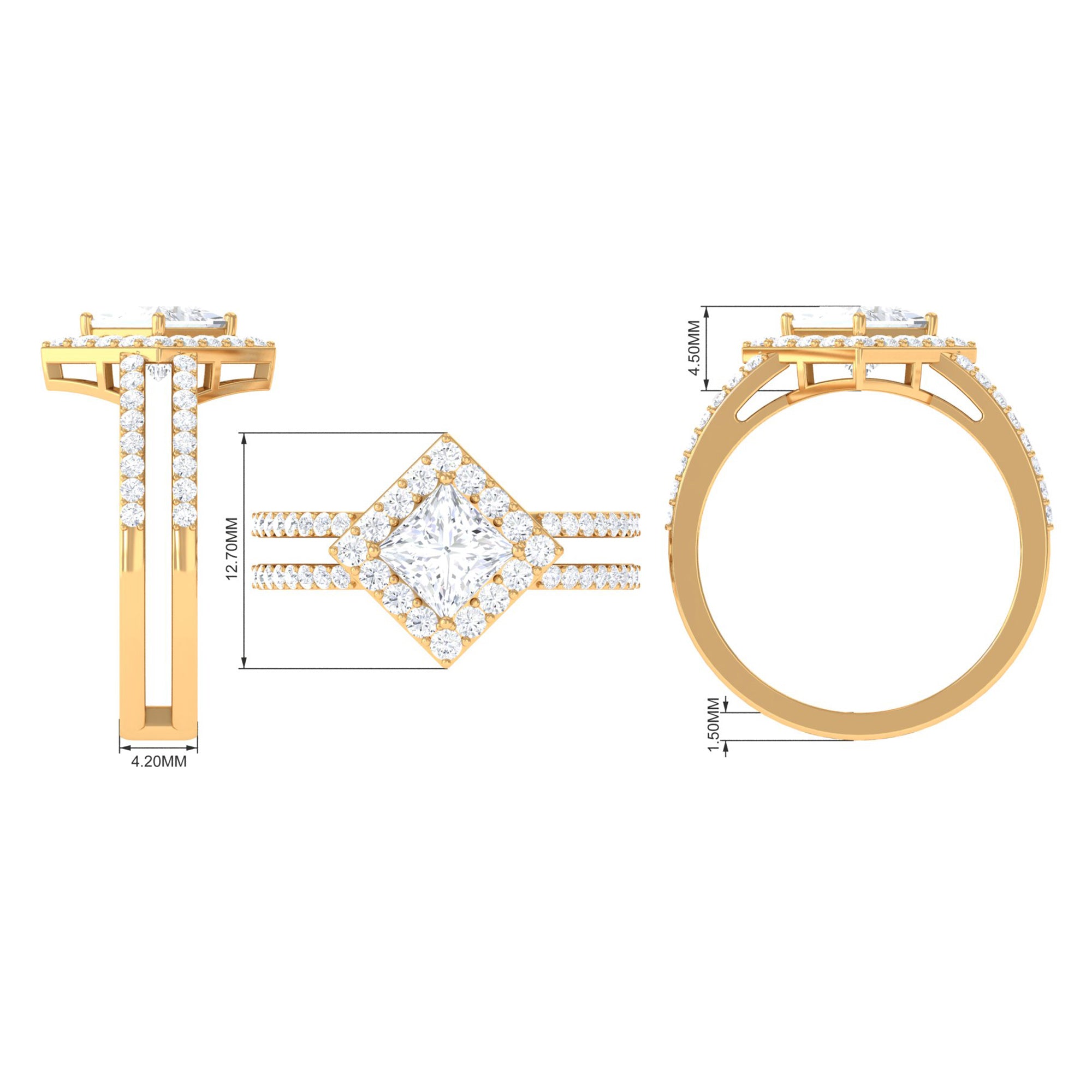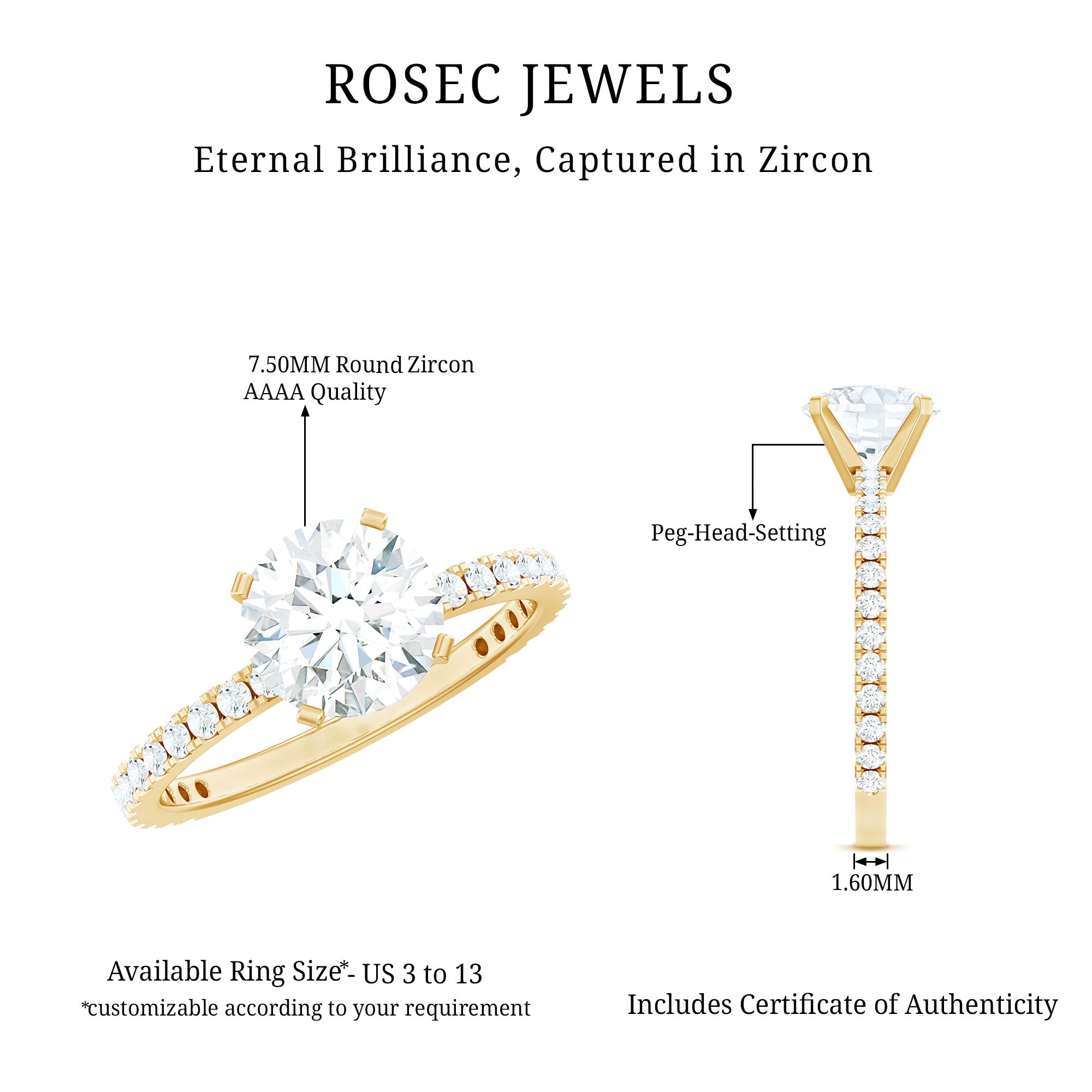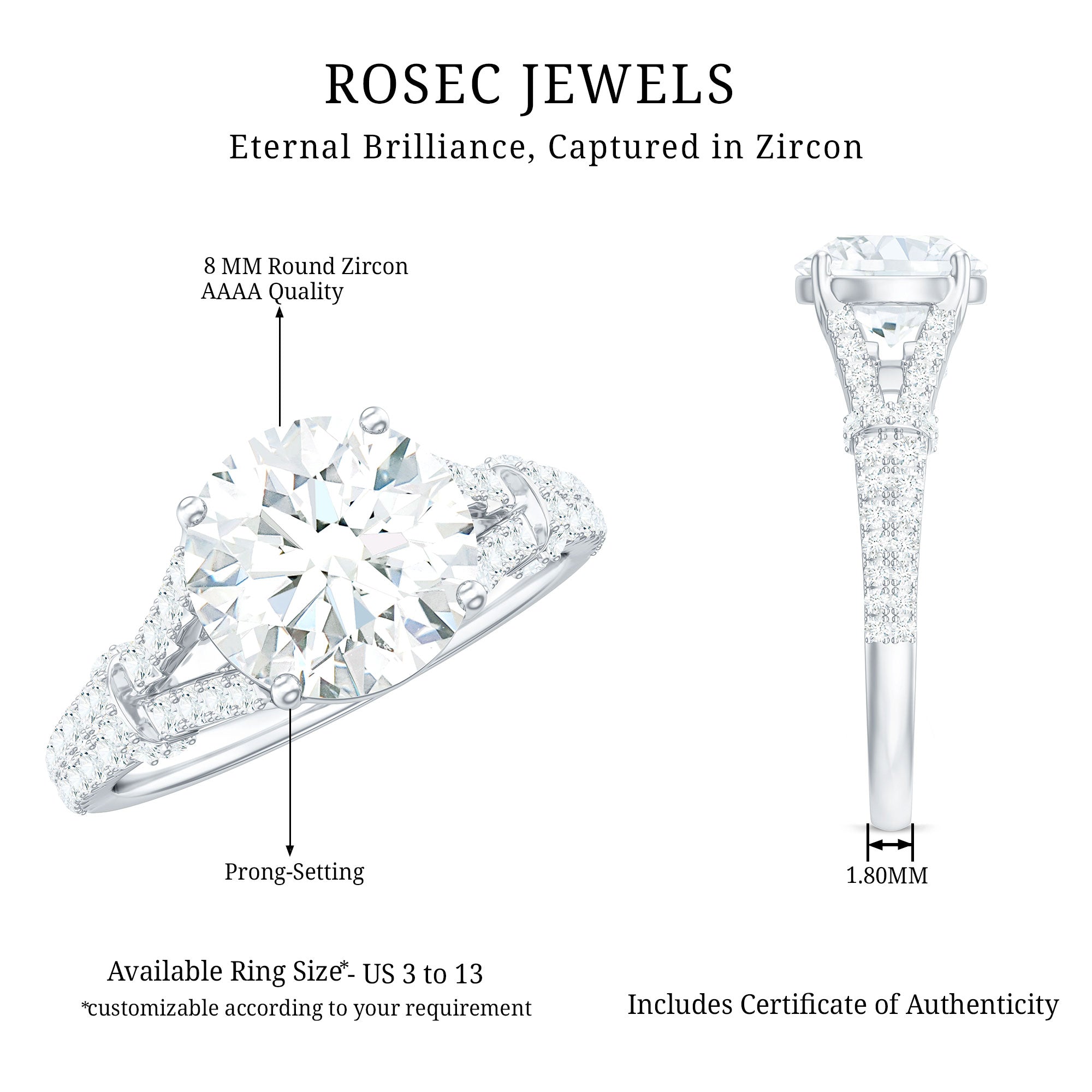 A Solitaire Ring is encased with the Single Centerpiece of Cubic Zirconia that takes all the center stage owing to its enormous size of 6 MM or more. Hailed as a timeless classic, a Solitaire Style Zirconia Engagement Ring is easily the go-to choice for all the conventional couples out there. Not just that, it pleases many aesthetics owing to the many shapes it is fashioned in. While a Round CZ Ring appeals owing to its understated and minimalist look, the one adorned with fanciers cuts like Pear, Marquise, or Princess speak to the trend-savvy bride-to-be(s). On the other hand, Asscher, Emerald, and Cushion Cut CZ Engagement Ring is meant to speak to those who fancy a vintage emblem of love.