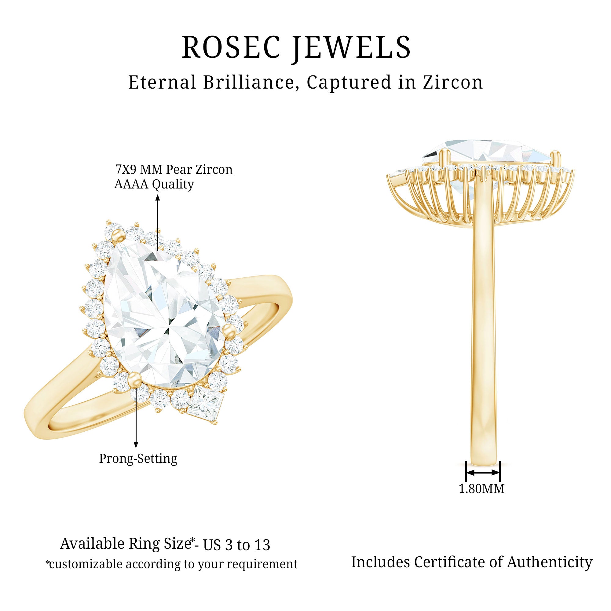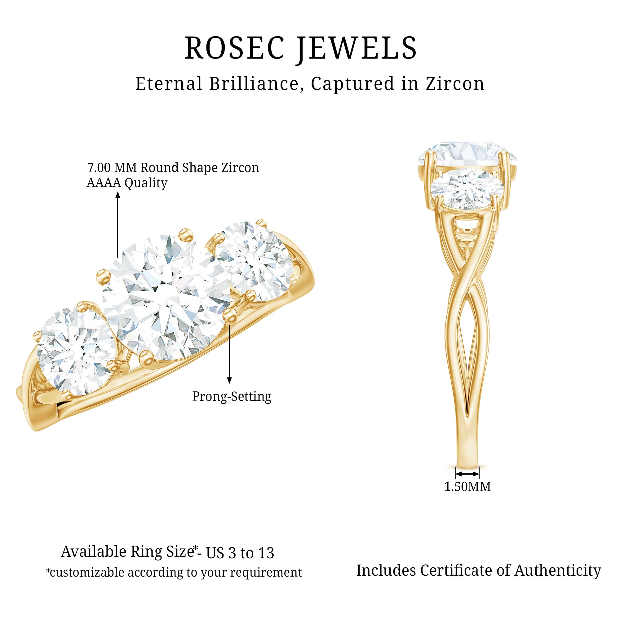 Apart from its many ring styles, a Cubic Zirconia Engagement Ring is fashioned in three tones of Gold- white, yellow, and rose. While White Gold cz engagement rings speak to those with a classic and understated sense of style, the ones fashioned in yellow gold appeal owing to their color-contrasting aesthetic and traditional vibe. On the other hand, a Cz ring fashioned in rose gold looks incredibly feminine.