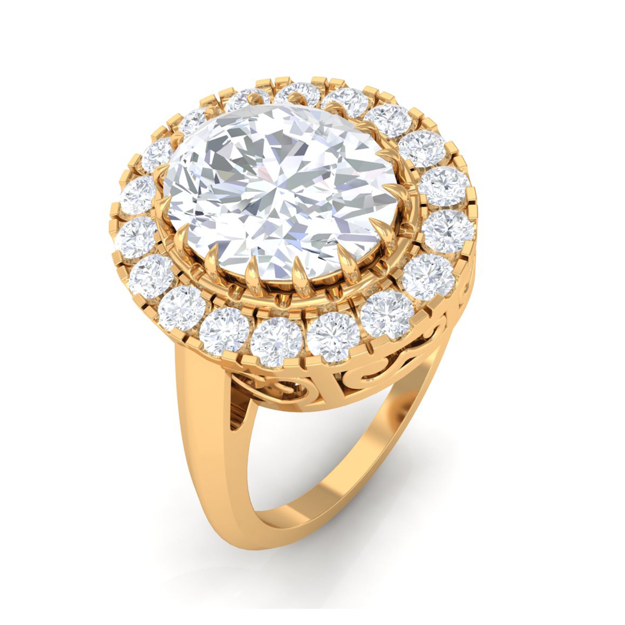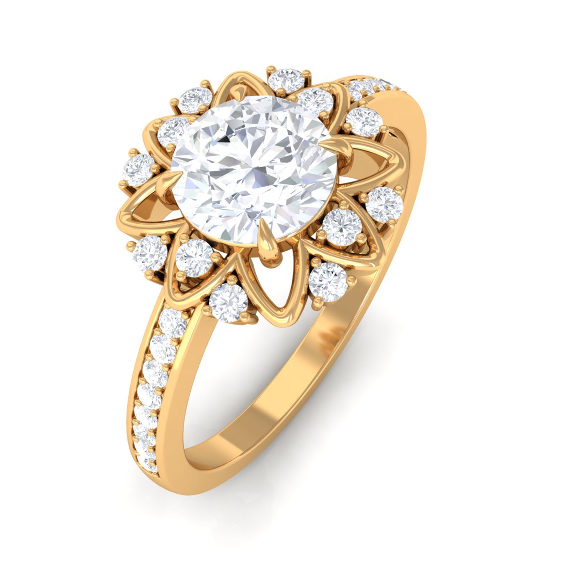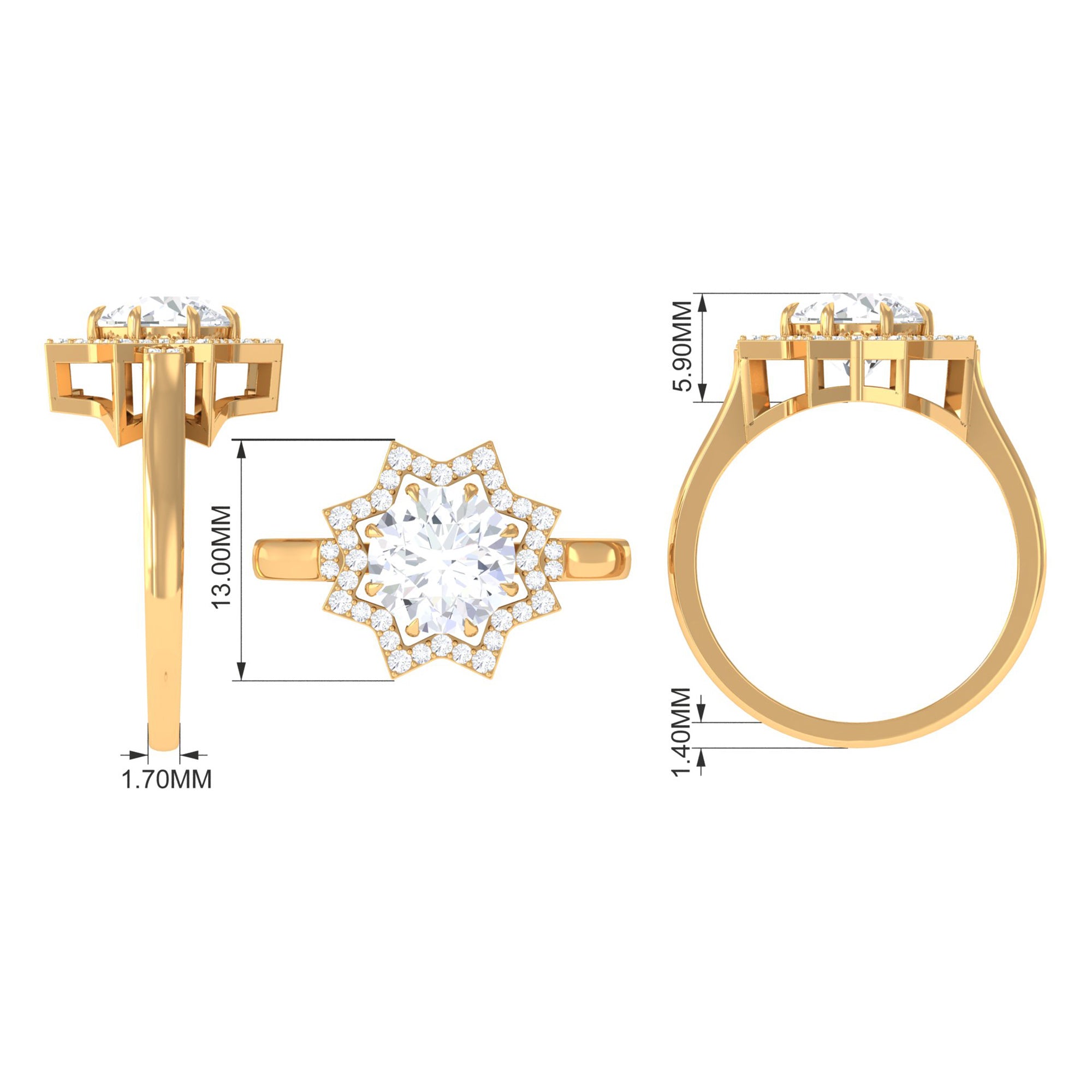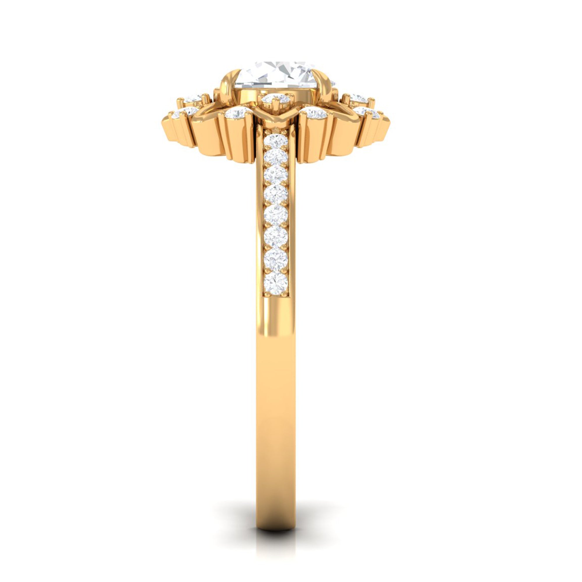 Just like the name suggests, this ring style draws inspiration from the old-world designs of Victorian, Edwardian, and Art Deco Eras that complement the sparkling center stone of CZ steal the limelight. You’re most likely to witness ornately crafted filigree and milgrain detailing, abstract geometrical patterns, retro floral motifs, and antique engravings. So, if you have been on the lookout for Gold Cubic Zirconia Engagement Rings that speak to your old school love, look no further!