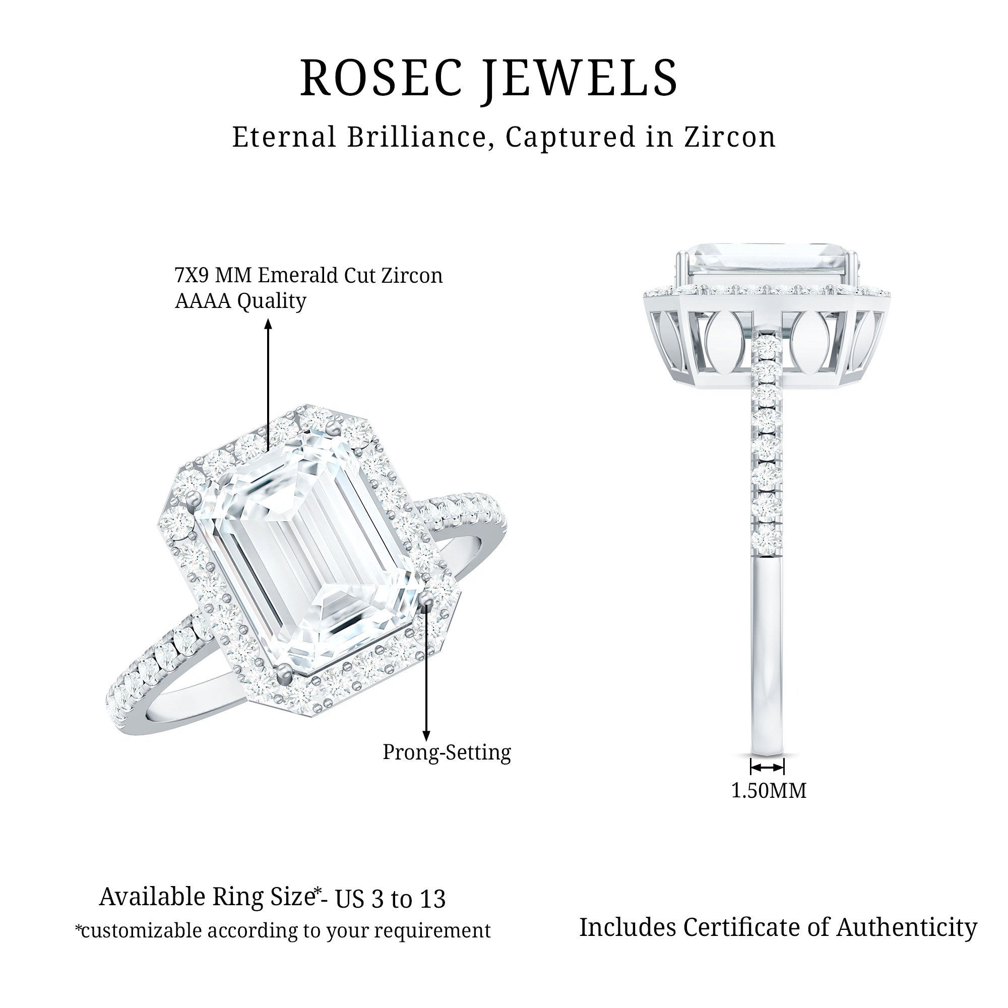 A Solitaire Ring is encased with the Single Centerpiece of Cubic Zirconia that takes all the center stage owing to its enormous size of 6 MM or more. Hailed as a timeless classic, a Solitaire Style Zirconia Engagement Ring is easily the go-to choice for all the conventional couples out there. Not just that, it pleases many aesthetics owing to the many shapes it is fashioned in. While a Round CZ Ring appeals owing to its understated and minimalist look, the one adorned with fanciers cuts like Pear, Marquise, or Princess speak to the trend-savvy bride-to-be(s). On the other hand, Asscher, Emerald, and Cushion Cut CZ Engagement Ring is meant to speak to those who fancy a vintage emblem of love.