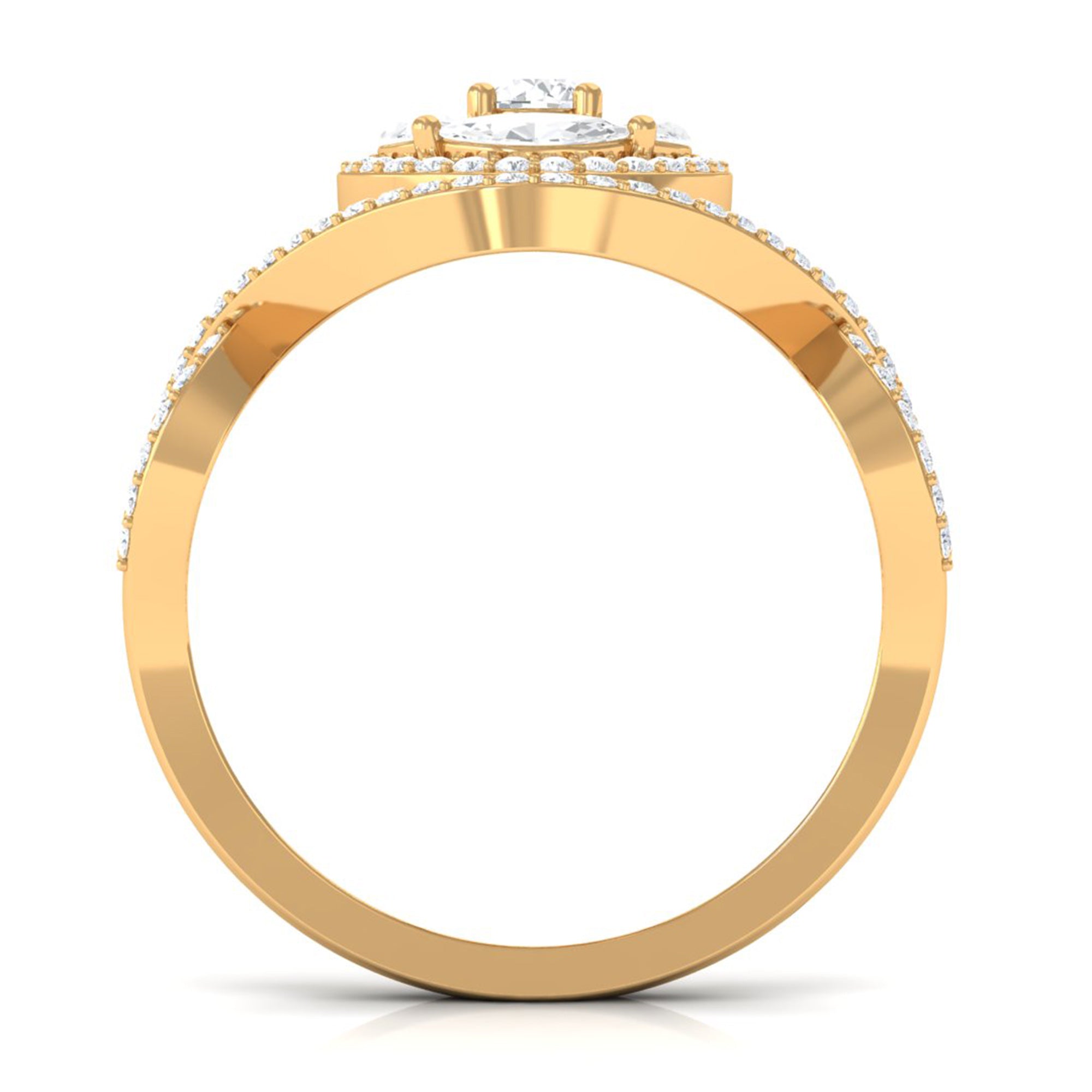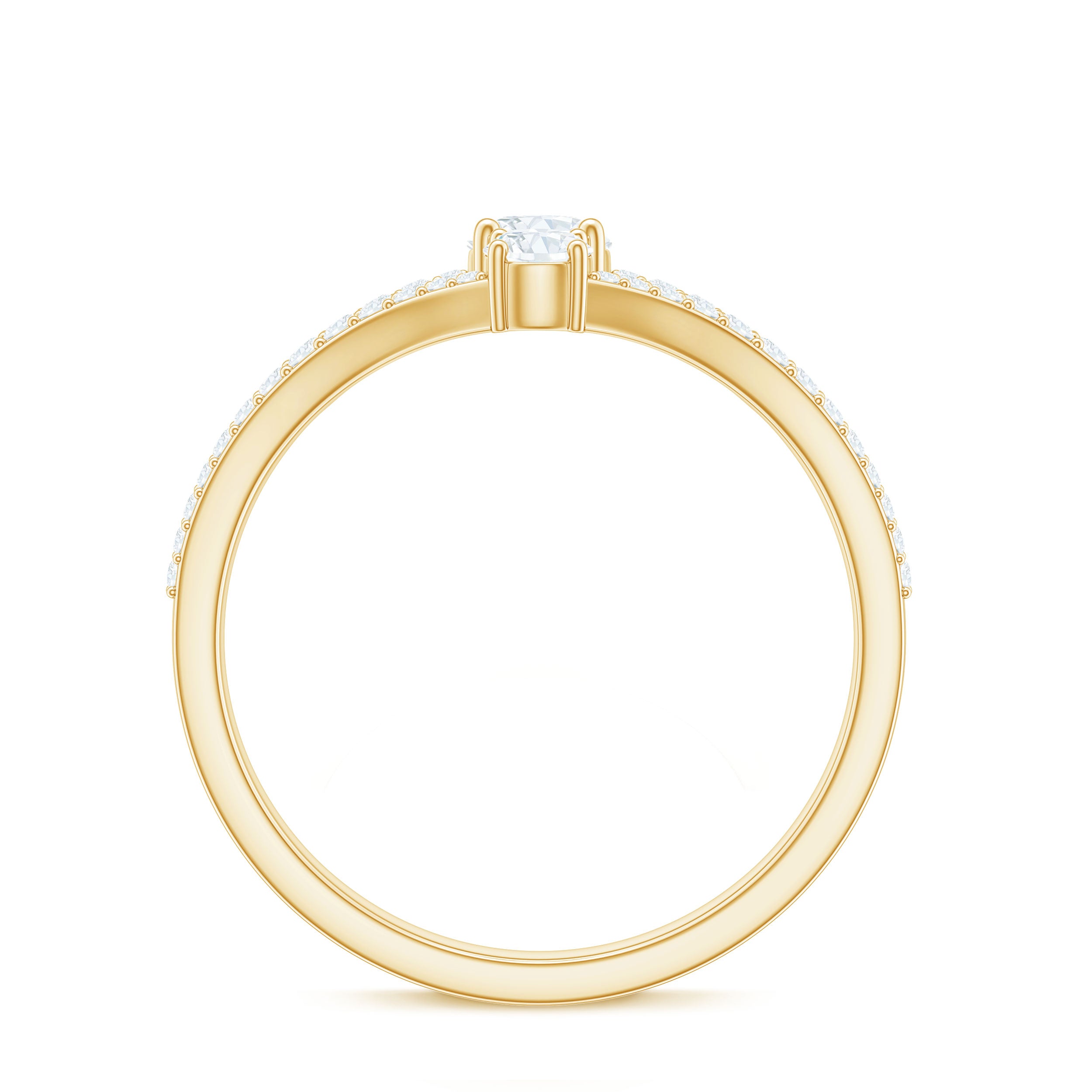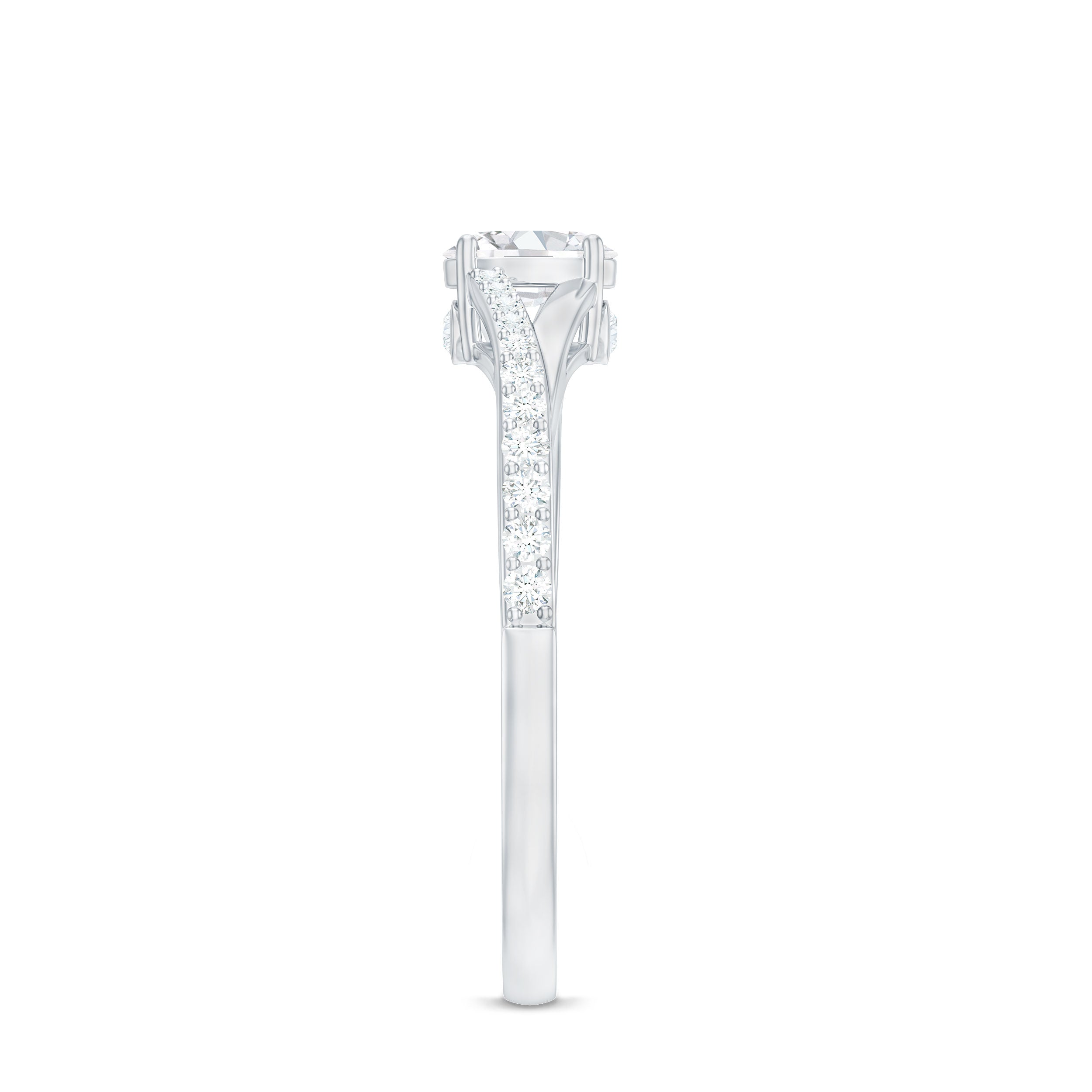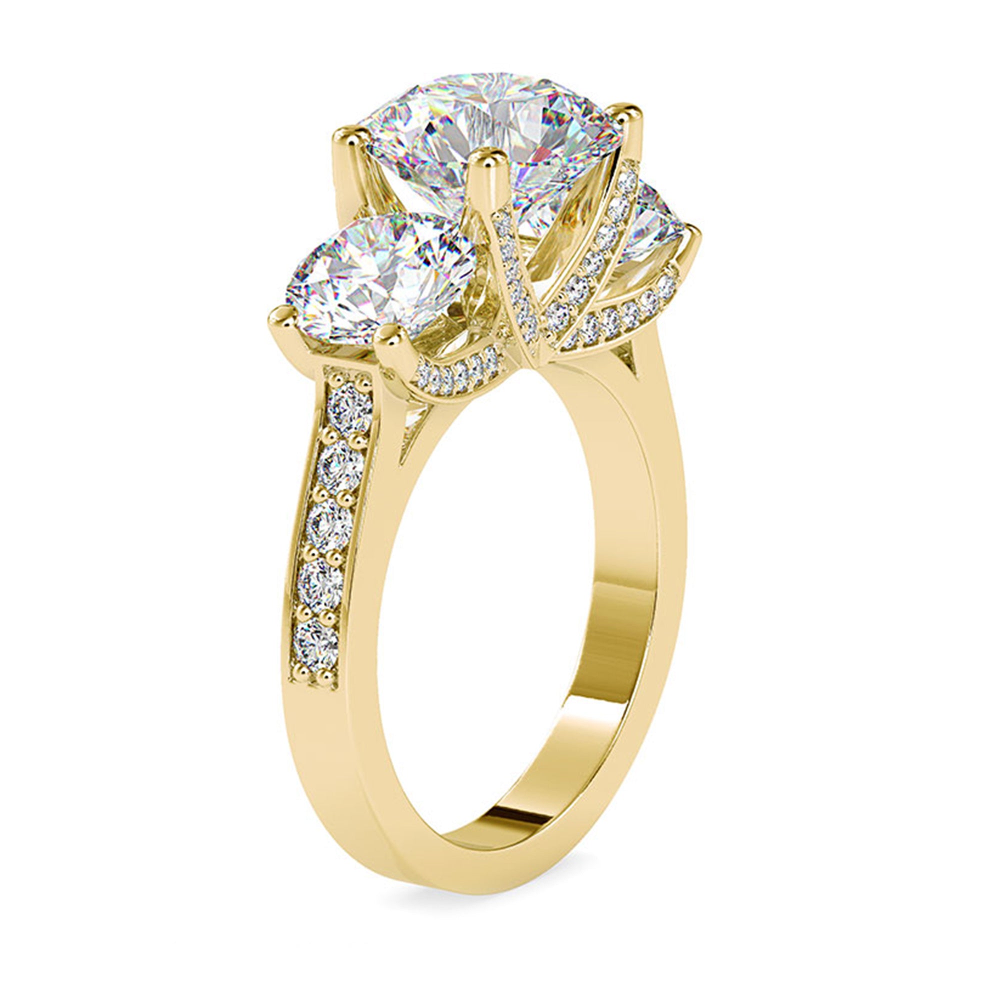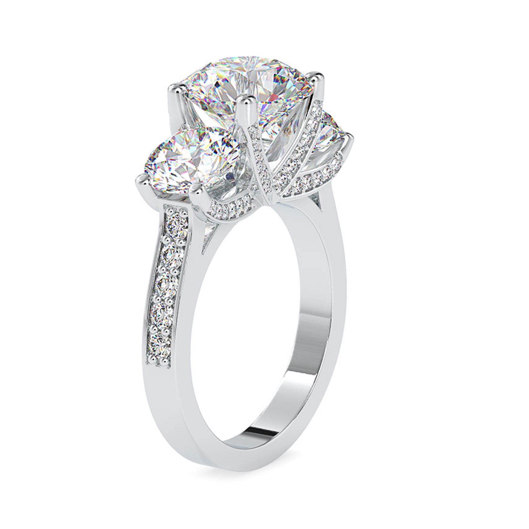 Unconventional and uniquely flashy, this ring style is encased with three stones of Cubic Zirconia arranged uniformly in a row. If you fancy more sparkles in your betrothal ring, a three stone ring is the way forward (since three stones means triple the sparkles). While a Round or Oval Cubic Zirconia Engagement Rings are the most classic options in this ring style, those adorned with Pear, Princess, Cushion, and Emerald Cut are also soaring in popularity. Behind its eye-striking aesthetics, it speaks to each couple uniquely since each of the three stones here sheds light on the couple’s past, present, and future respectively.