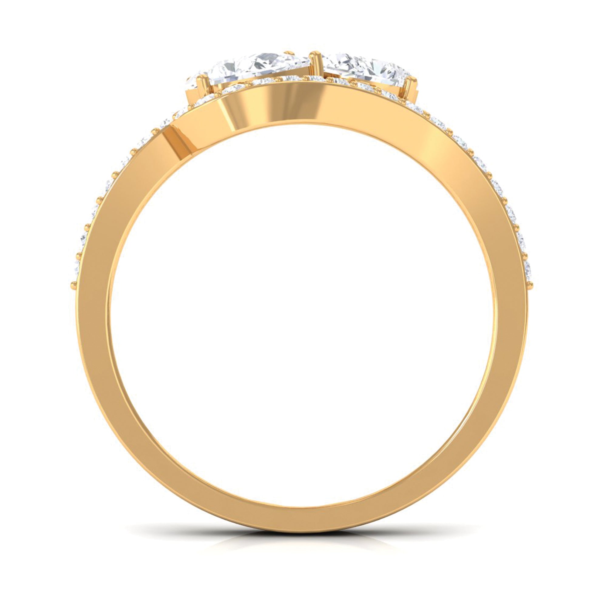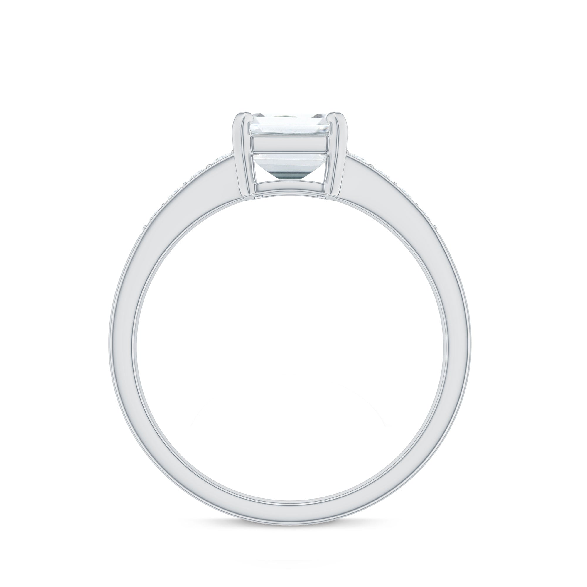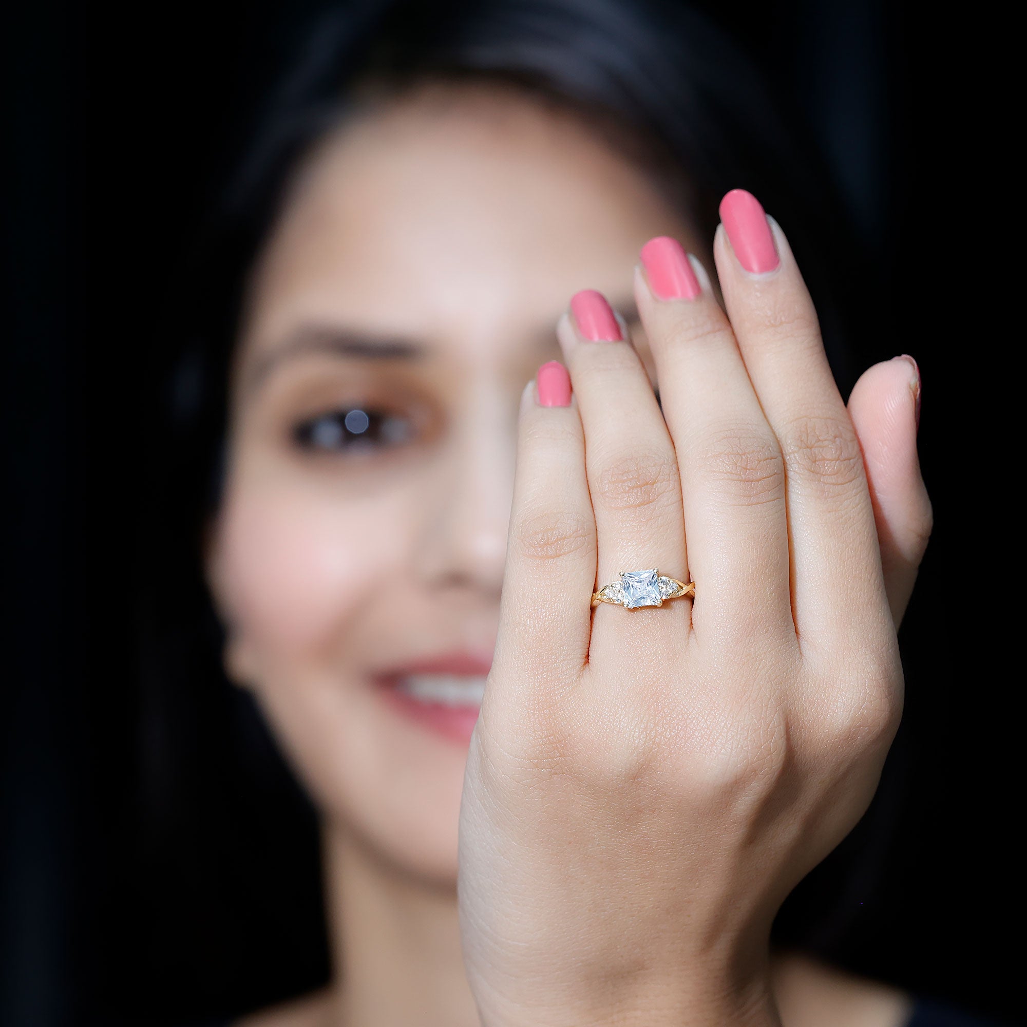 Unconventional and uniquely flashy, this ring style is encased with three stones of Cubic Zirconia arranged uniformly in a row. If you fancy more sparkles in your betrothal ring, a three stone ring is the way forward (since three stones means triple the sparkles). While a Round or Oval Cubic Zirconia Engagement Rings are the most classic options in this ring style, those adorned with Pear, Princess, Cushion, and Emerald Cut are also soaring in popularity. Behind its eye-striking aesthetics, it speaks to each couple uniquely since each of the three stones here sheds light on the couple’s past, present, and future respectively.