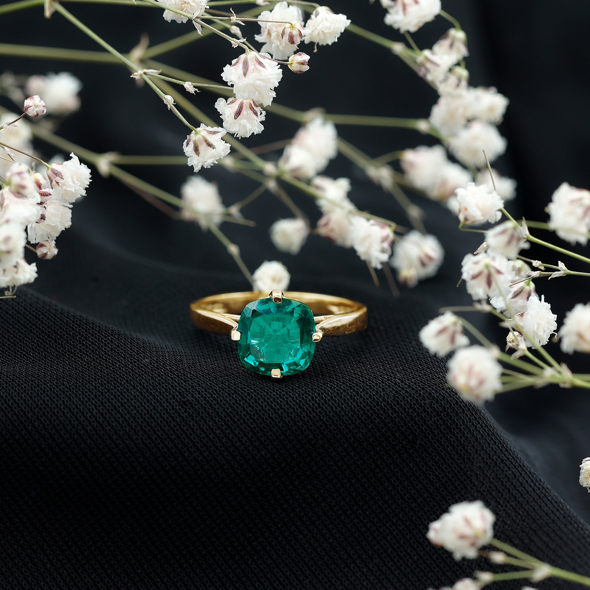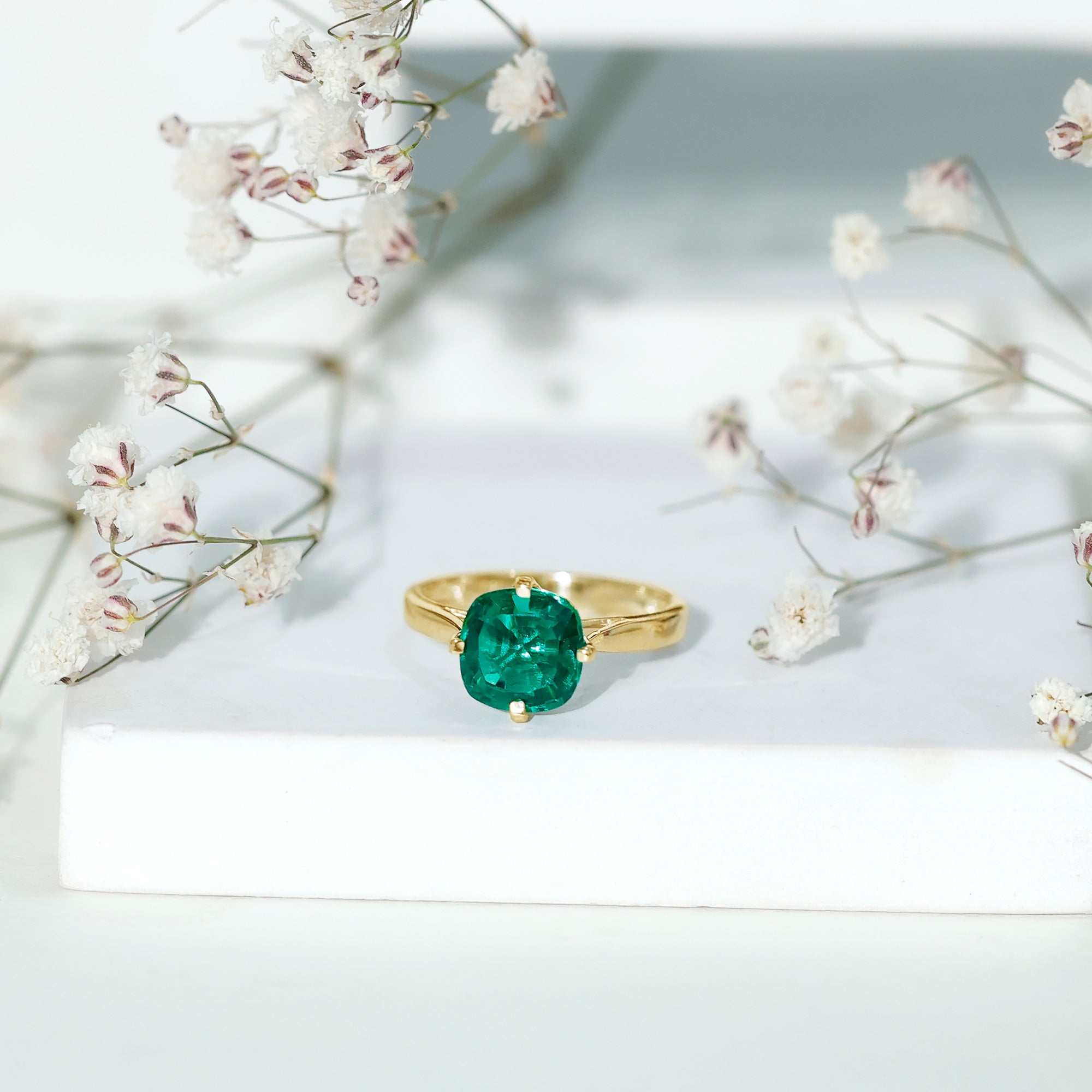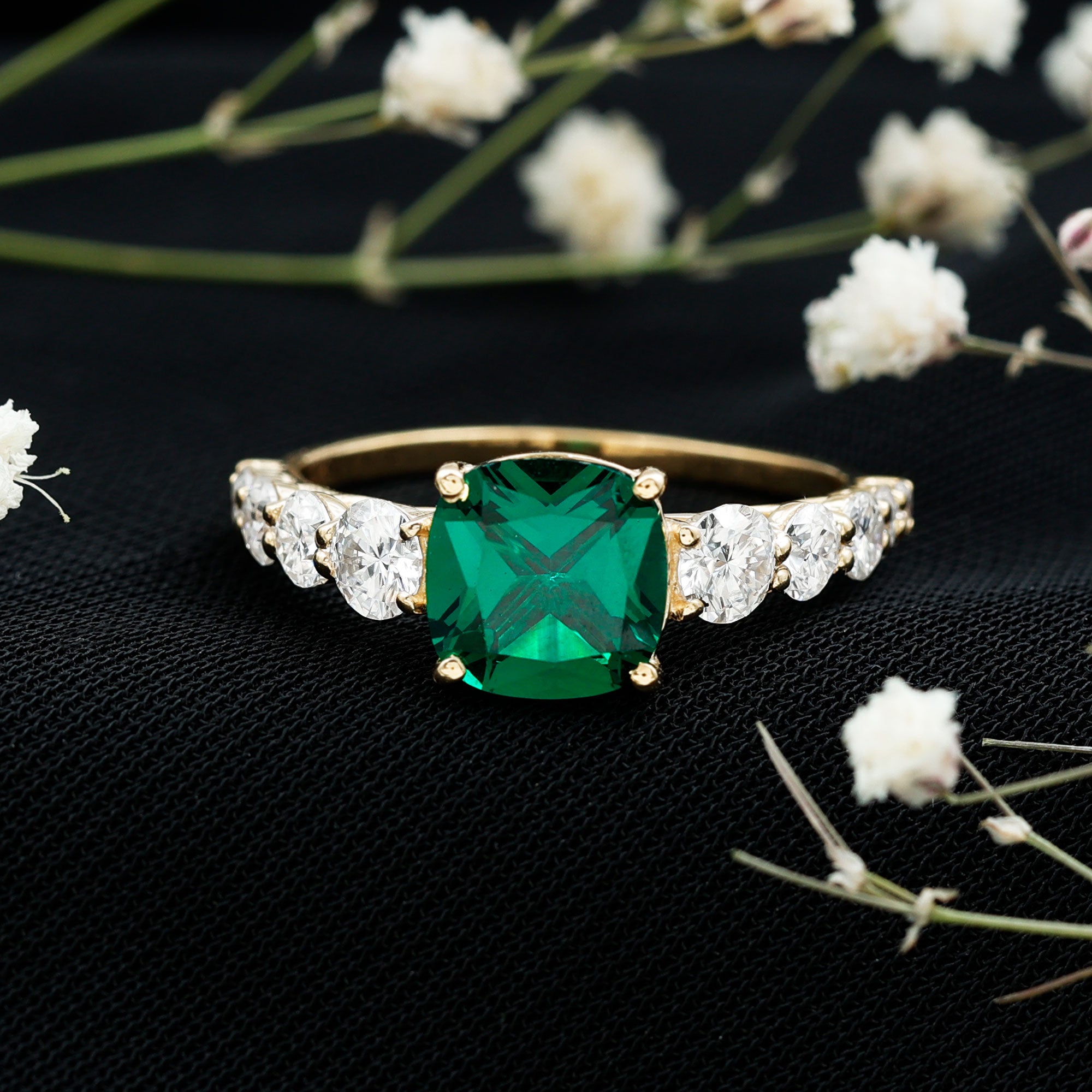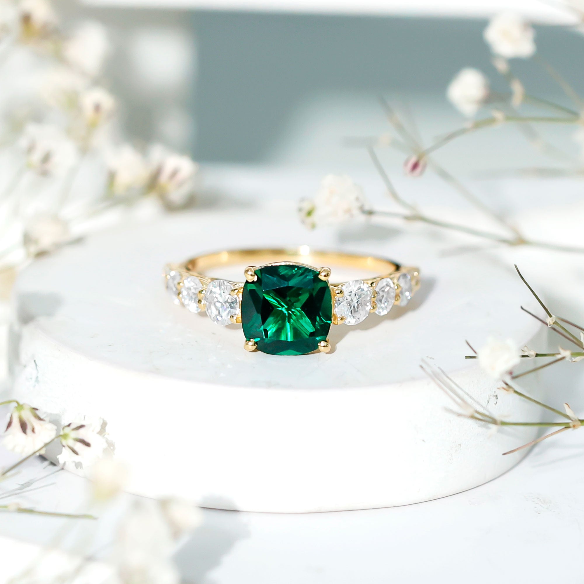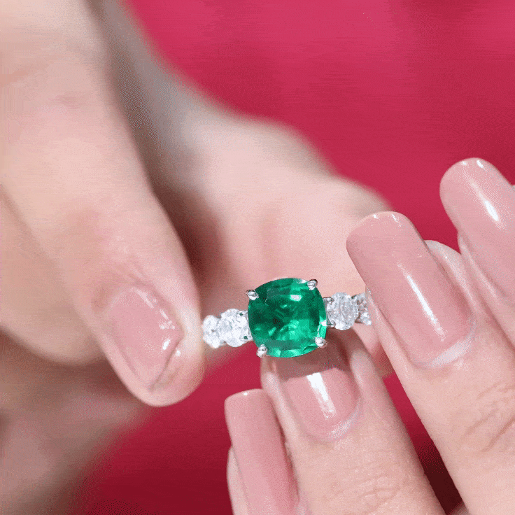 Cushion cut holds the color better than the other gemstone cuts. This makes them a perfect choice for colored gemstone engagement rings. A cushion cut emerald ring can be a meaningful engagement choice for your May born partner.