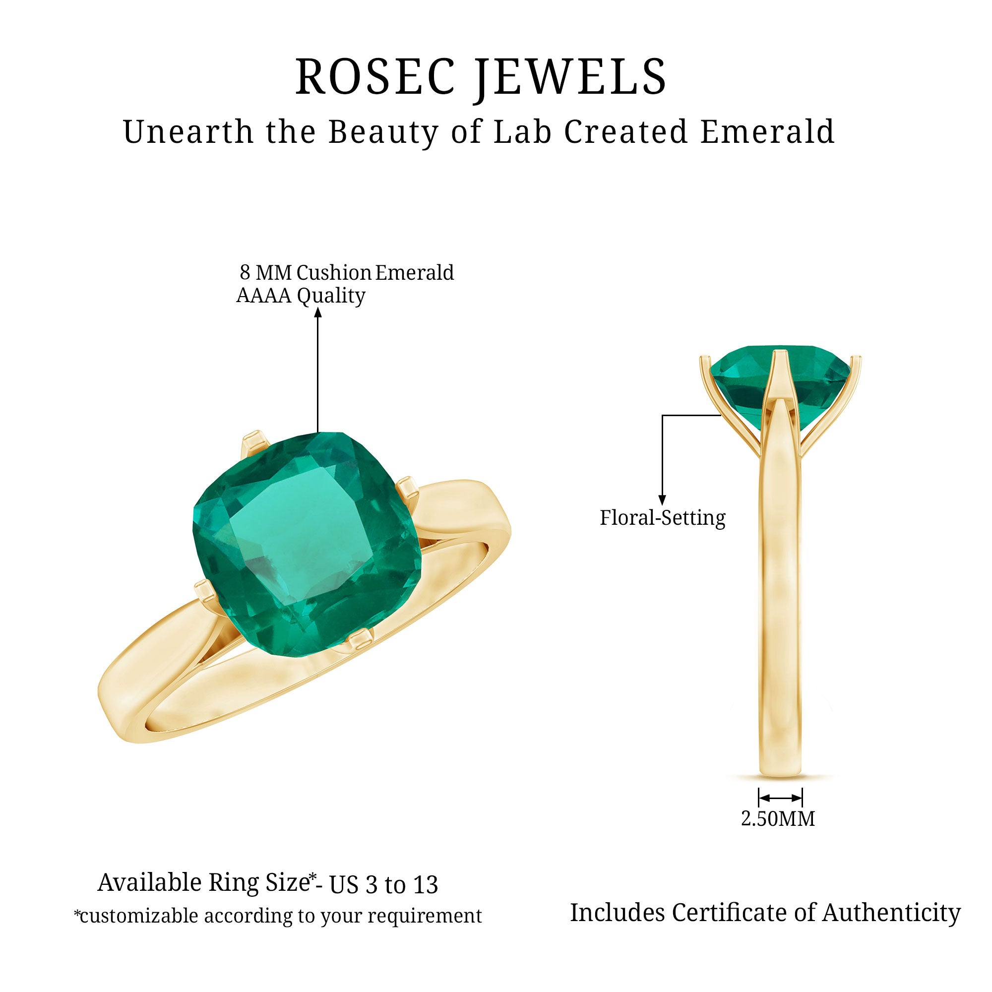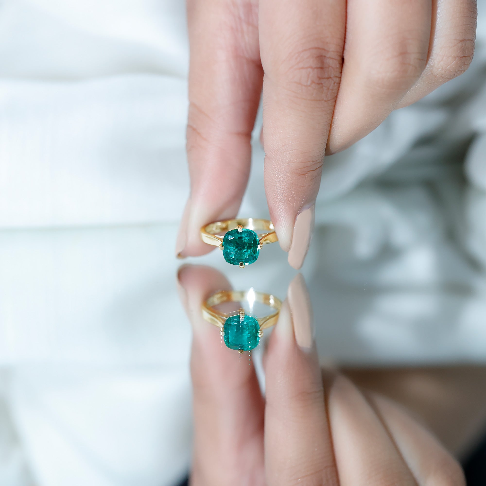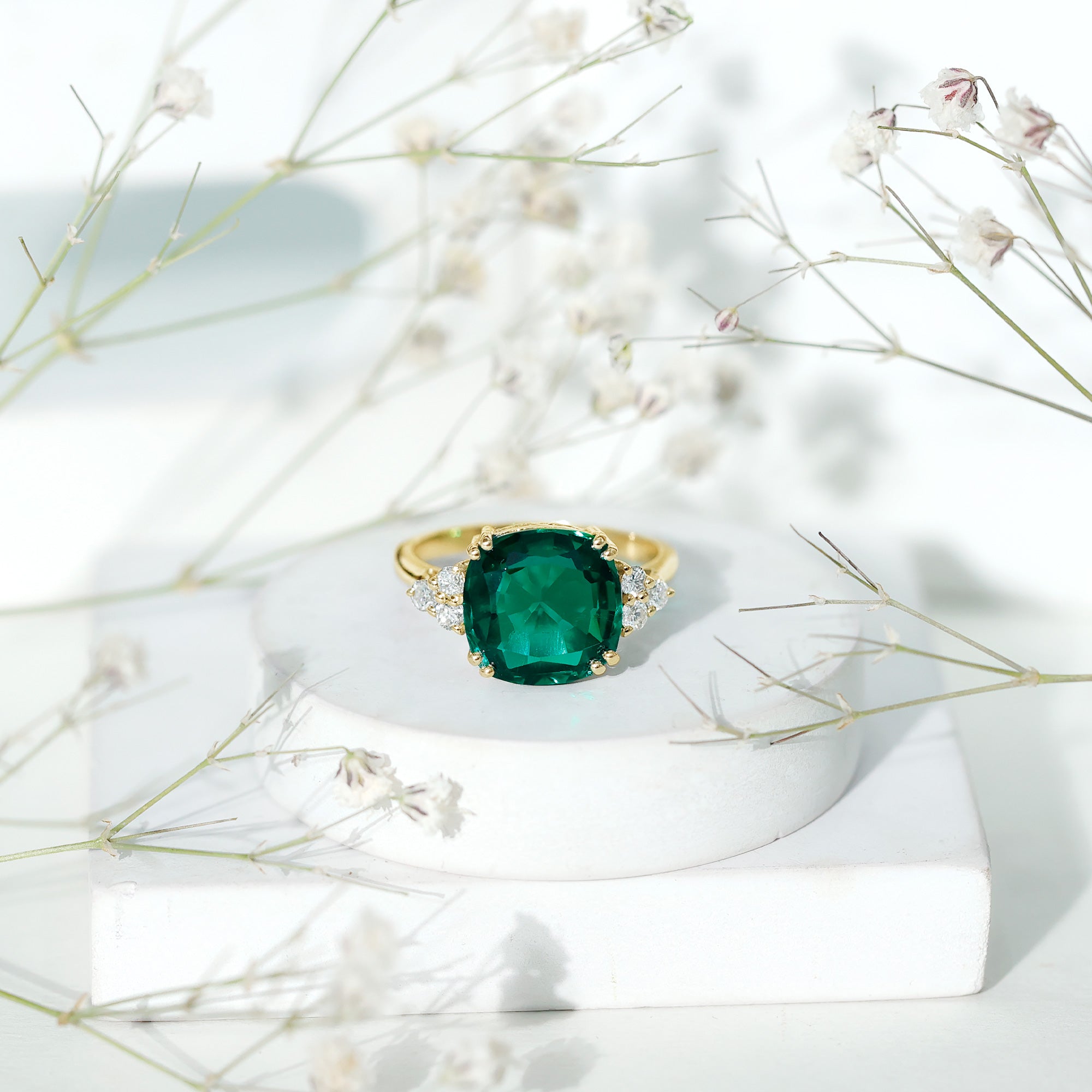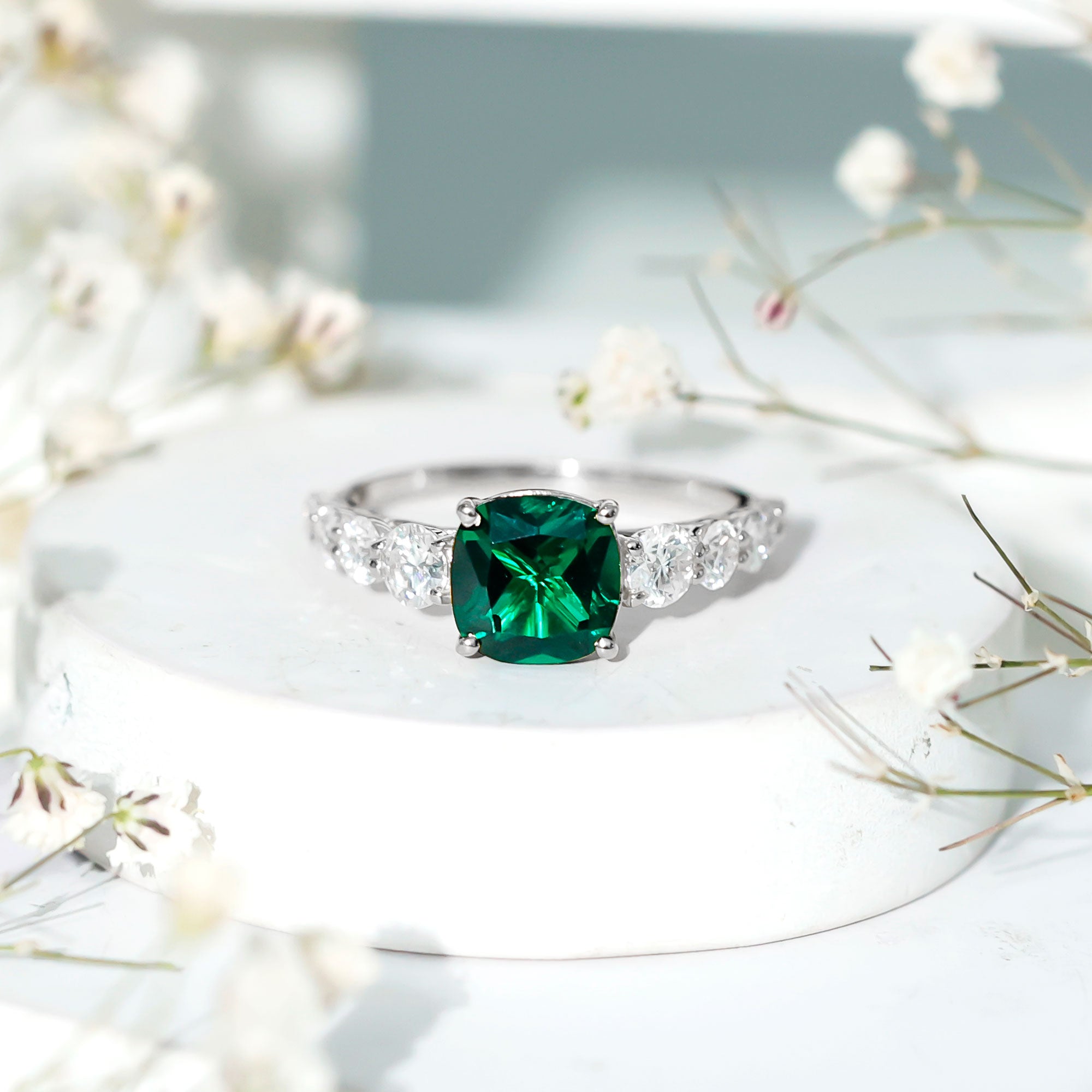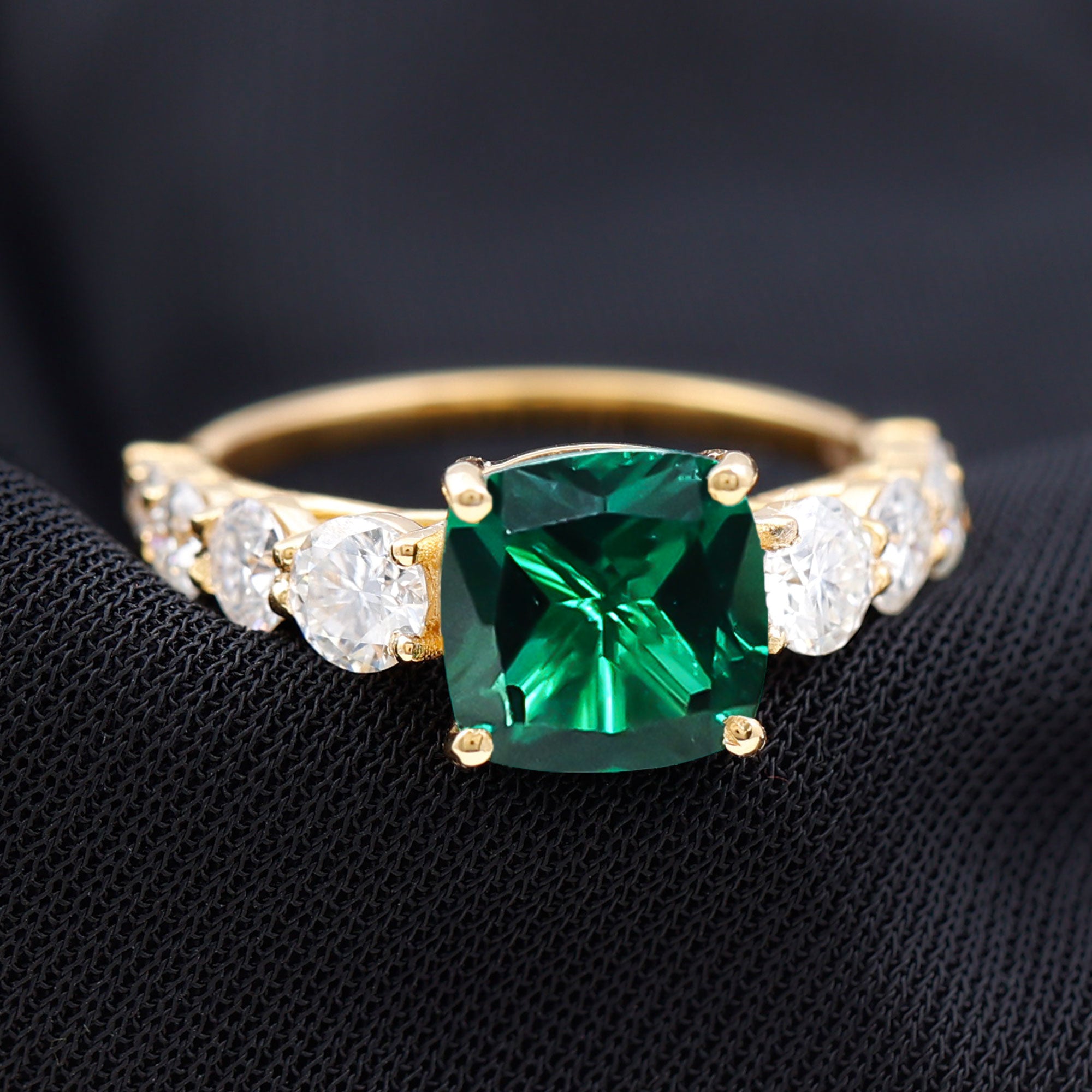 Cushion cut holds the color better than the other gemstone cuts. This makes them a perfect choice for colored gemstone engagement rings. A cushion cut emerald ring can be a meaningful engagement choice for your May born partner.