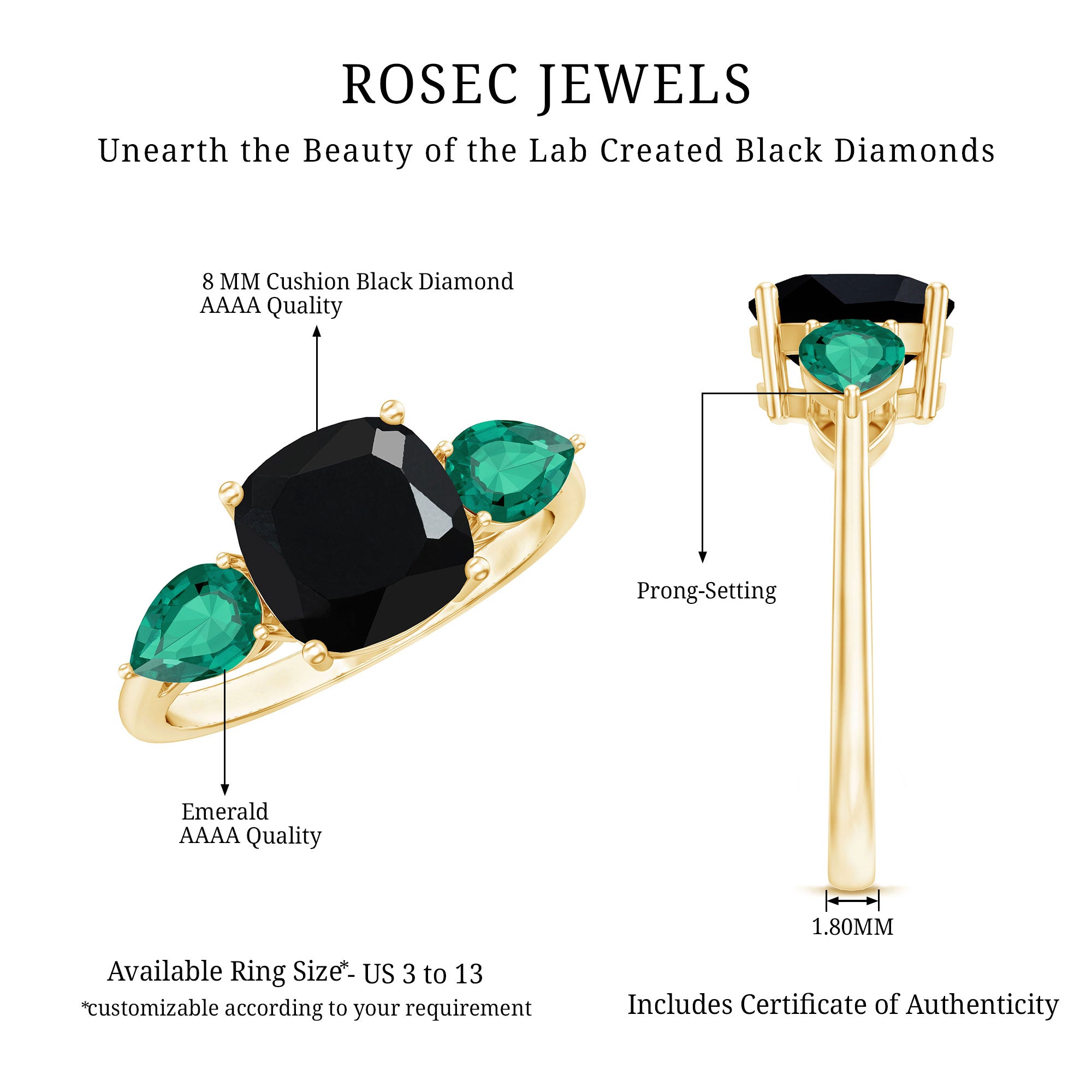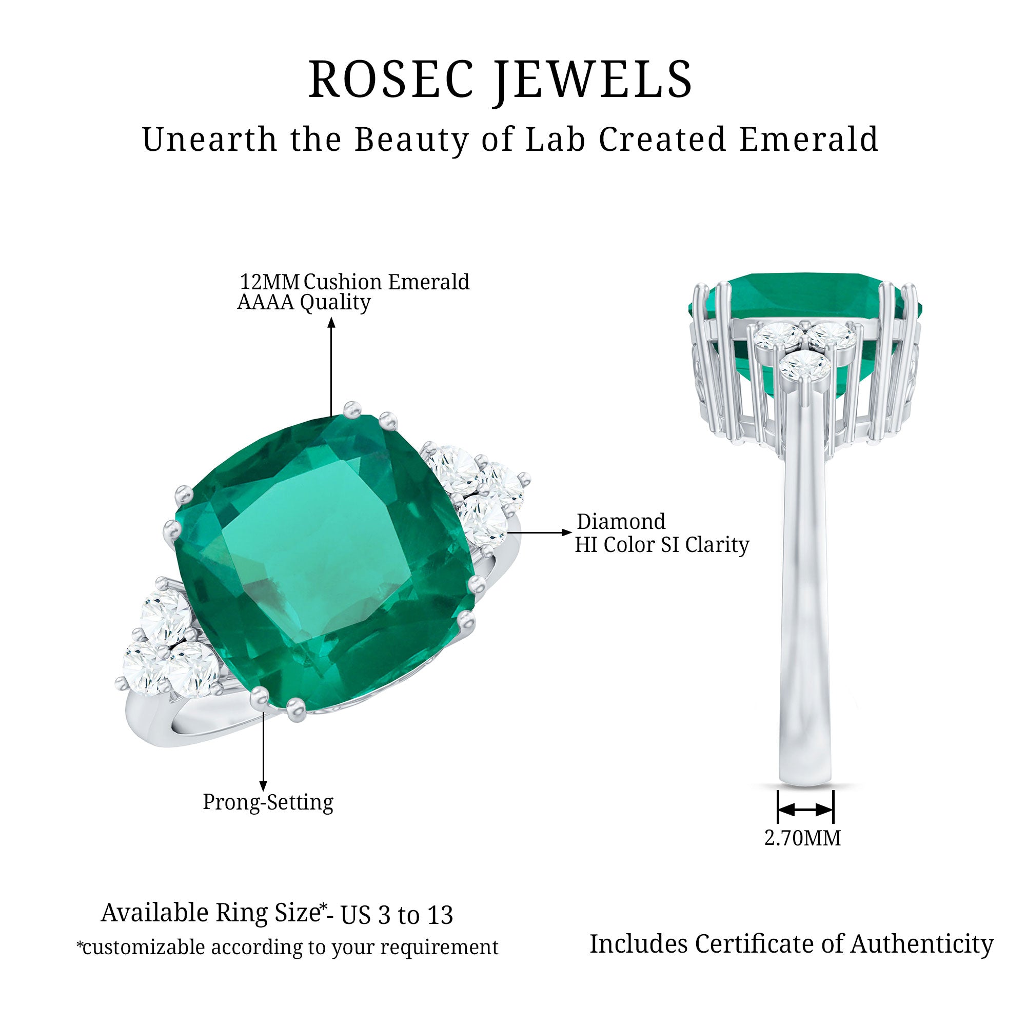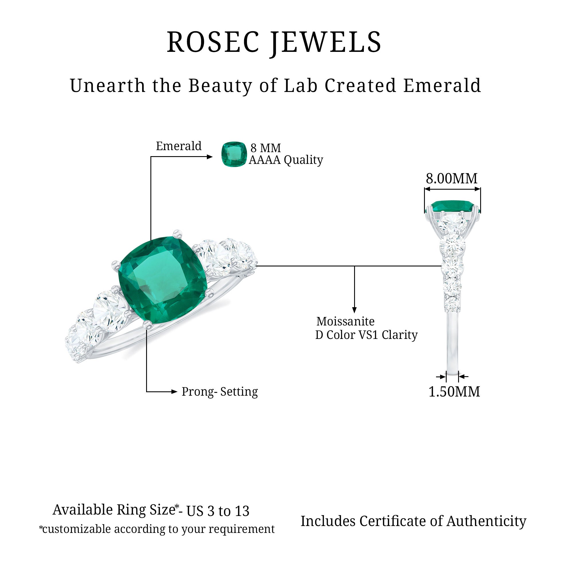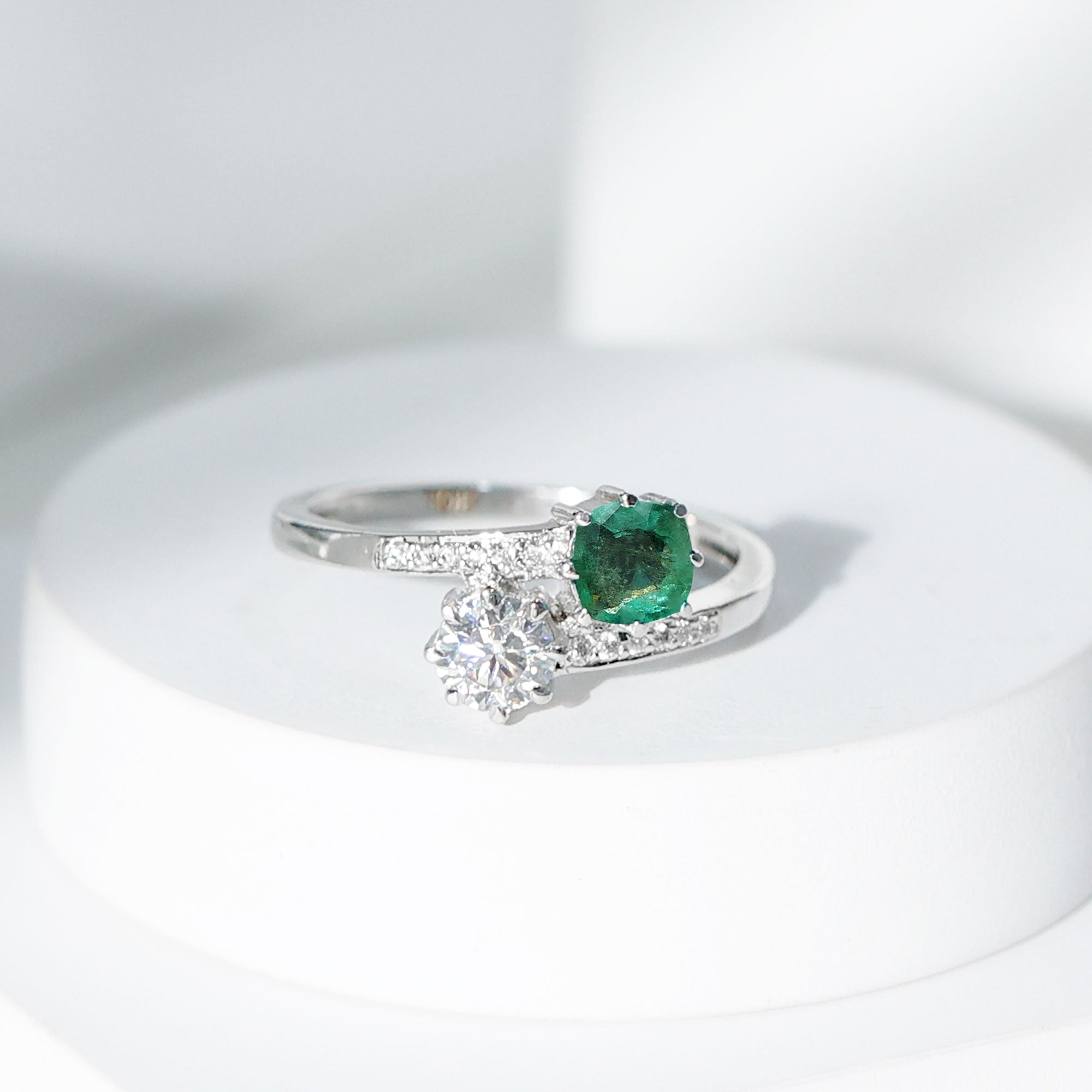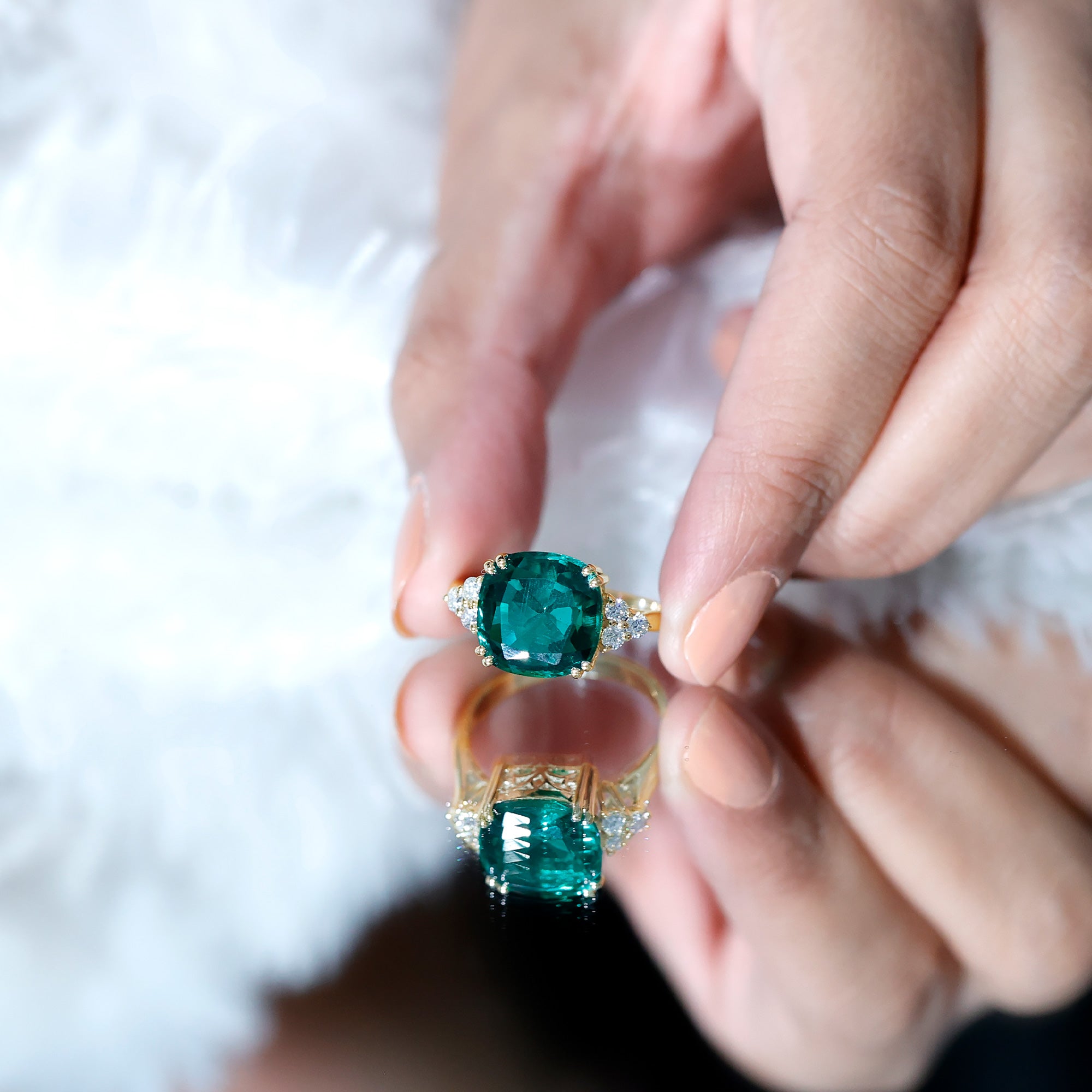 Cushion cut holds the color better than the other gemstone cuts. This makes them a perfect choice for colored gemstone engagement rings. A cushion cut emerald ring can be a meaningful engagement choice for your May born partner.