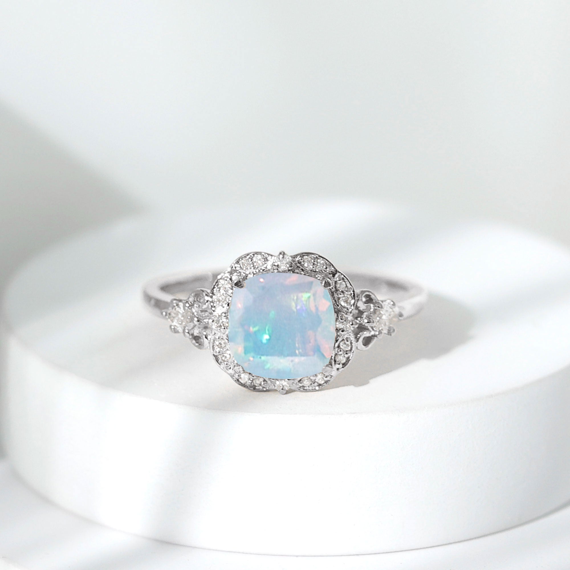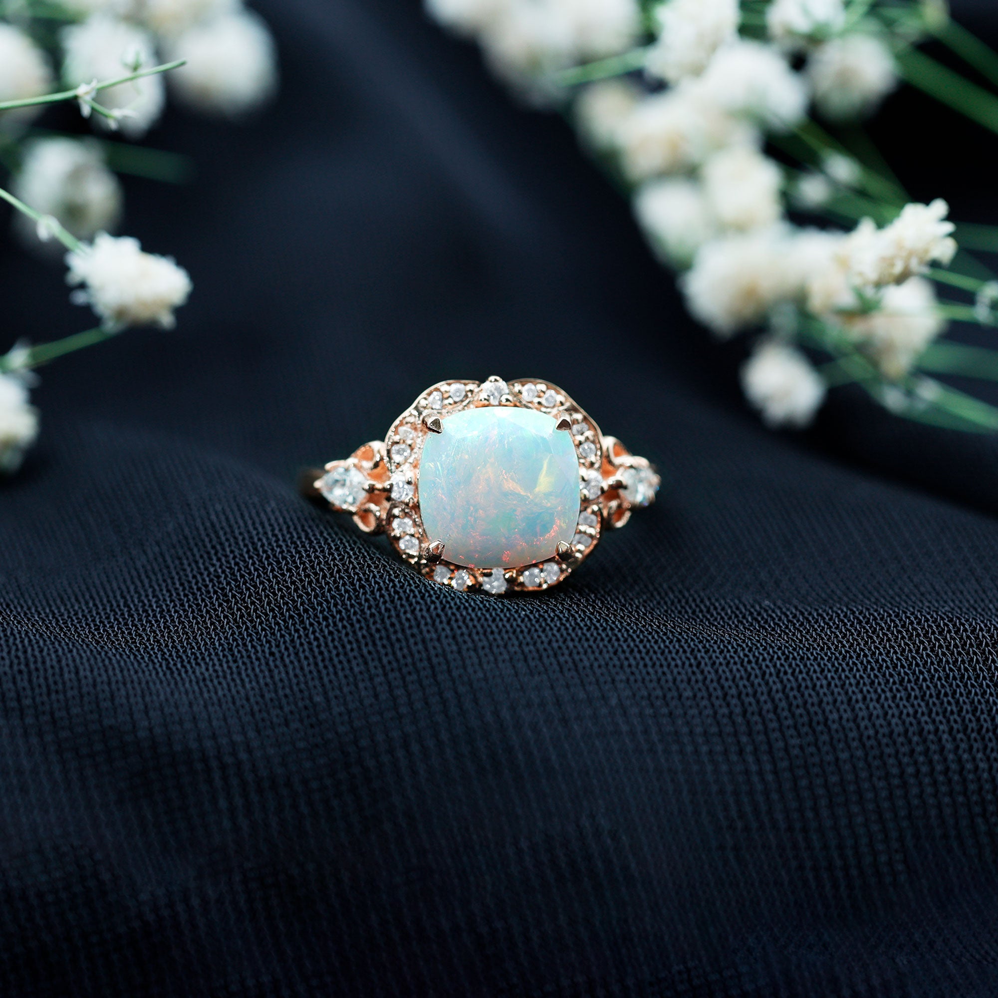 Prong, halo, pave are some of the popular settings for cushion cut gemstones.