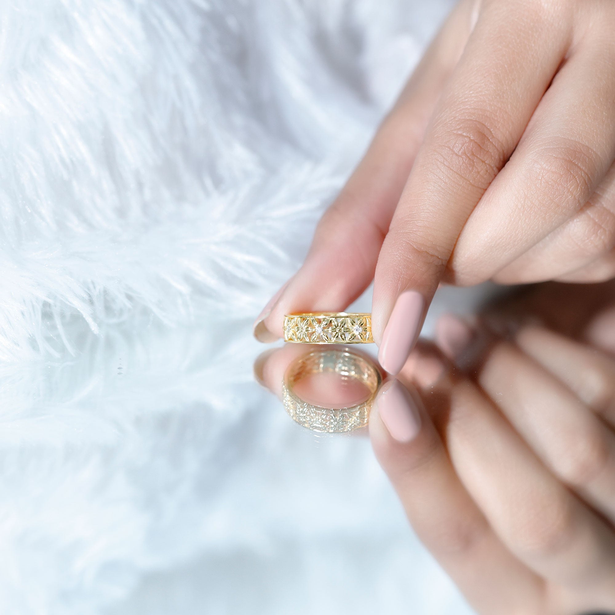 The process of crafting diamond rings for women by our experts takes into account the quality factors, that are the 4 C’s of Diamonds, diamond shapes and metal quality. In addition to quality assurance, we also aim at ensuring fair practices in trading at every step of our business operation. Thus we strictly employ the use of conflict free diamonds to craft a range of diamond solitaire rings, diamond vintage rings and more such diamond engagement ring styles.