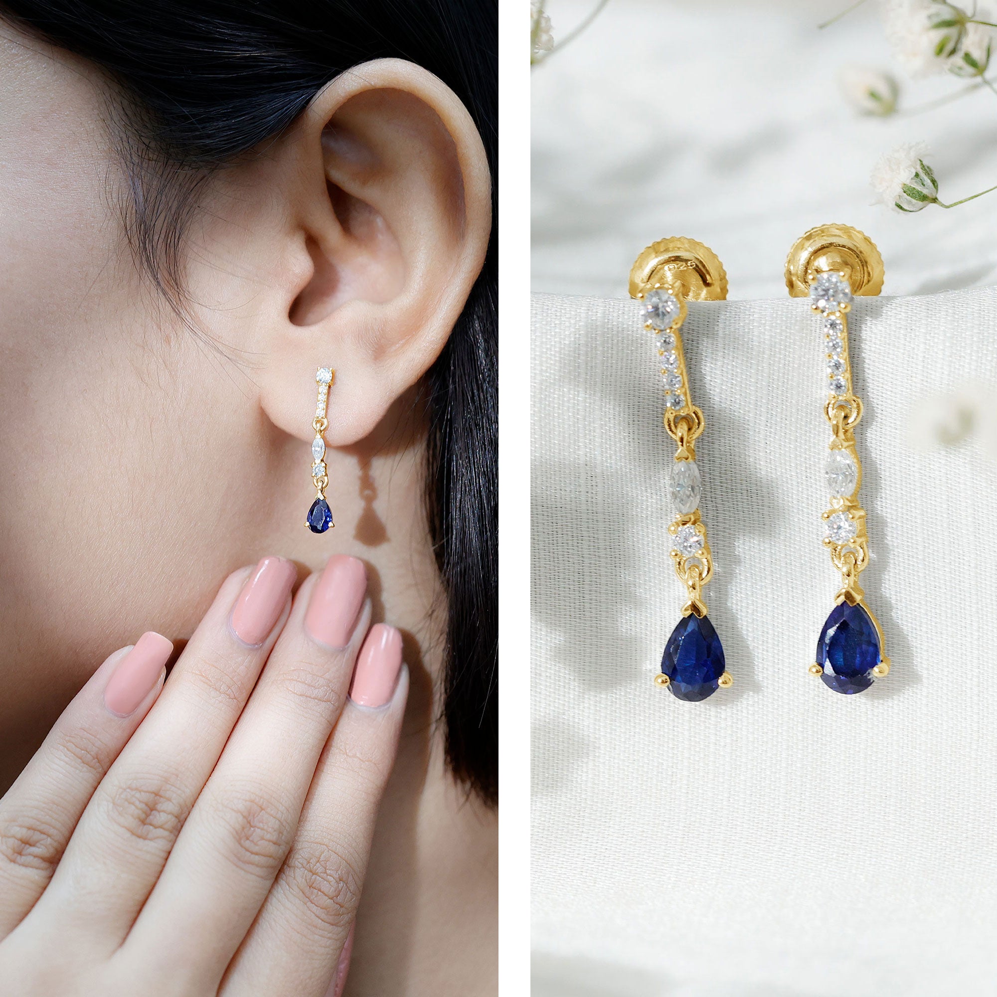 Versatile ear pieces: Gemstone earrings are versatile ear pieces that can effortlessly elevate your morning coffee dates or evening dinners. Whether you choose diamond studs for your denims or blue sapphire danglers for your wedding gown, you would love your choice.