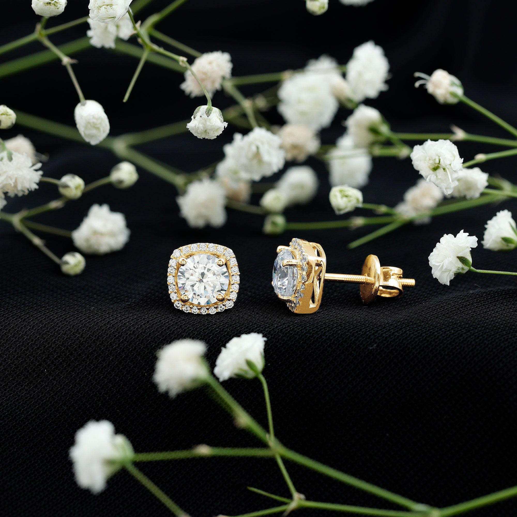 Halo Studs: Those who love extra sparkle, would definitely admire this design, which features a halo of small shining or colored gemstones, surrounding the center stone. Single, double or triple halo, not only increases the brilliance, but also offers added protection to the main gemstone.