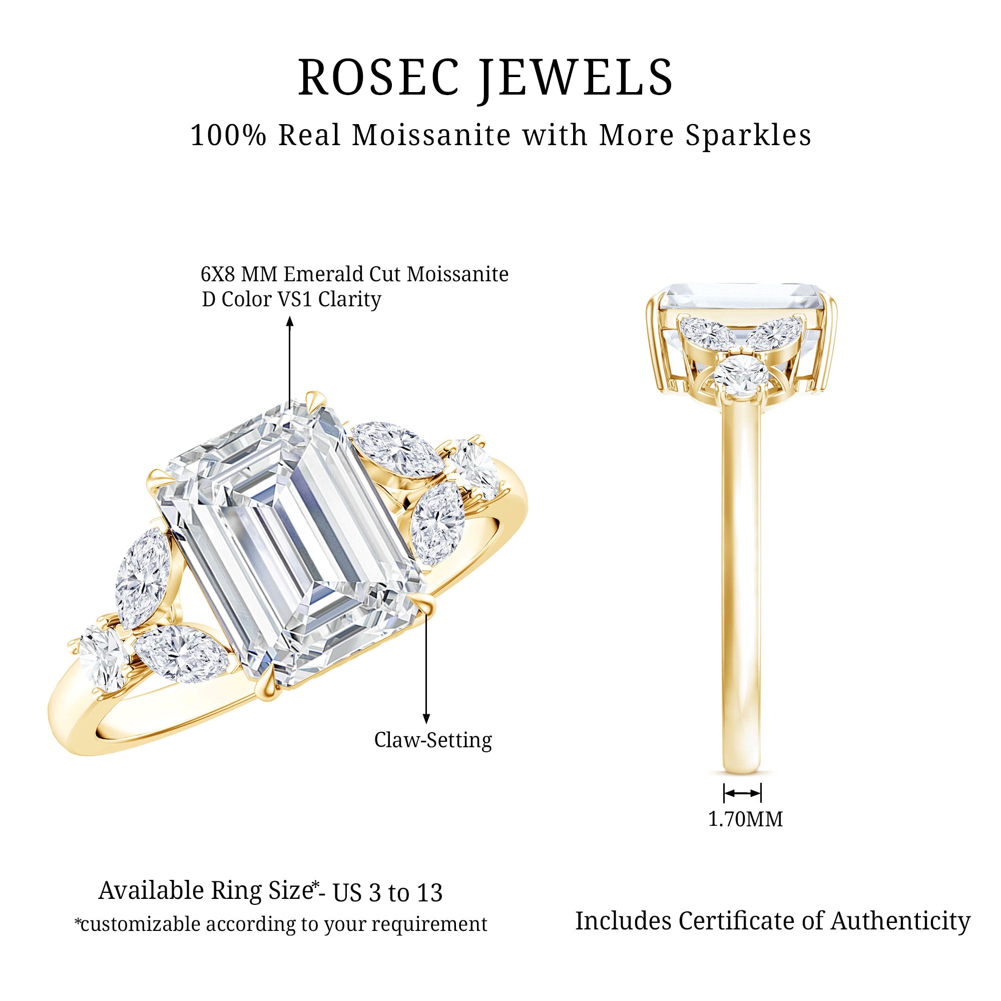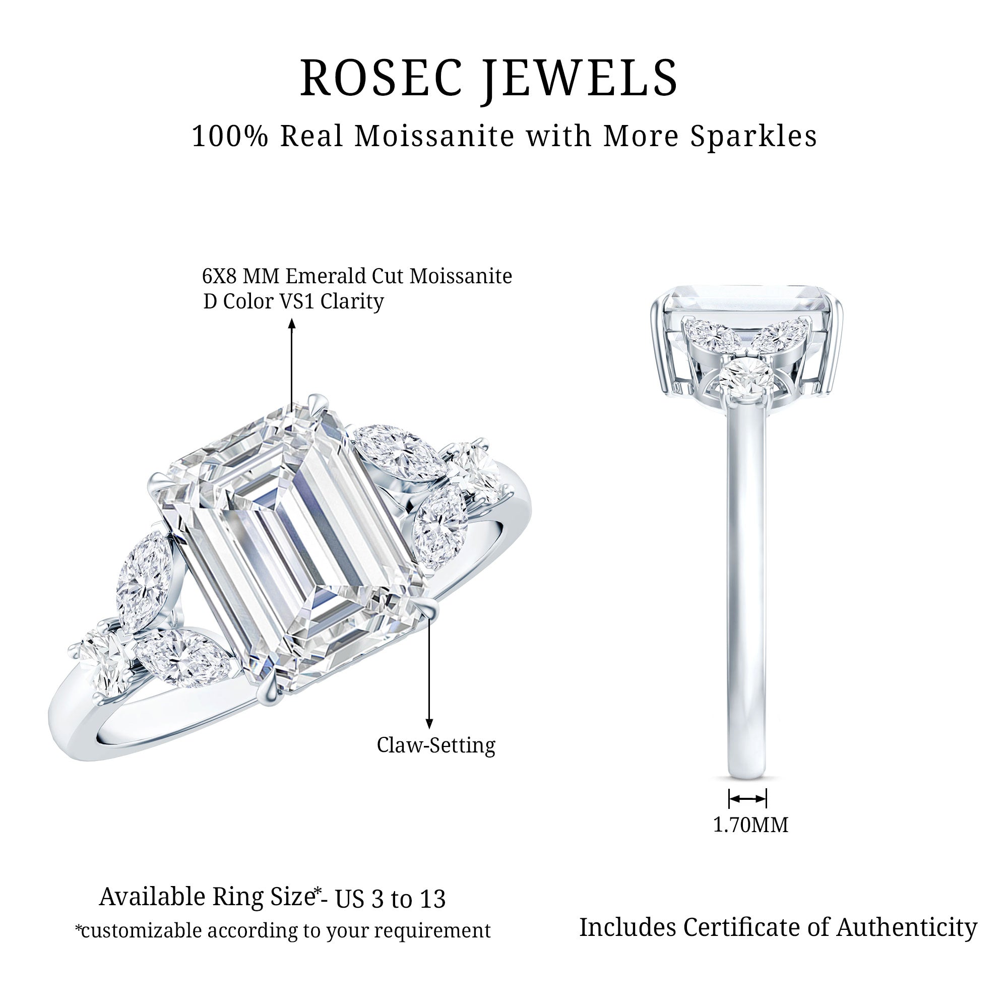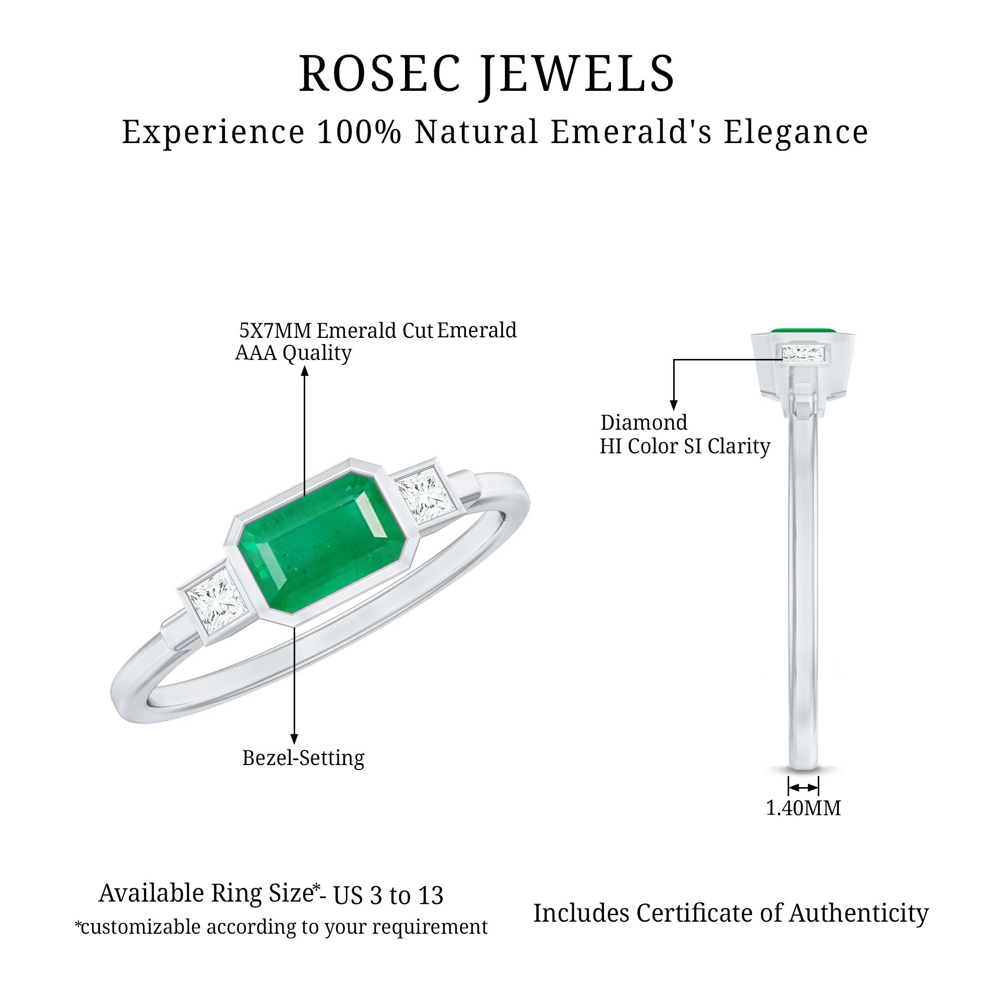 A Bright and Luxurious Choice: Vivid color of any gemstone is highlighted best in emerald cut as it emphasises on its clarity, depth, and elegance. A stunning visual effect created in emerald cut gemstone, makes the gemstone appear larger and more radiant. Overall beauty of the ring is enhanced by an emerald cut.