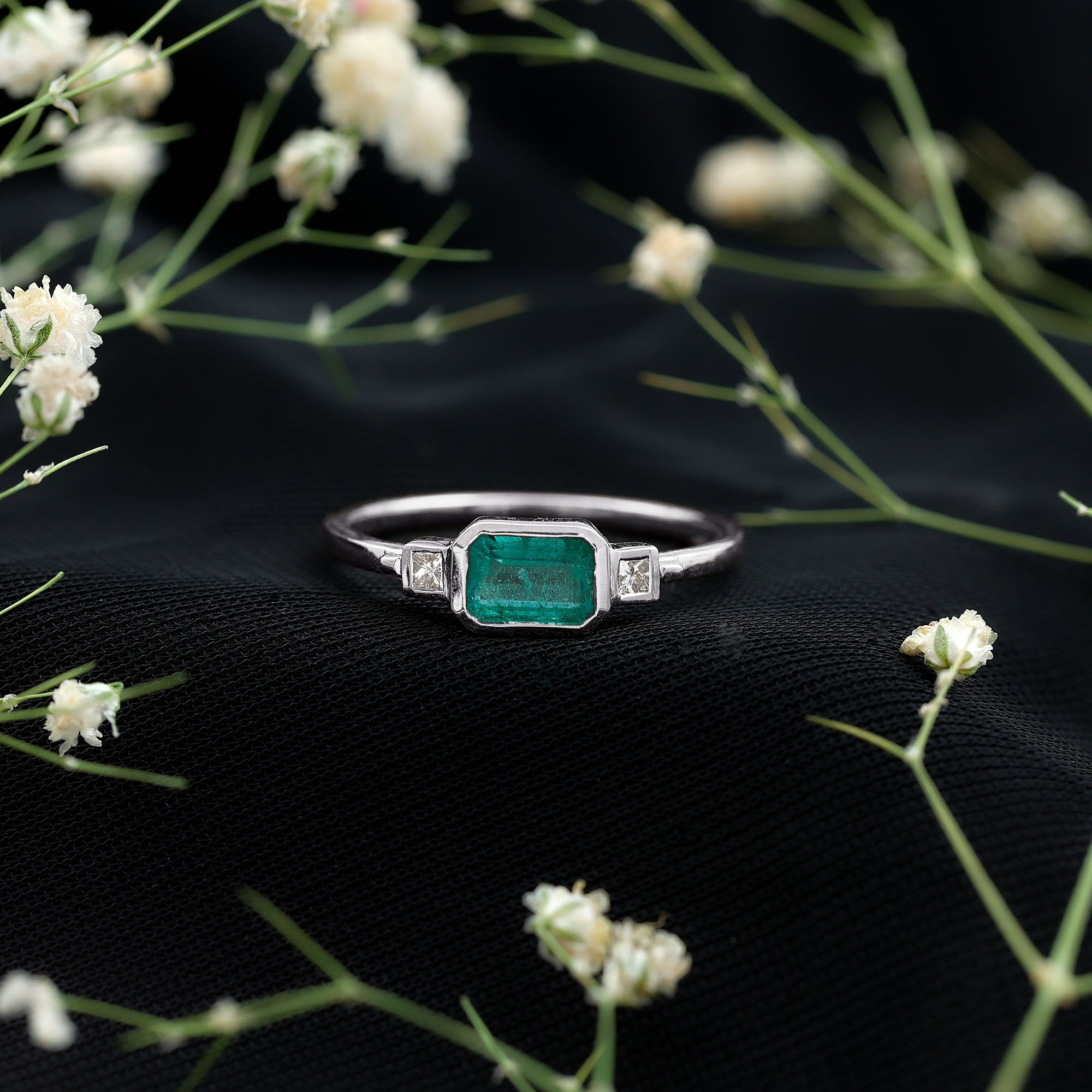 Three Stone Setting: Three emerald cut gemstones of similar or different sizes are placed for a stunning and sparkling appeal. A three stone emerald cut ring is not only strikingly beautiful, but deeply meaningful too.