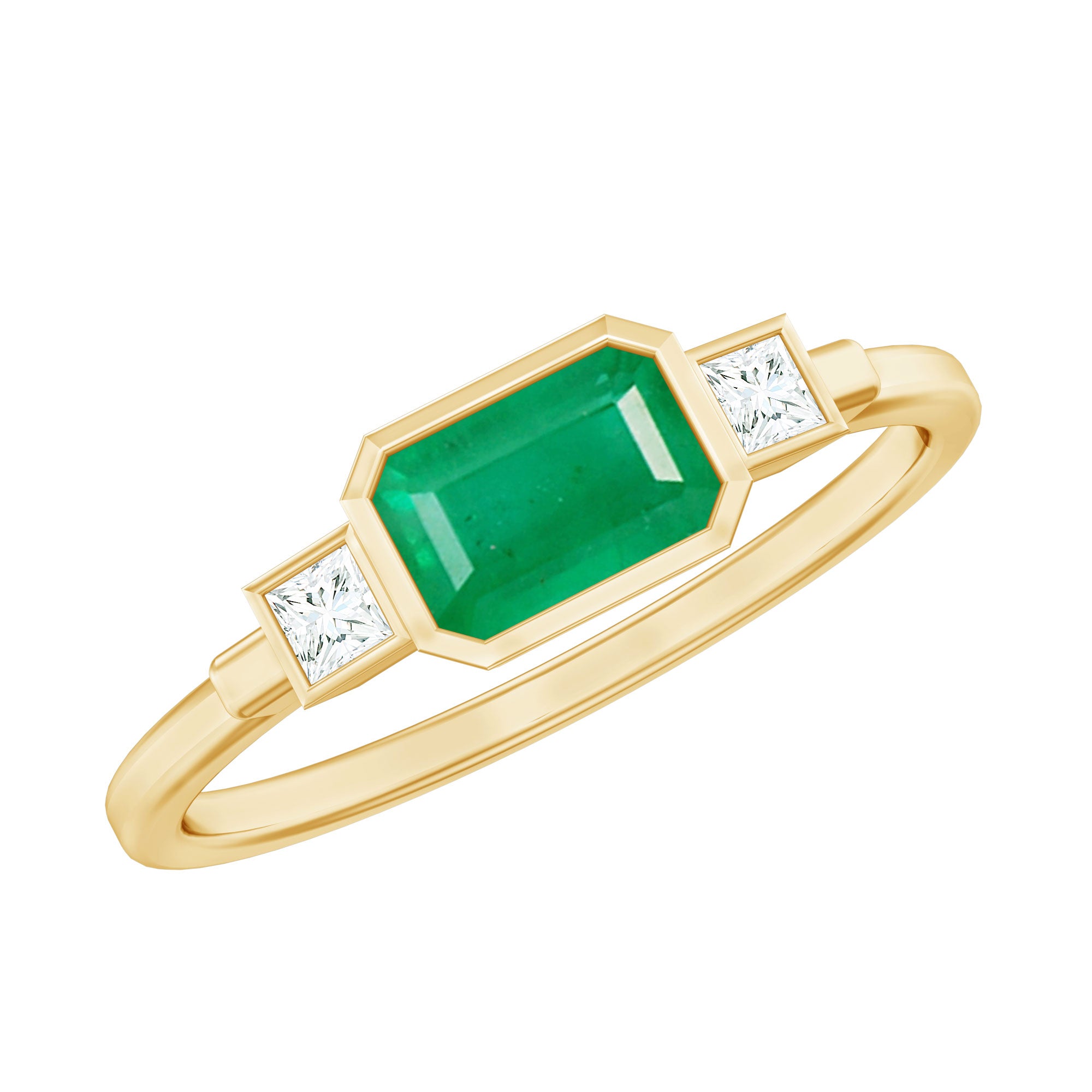 East west Setting: East west setting is just the opposite of traditional North south orientation of the gemstone. This horizontal placement of the stone transforms its look and appeal completely in any type of emerald cut engagement ring.