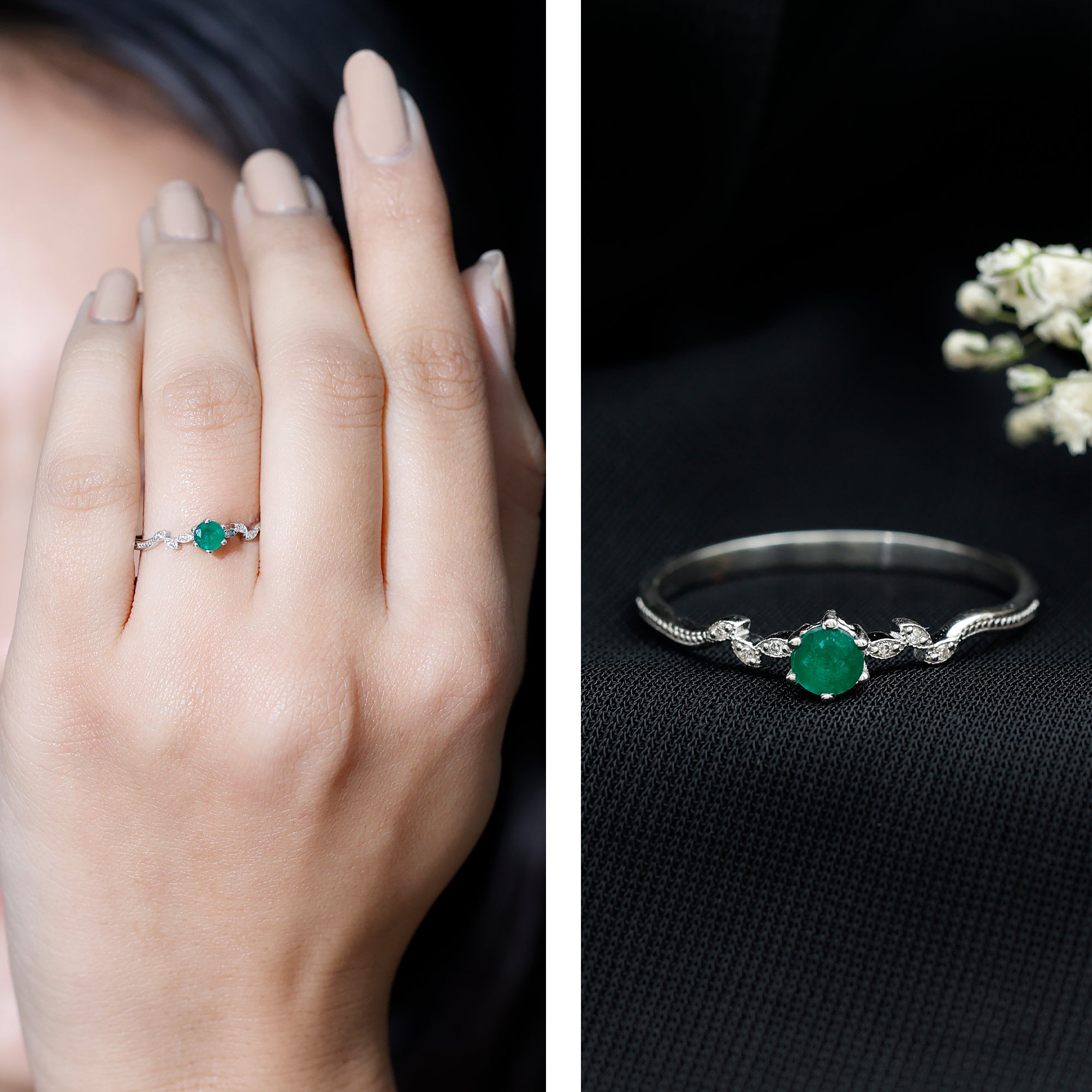 Emerald Nature Inspired Rings: - Commonly feature designs inspired by the natural world, showcasing evocative flowers and leaves. The sleek design of a flower emerald ring features a green emerald that reflects the rich colors found in earth's nature. A symbol of renewal, growth, and harmony, our exquisite nature-inspired rings ensure beauty and timeless allure. The nature-themed emerald leaf ring is a fashionable option for nature and jewelry lovers.