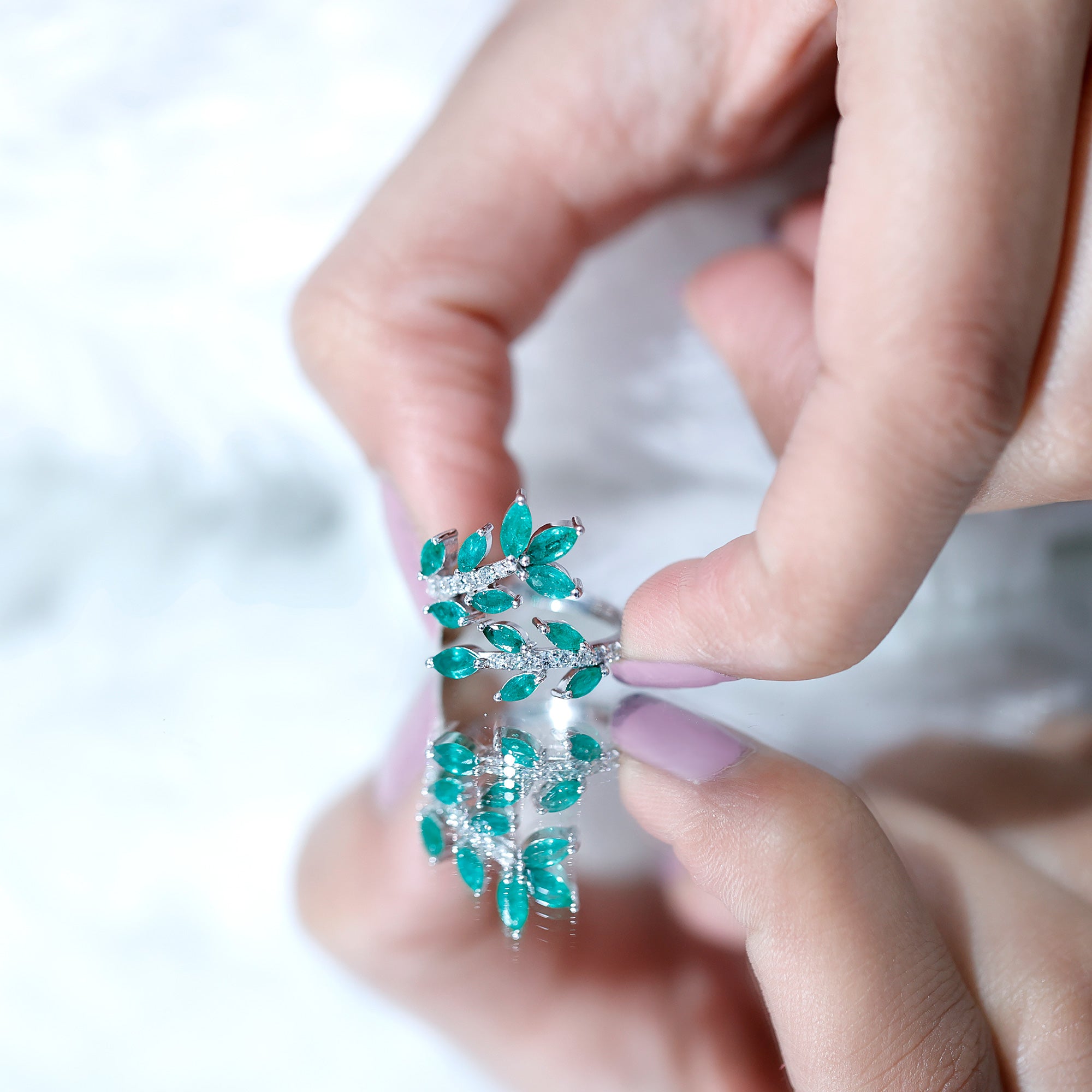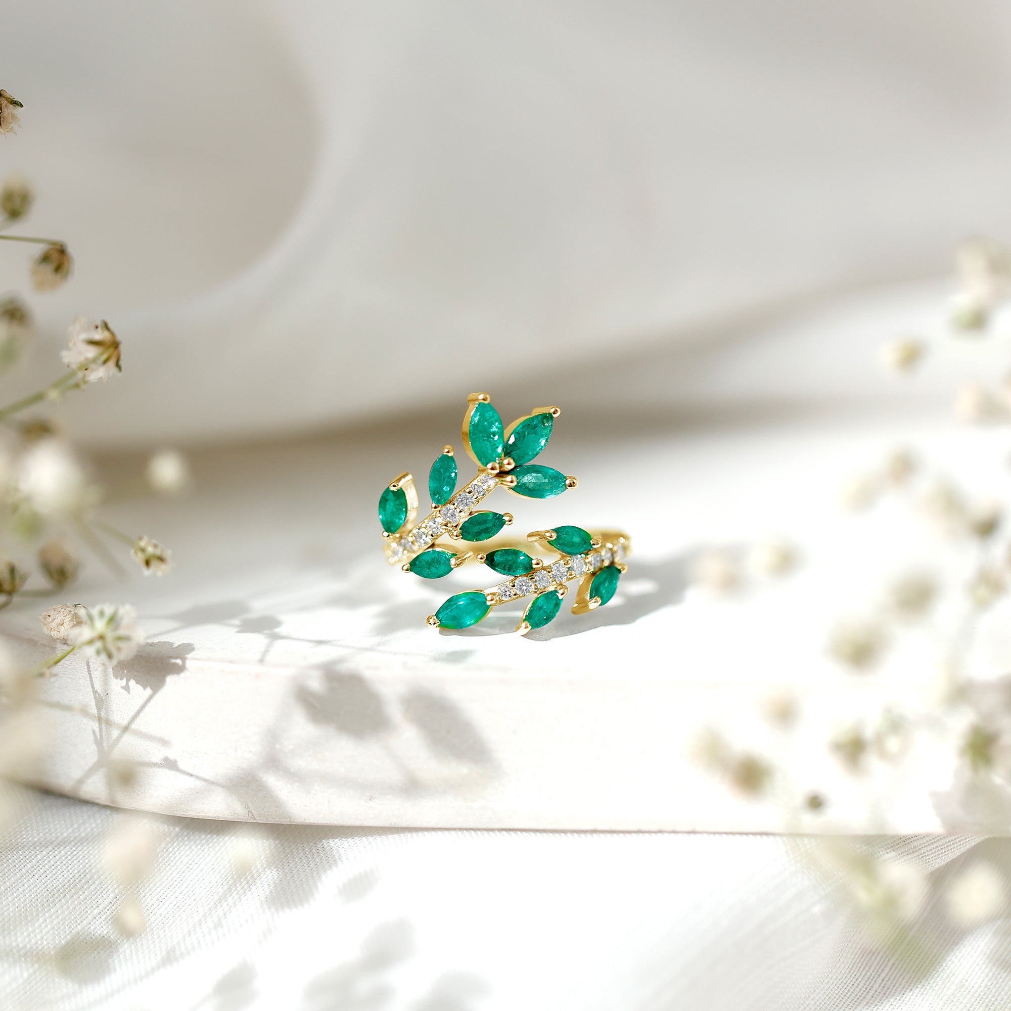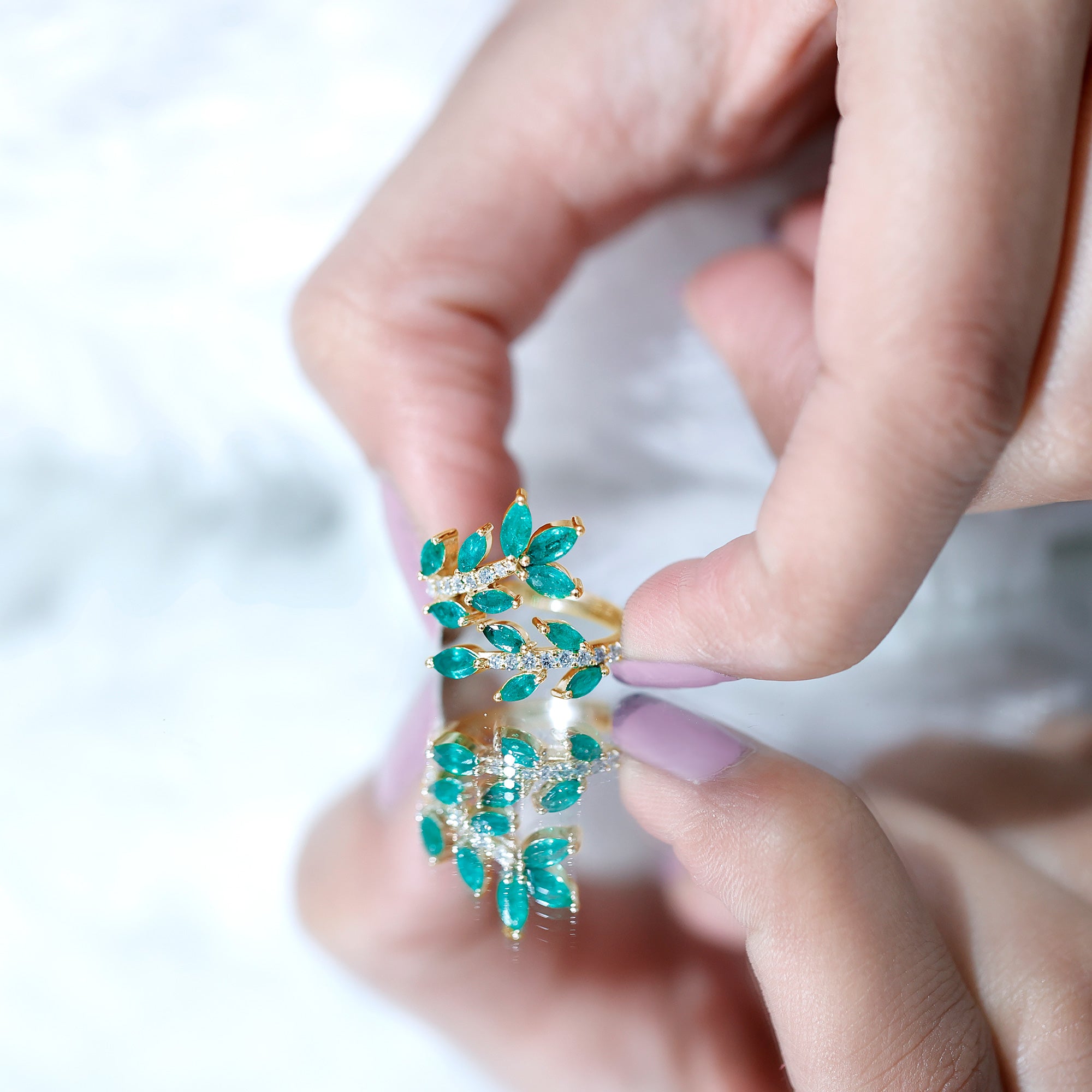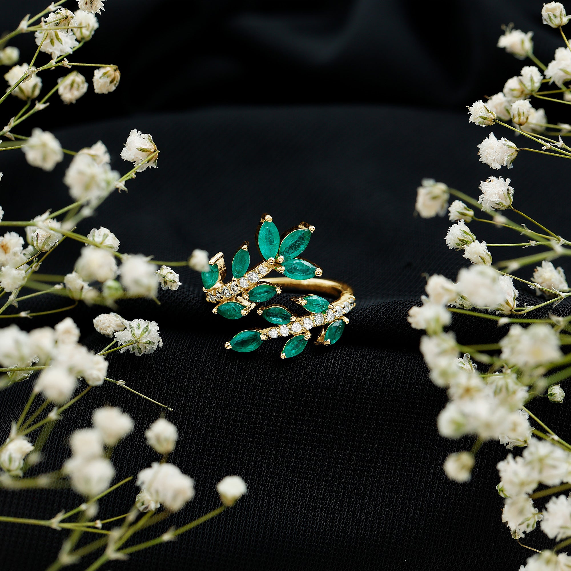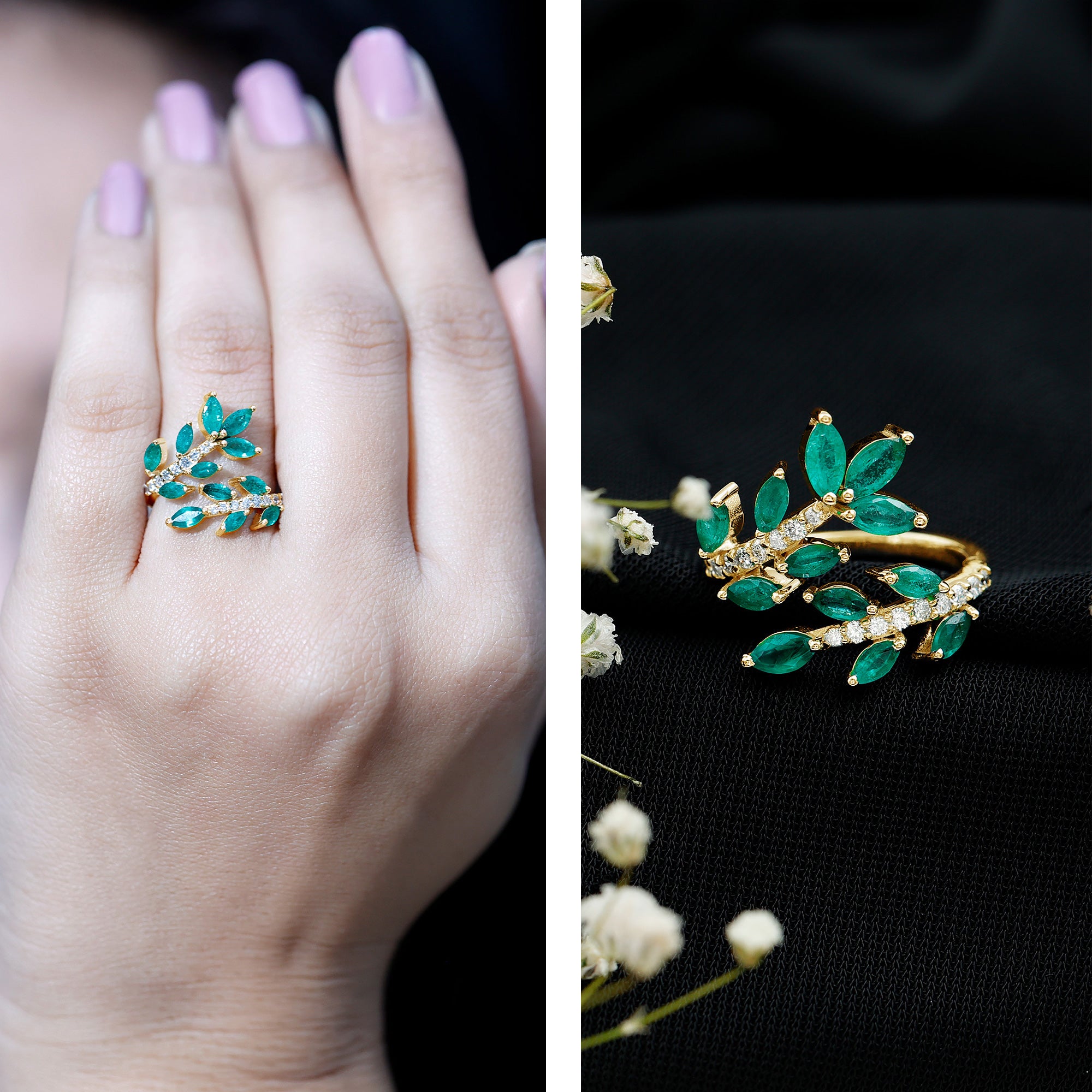 Emerald Nature Inspired Rings: - Commonly feature designs inspired by the natural world, showcasing evocative flowers and leaves. The sleek design of a flower emerald ring features a green emerald that reflects the rich colors found in earth's nature. A symbol of renewal, growth, and harmony, our exquisite nature-inspired rings ensure beauty and timeless allure. The nature-themed emerald leaf ring is a fashionable option for nature and jewelry lovers.