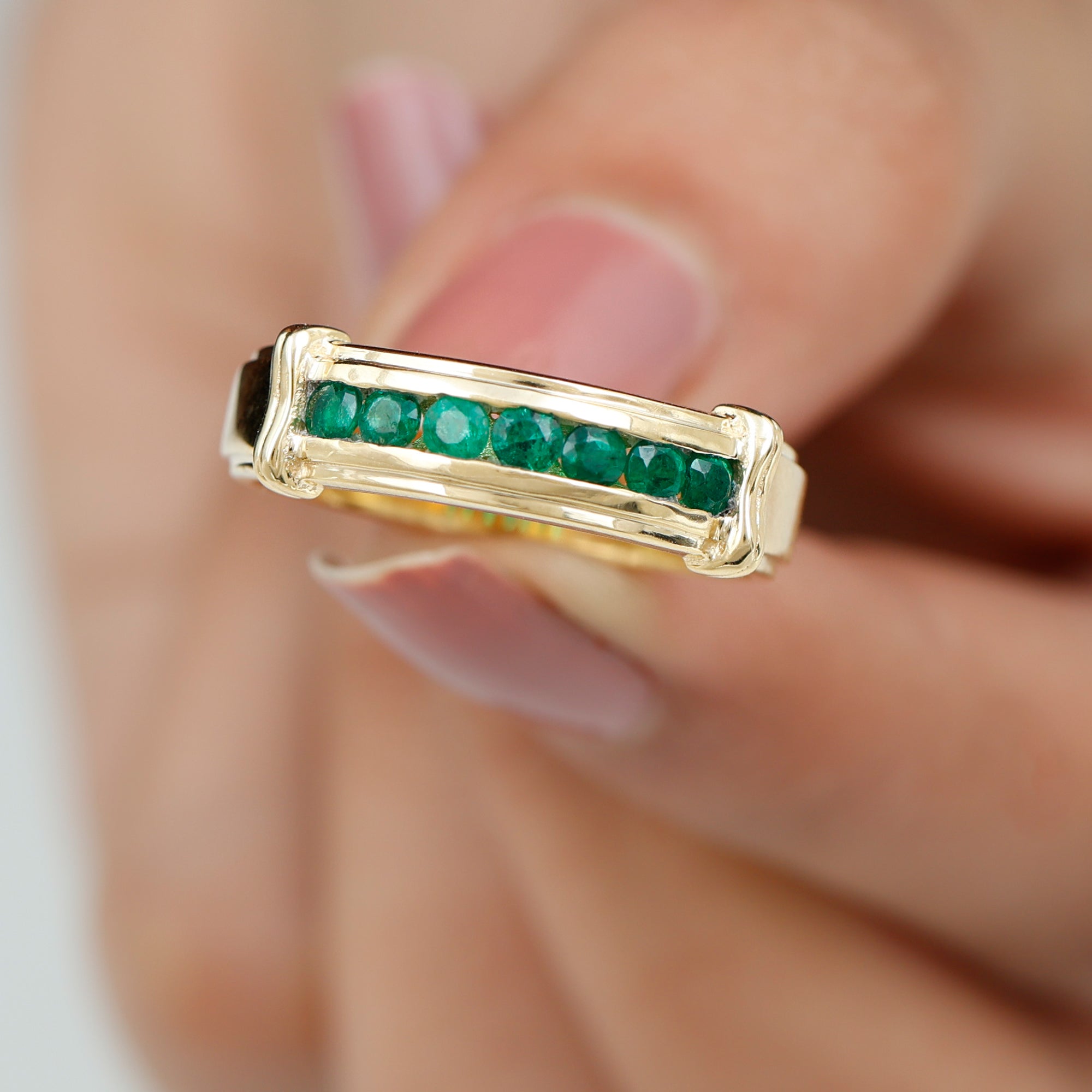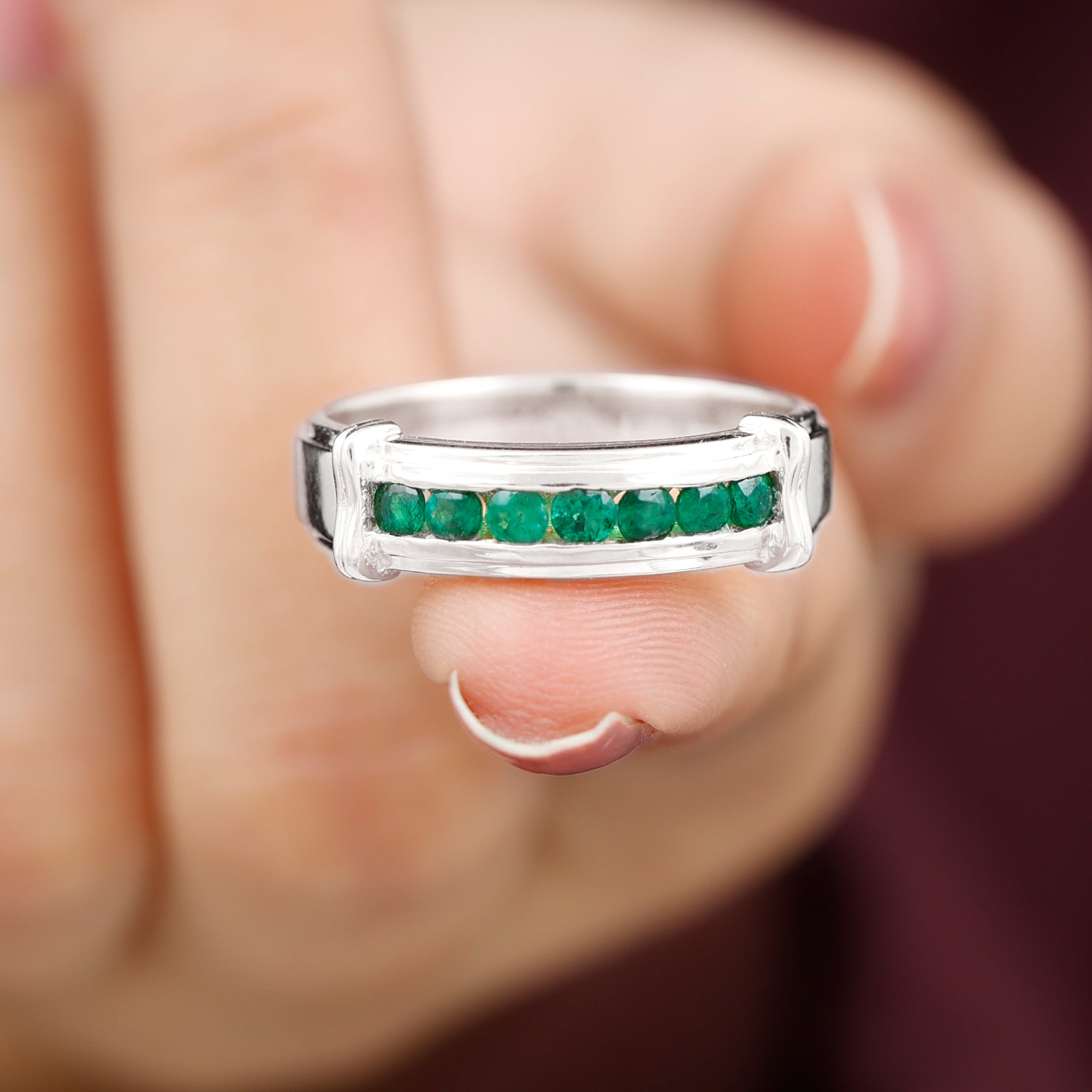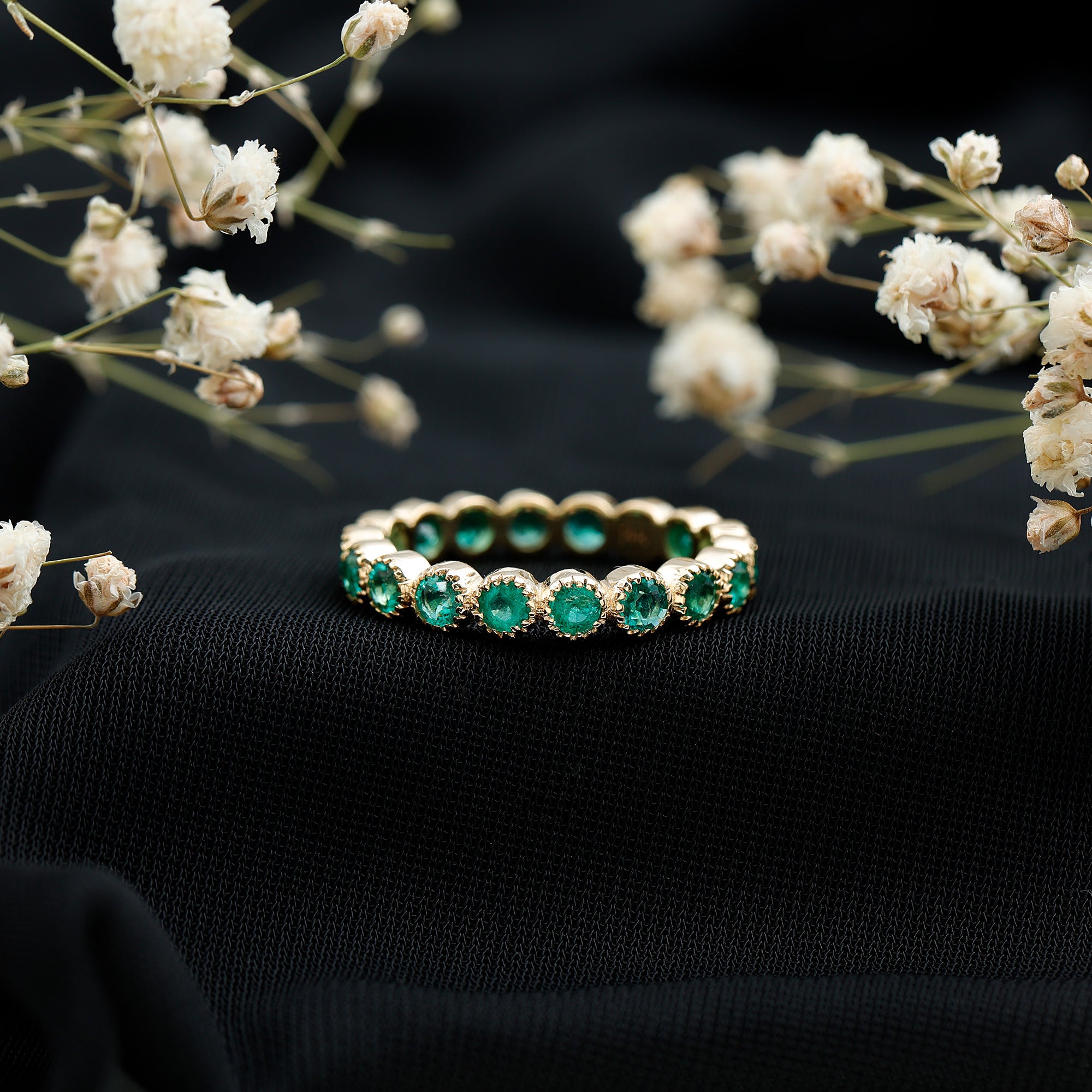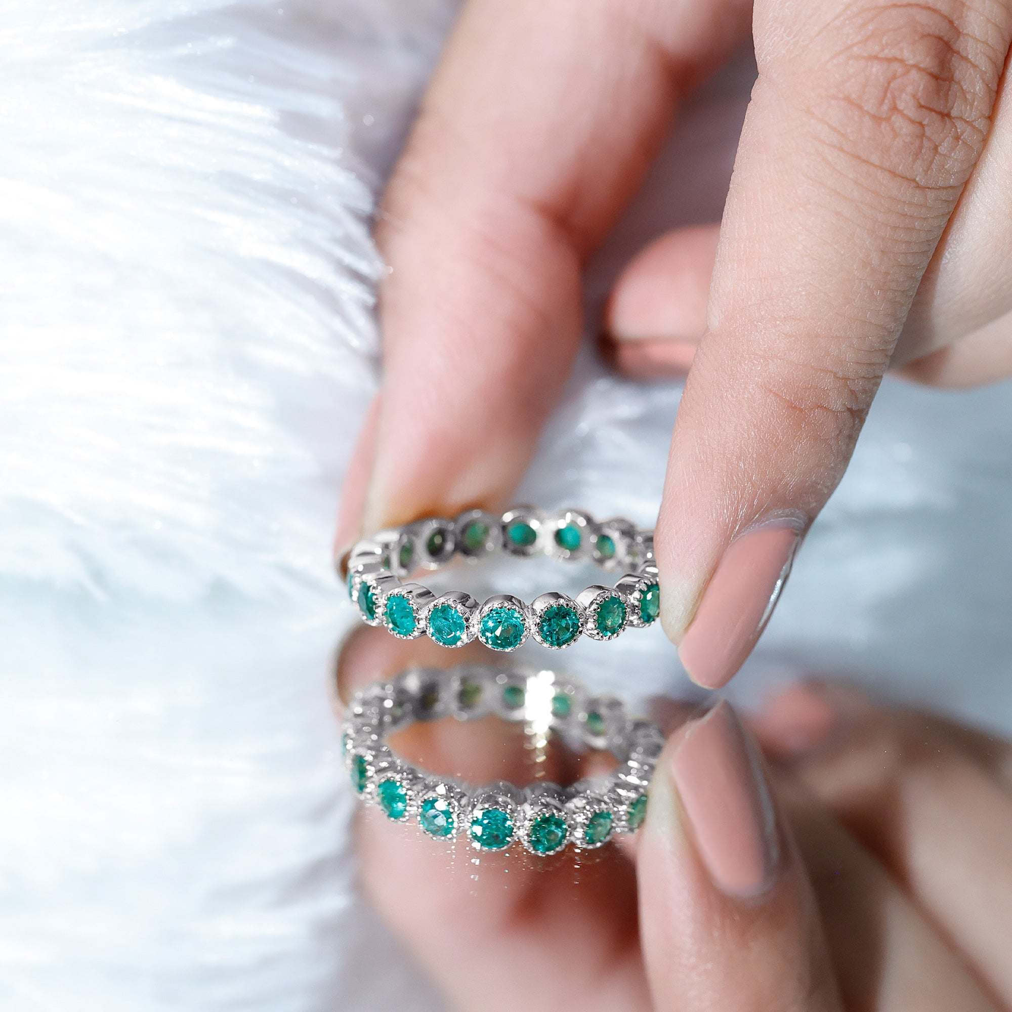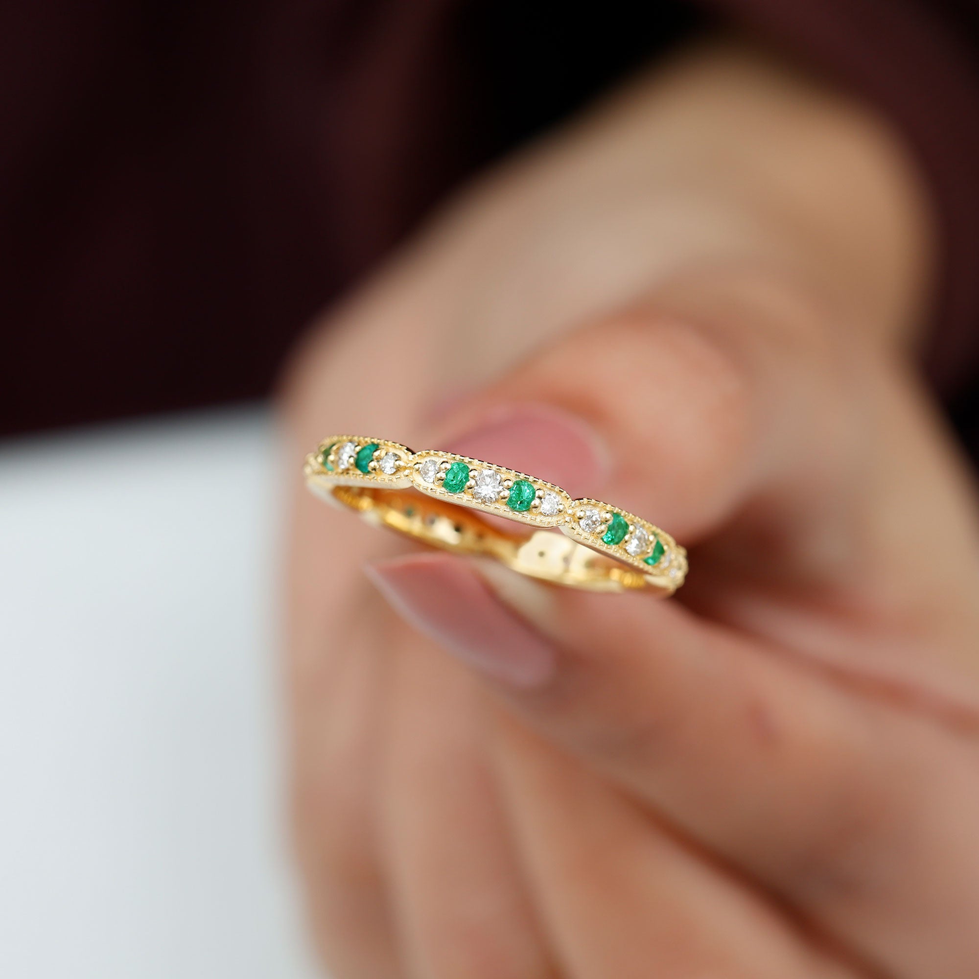 Half-eternity bands offer comfort for daily wear, while full-eternity styles deliver maximum emerald coverage and visual impact.