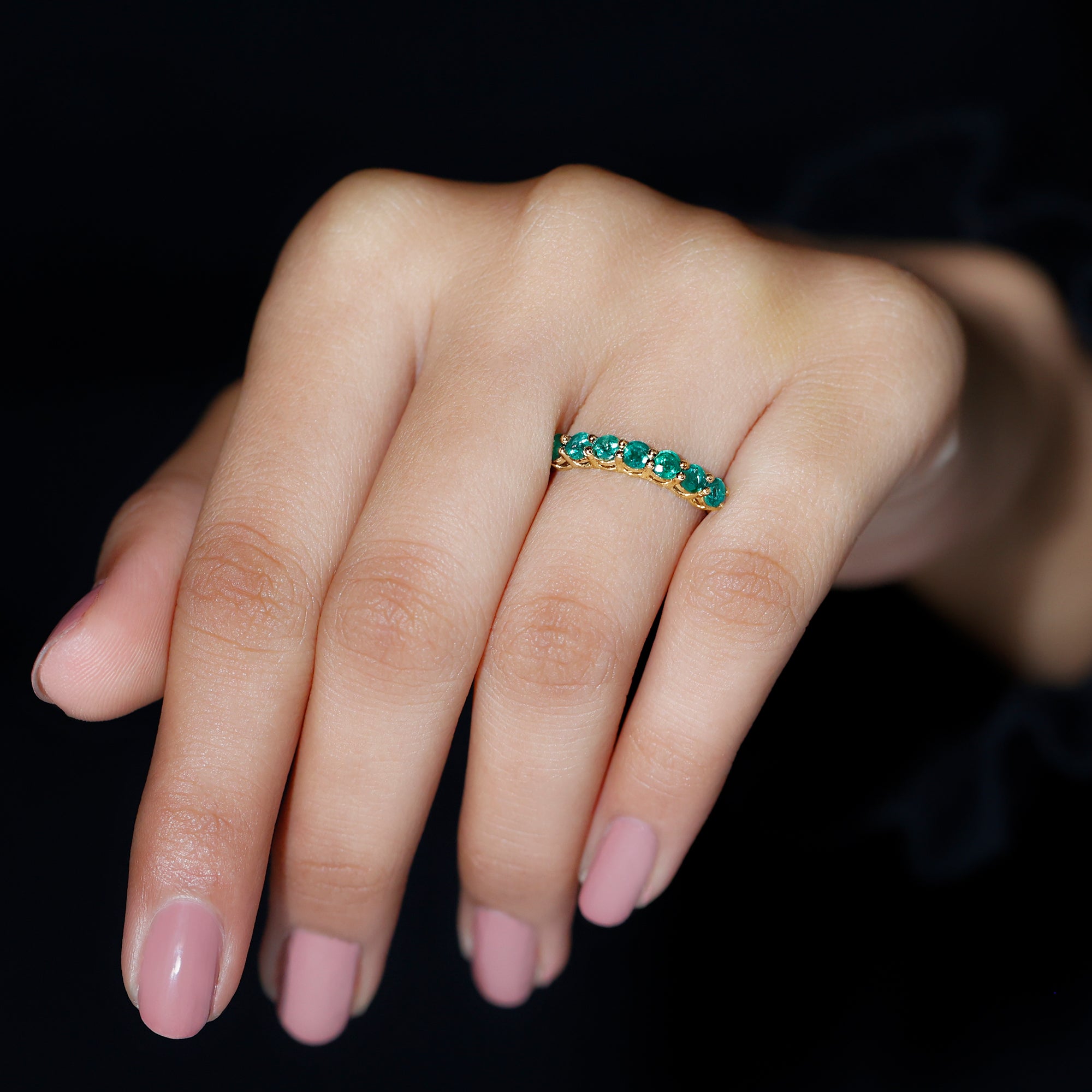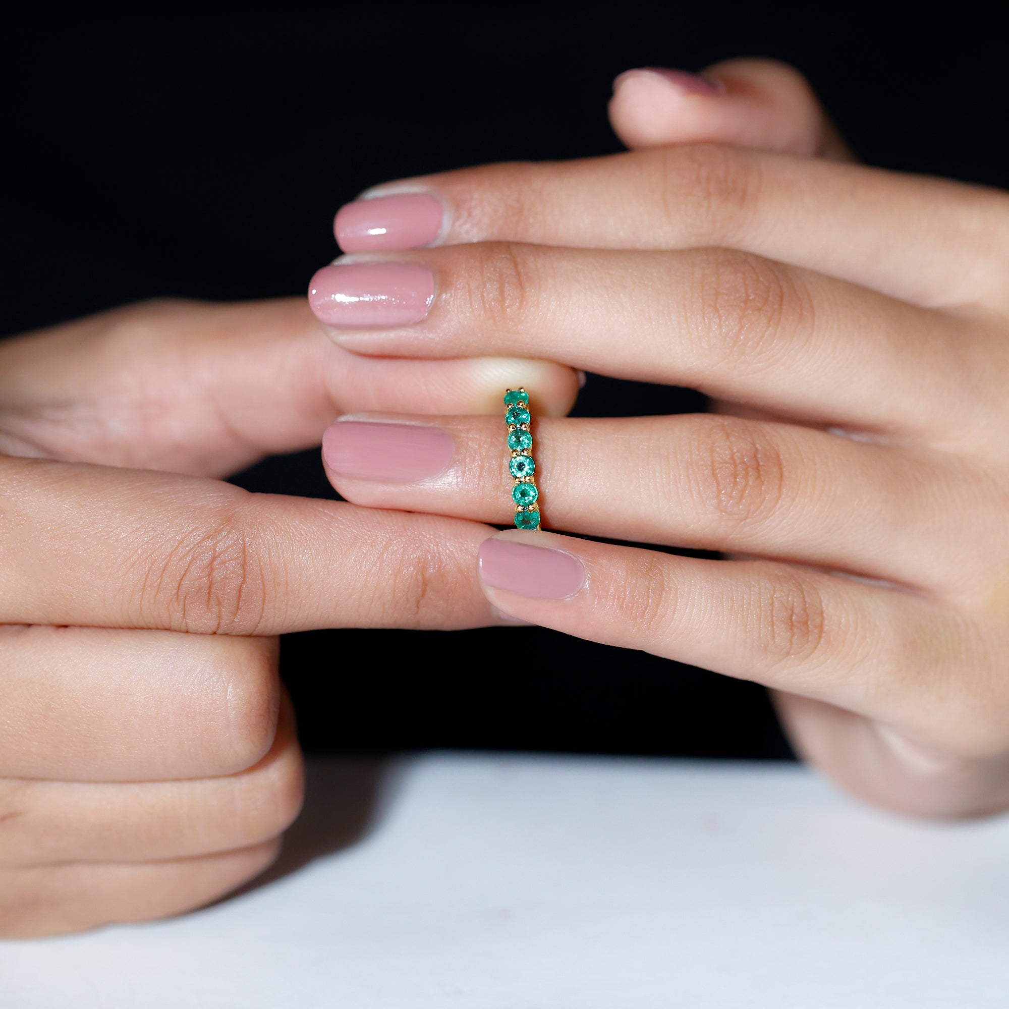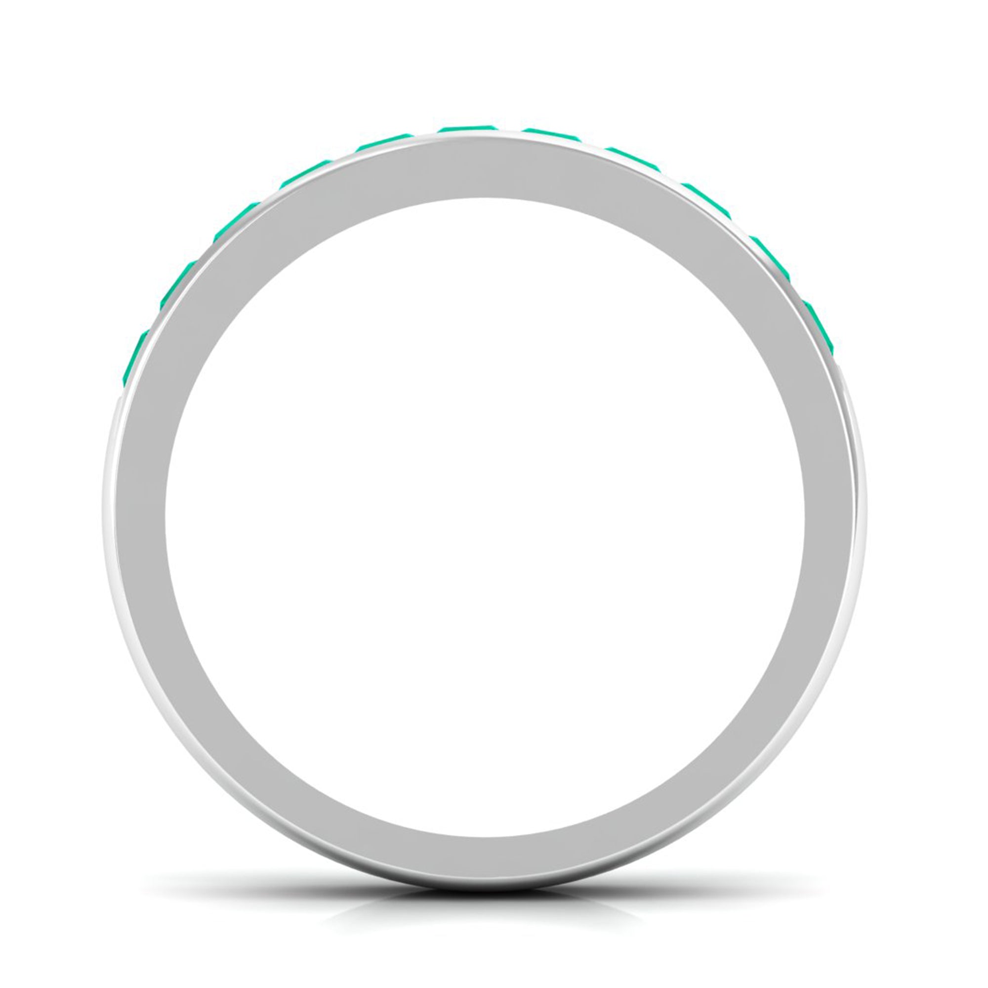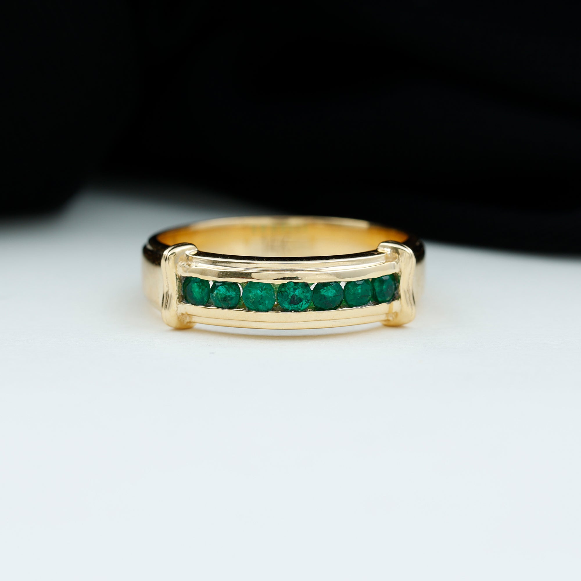 Half-eternity bands offer comfort for daily wear, while full-eternity styles deliver maximum emerald coverage and visual impact.