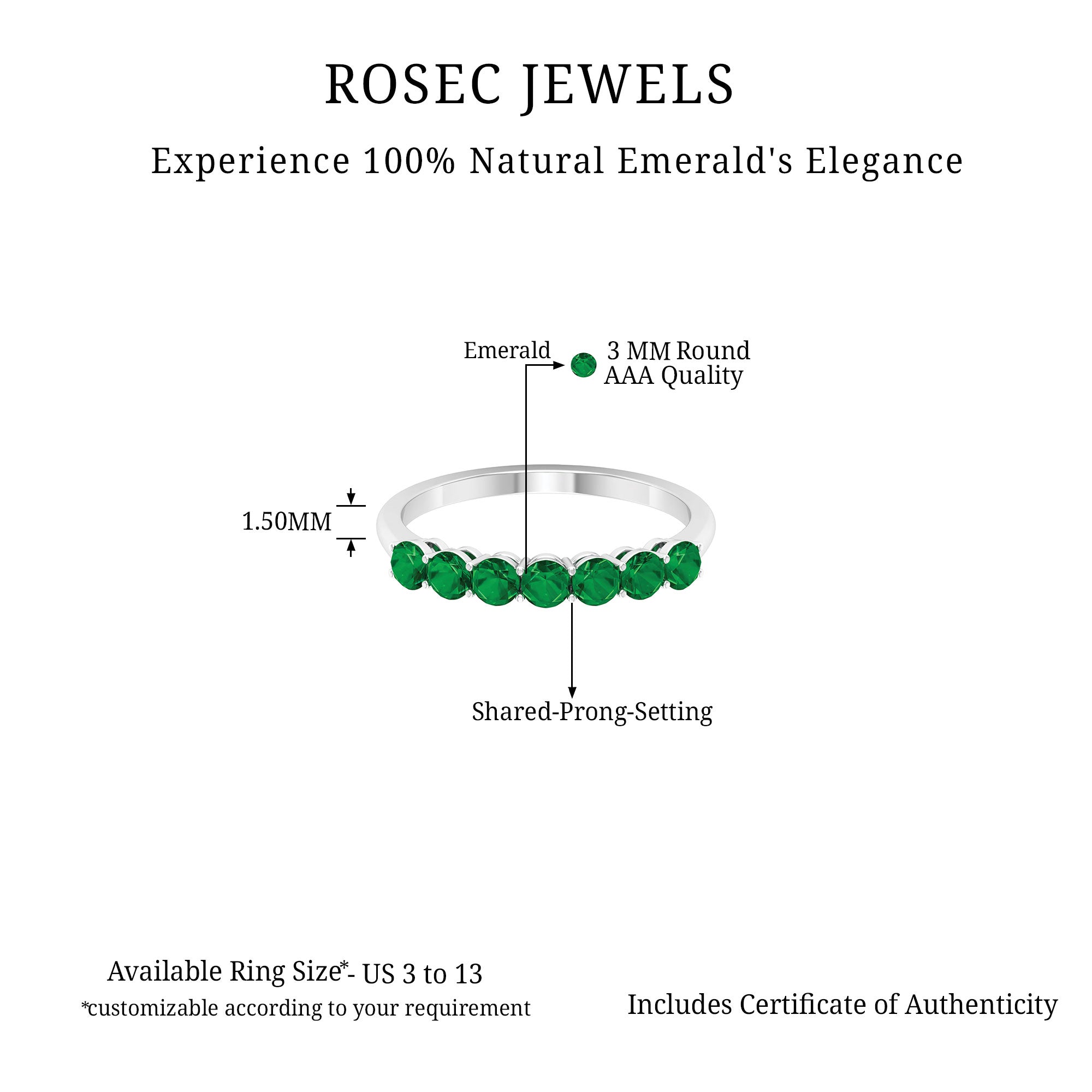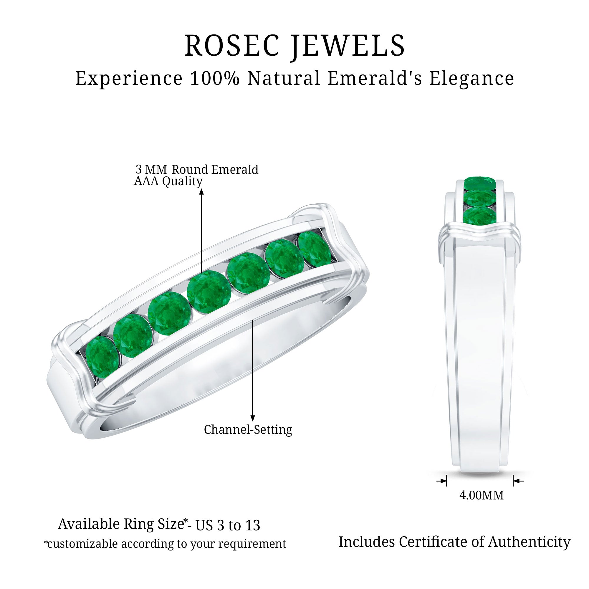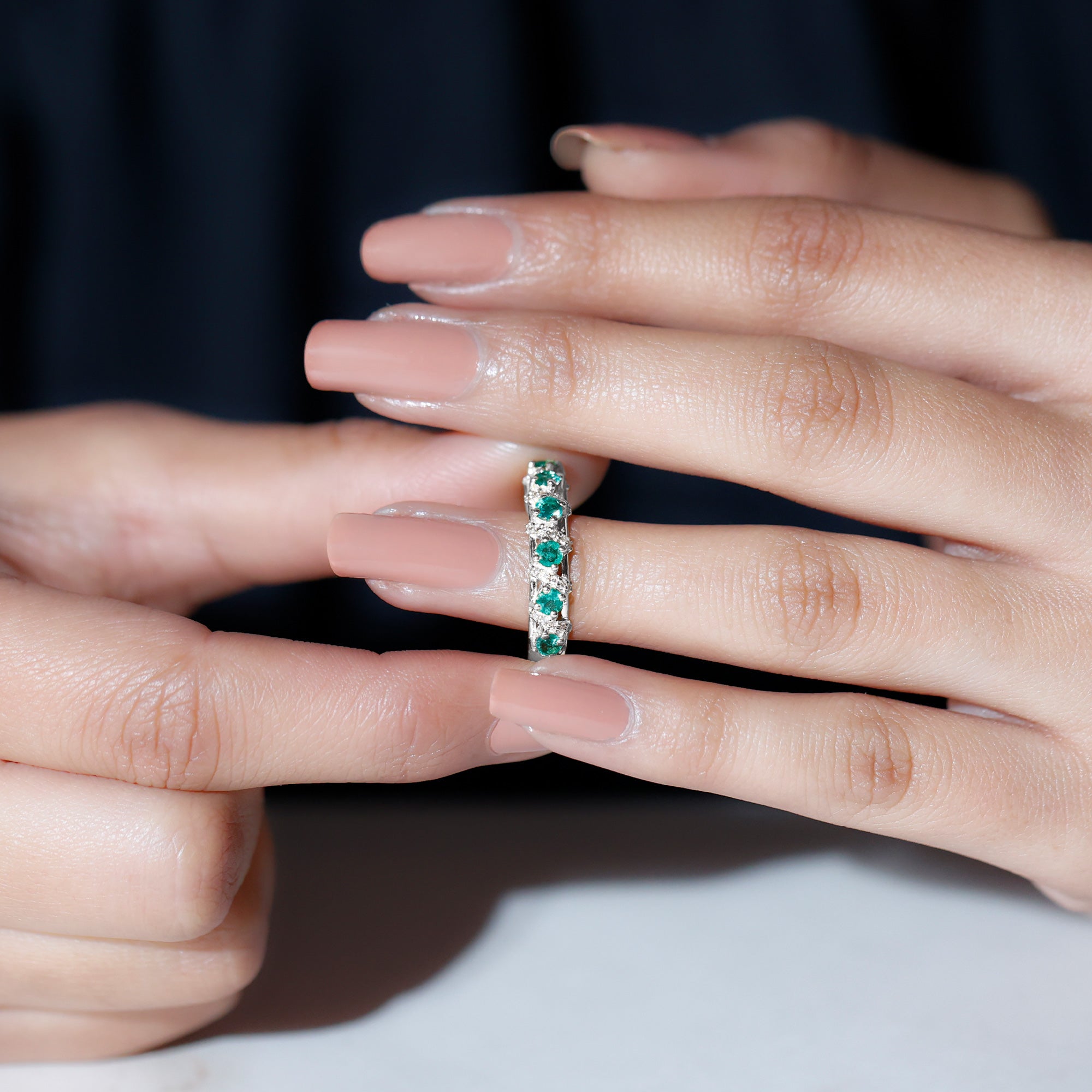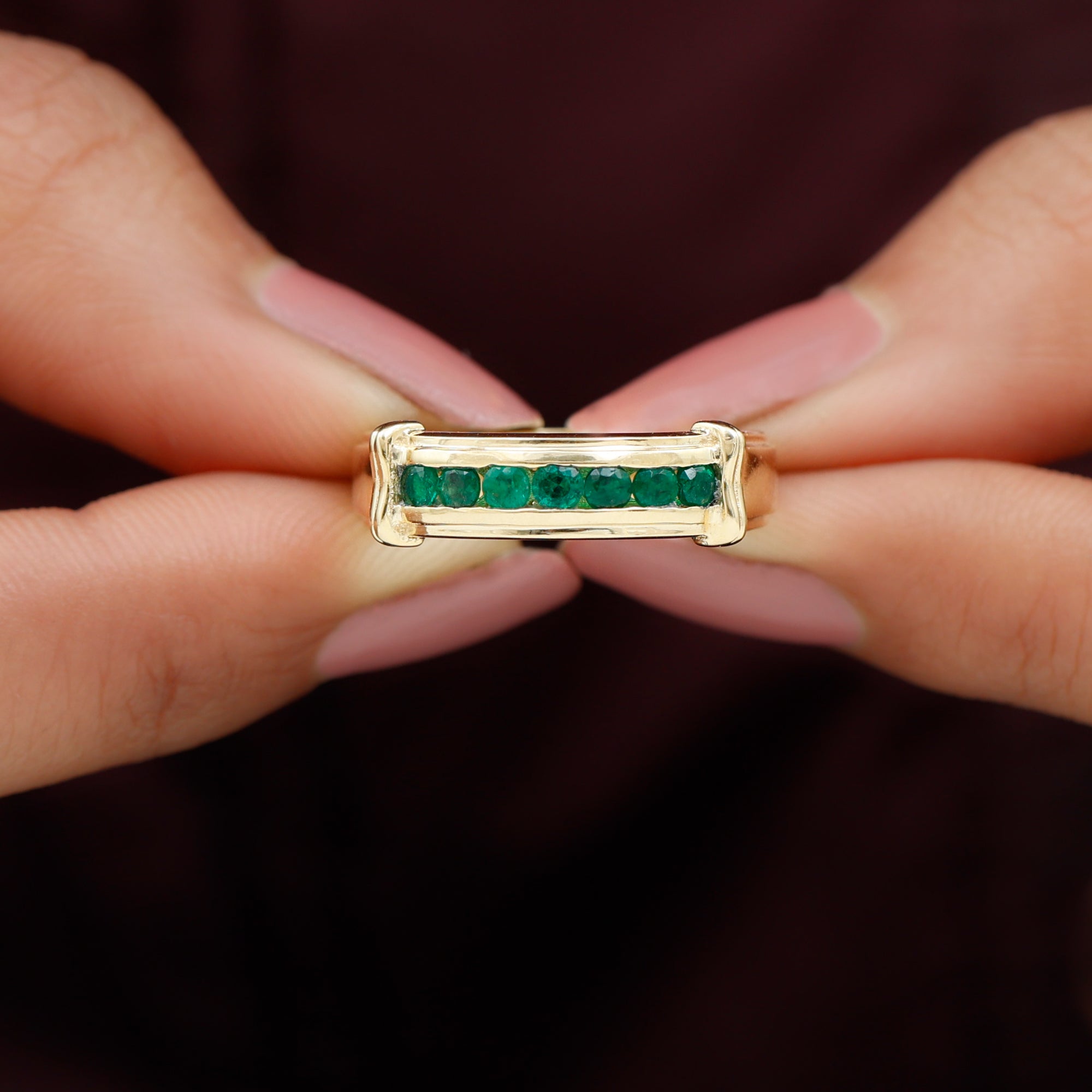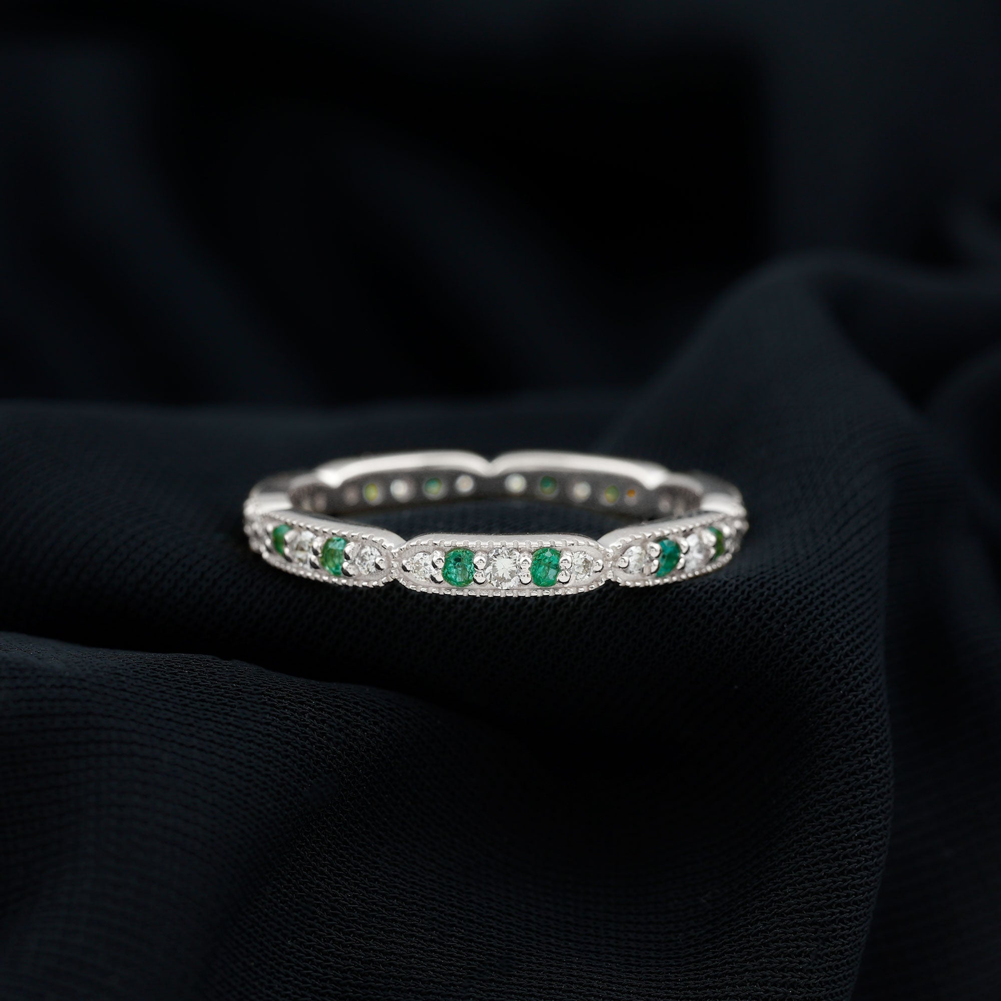 Half-eternity bands offer comfort for daily wear, while full-eternity styles deliver maximum emerald coverage and visual impact.