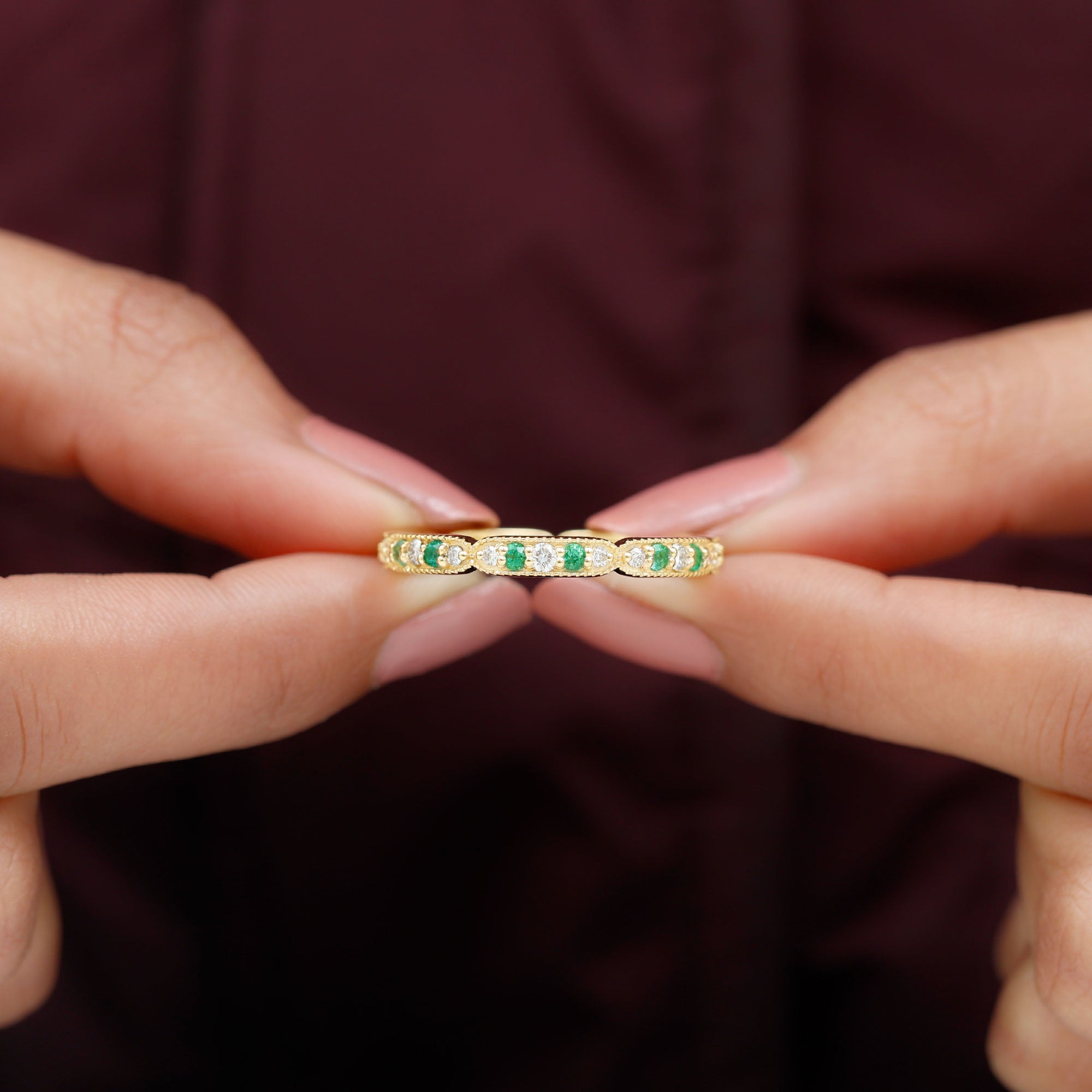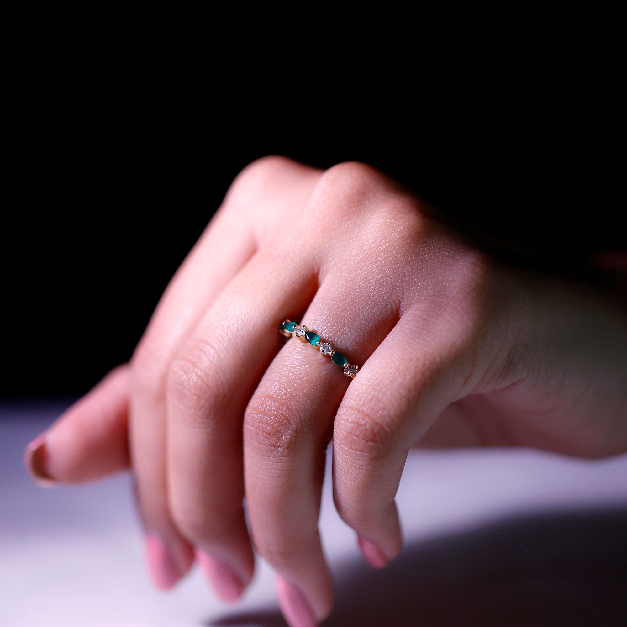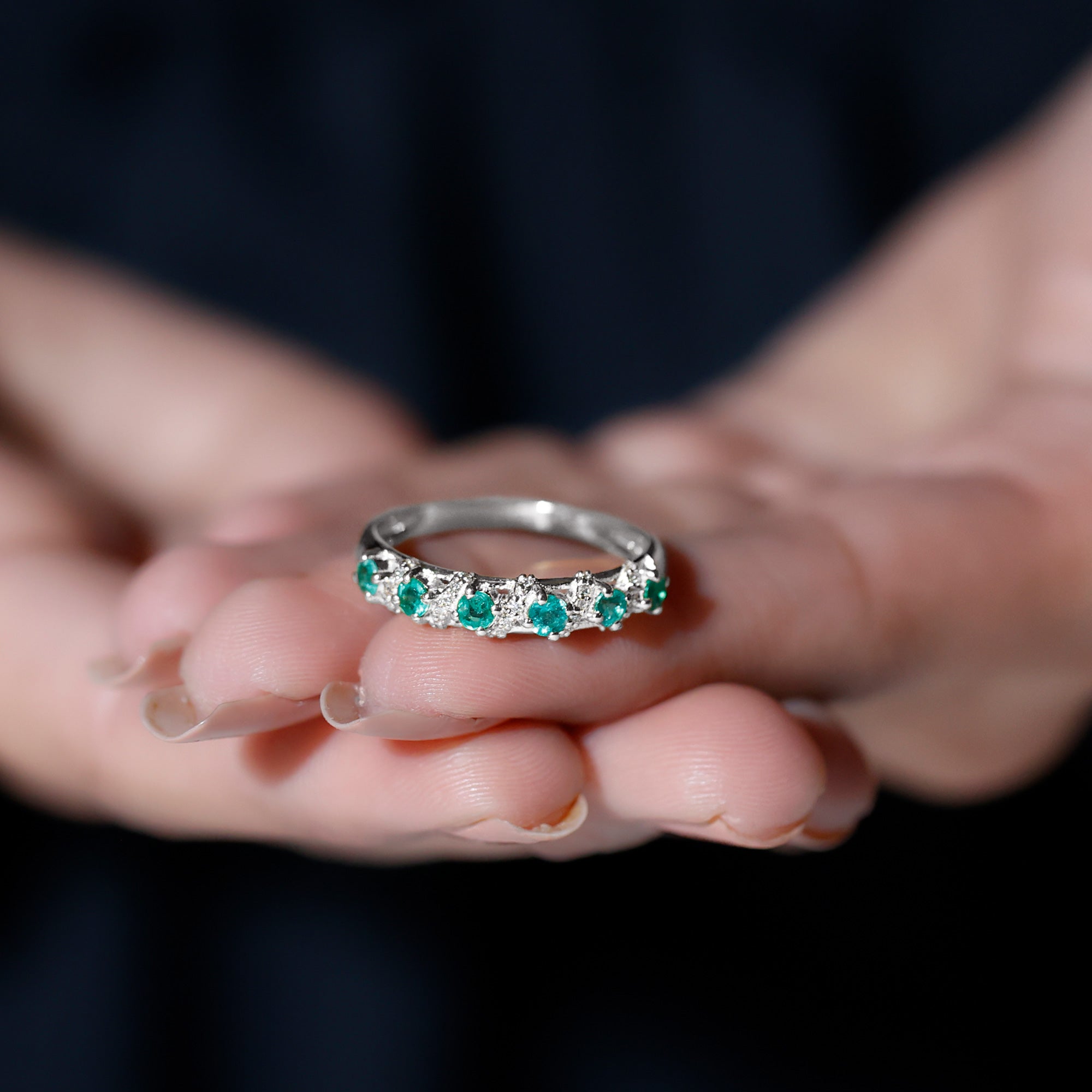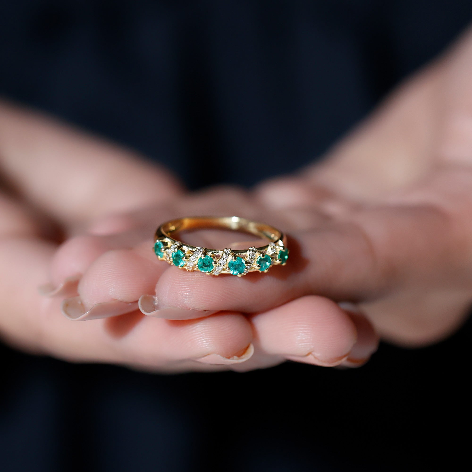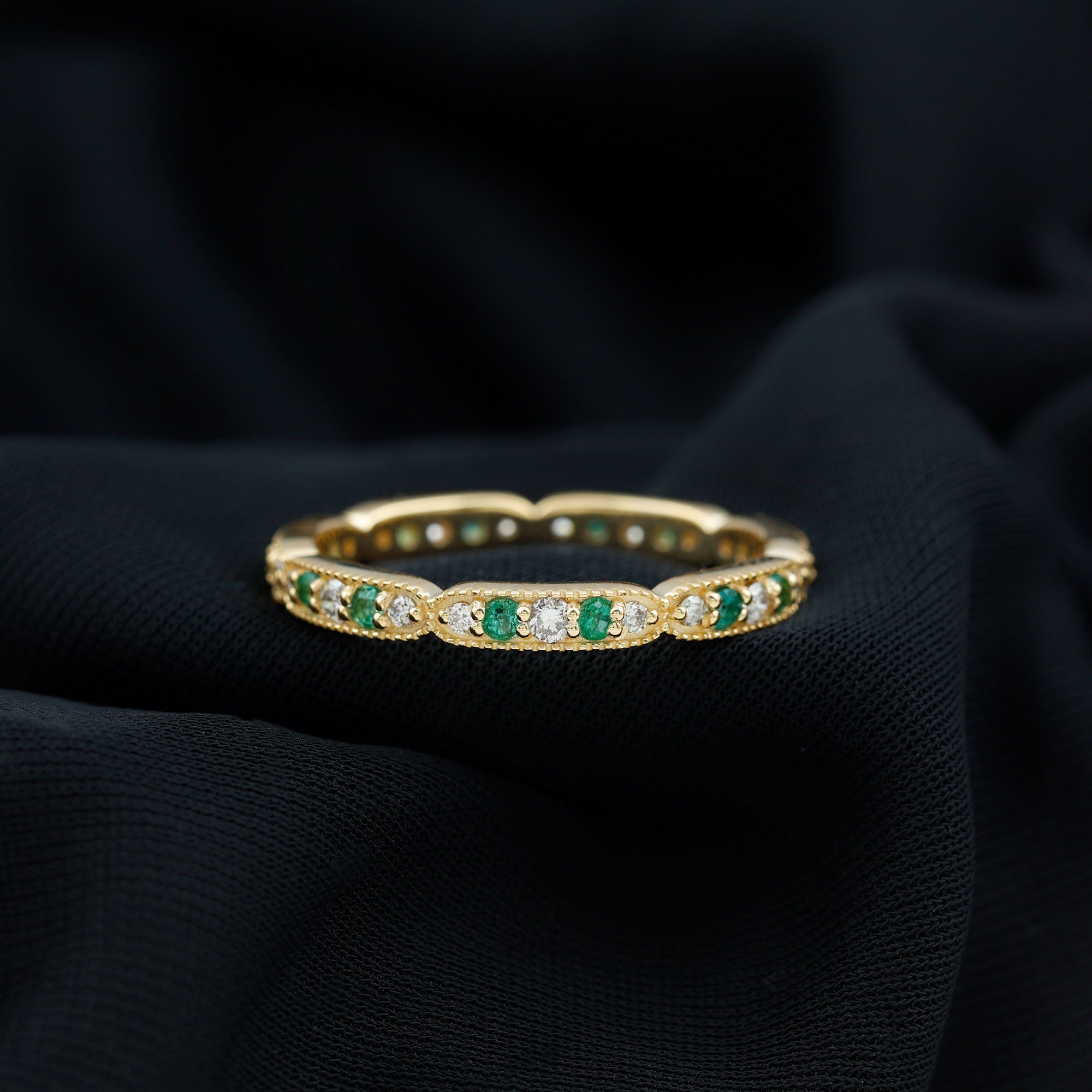 Half-eternity bands feature emeralds across the top portion of the ring, while full-eternity bands circle the entire band with gemstones.