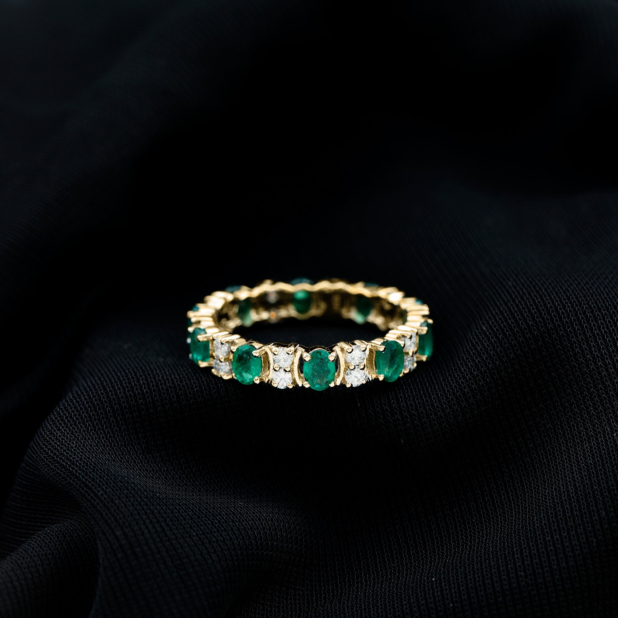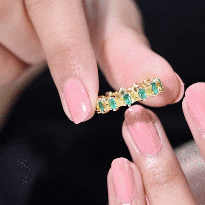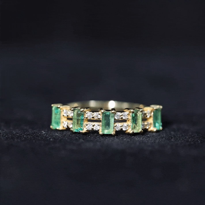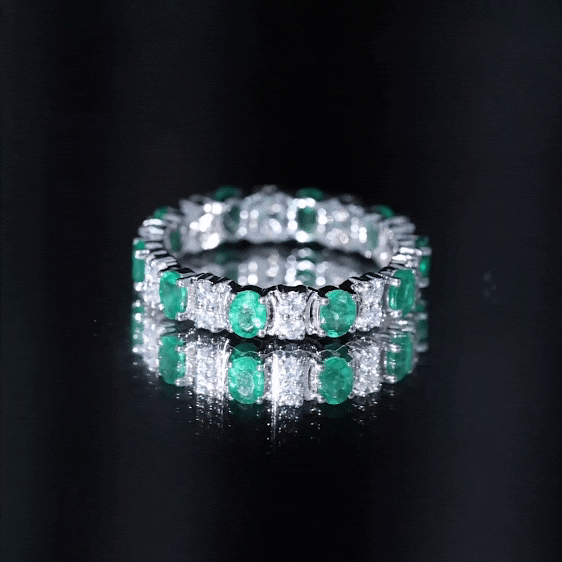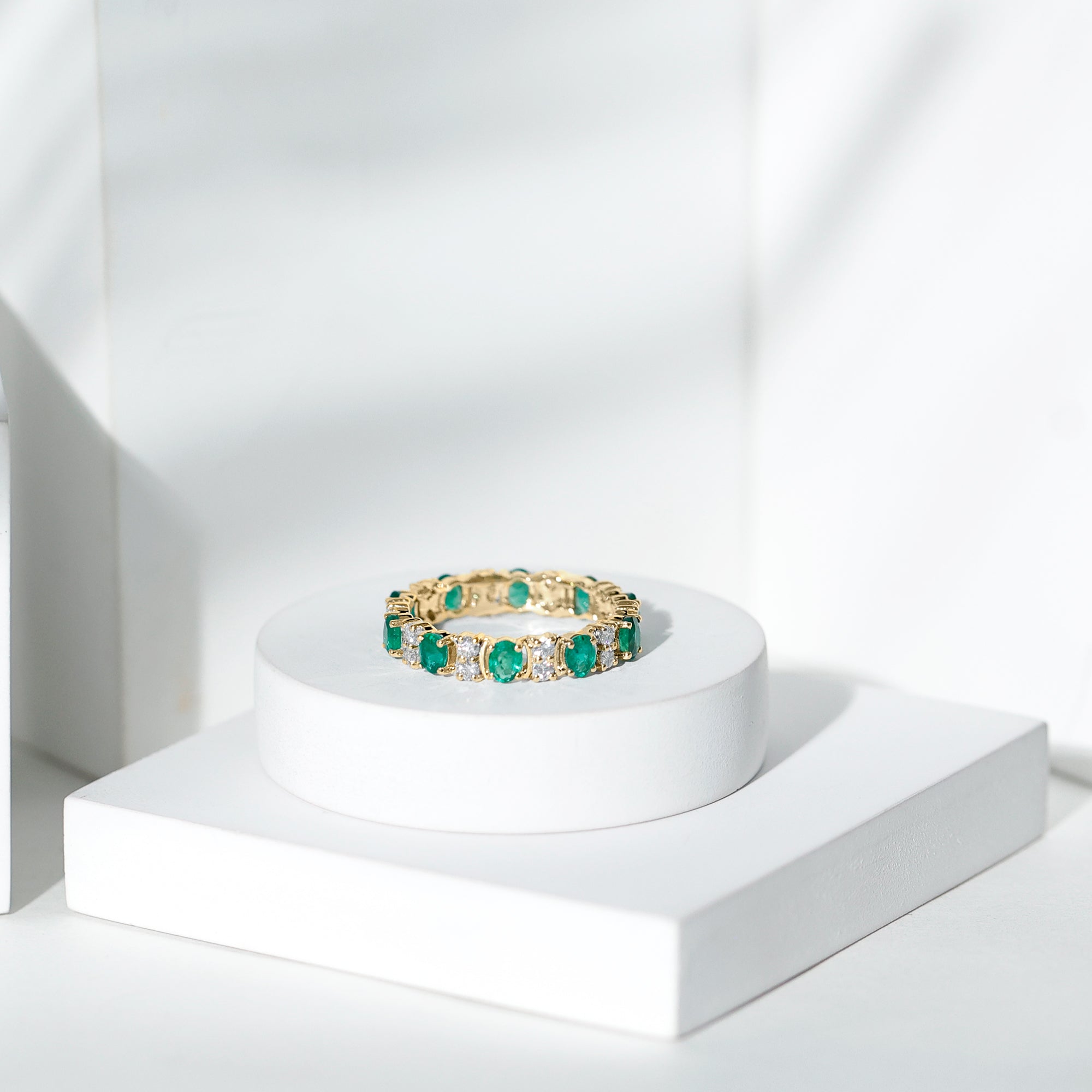 Half-eternity bands feature emeralds across the top portion of the ring, while full-eternity bands circle the entire band with gemstones.