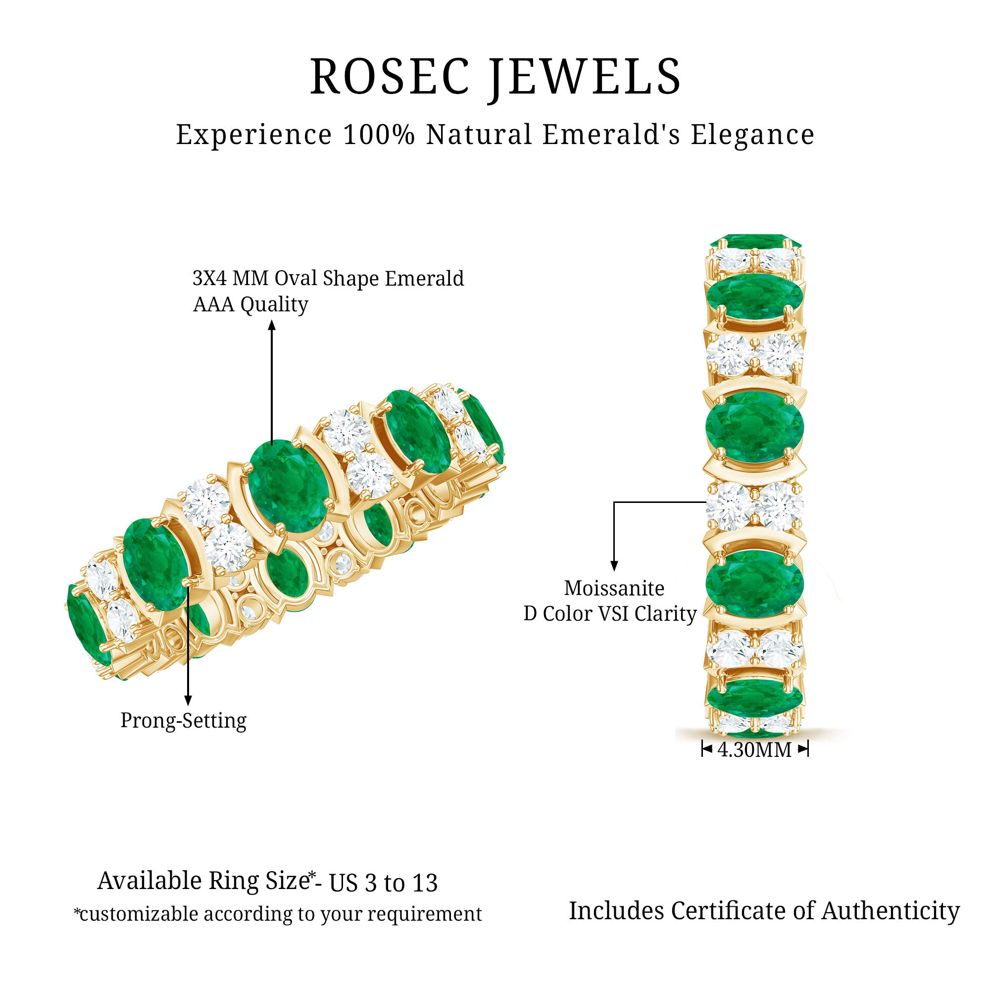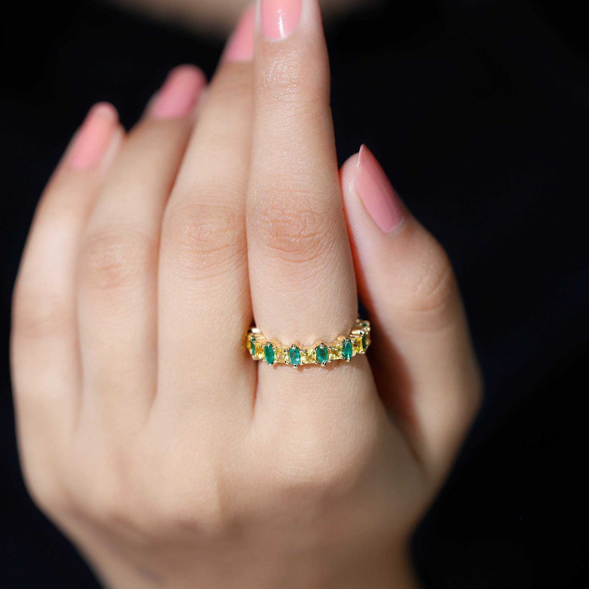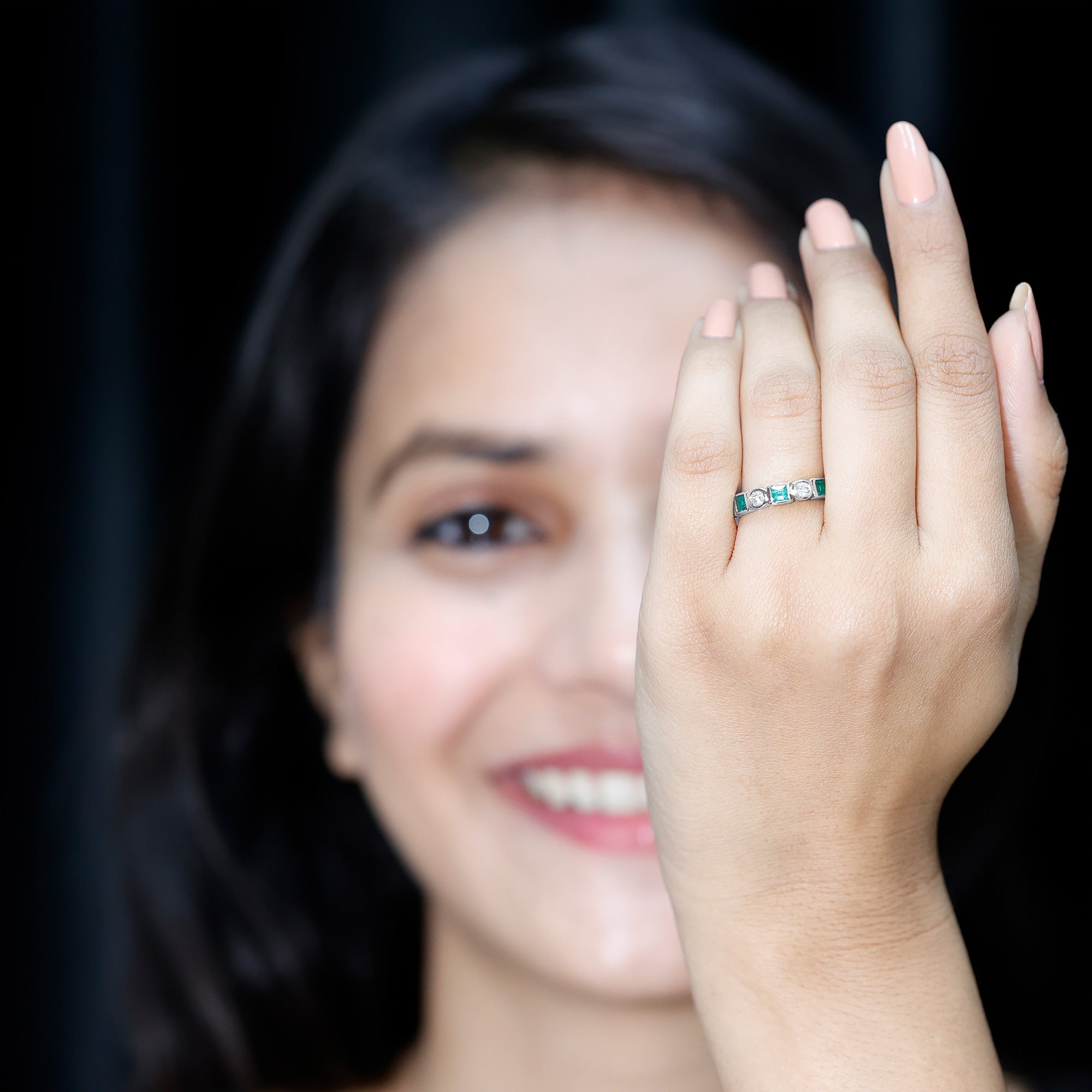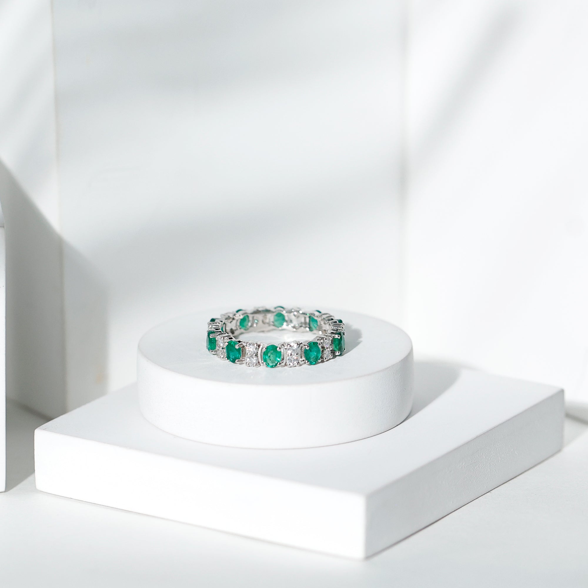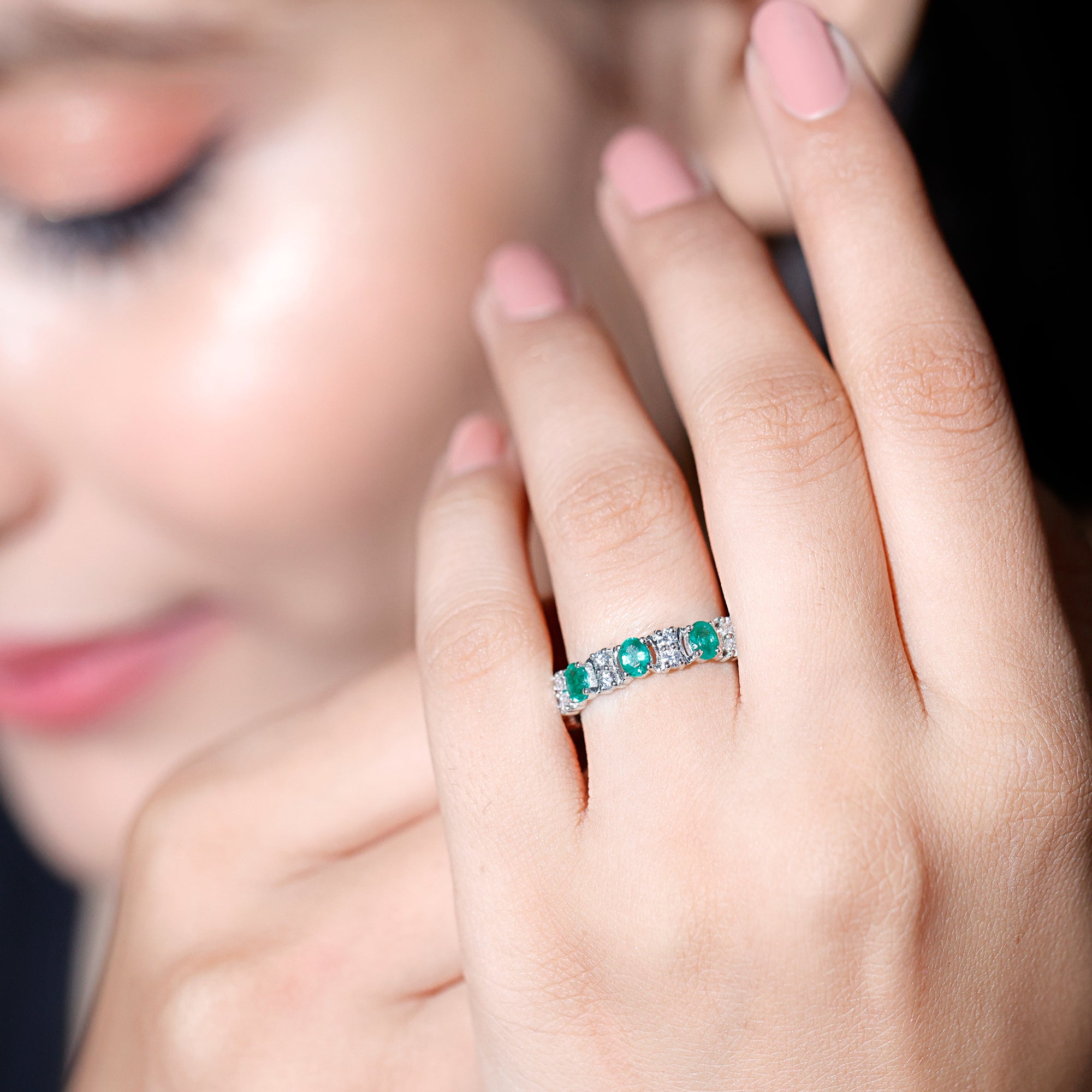 Half-eternity bands offer comfort for daily wear, while full-eternity styles deliver maximum emerald coverage and visual impact.