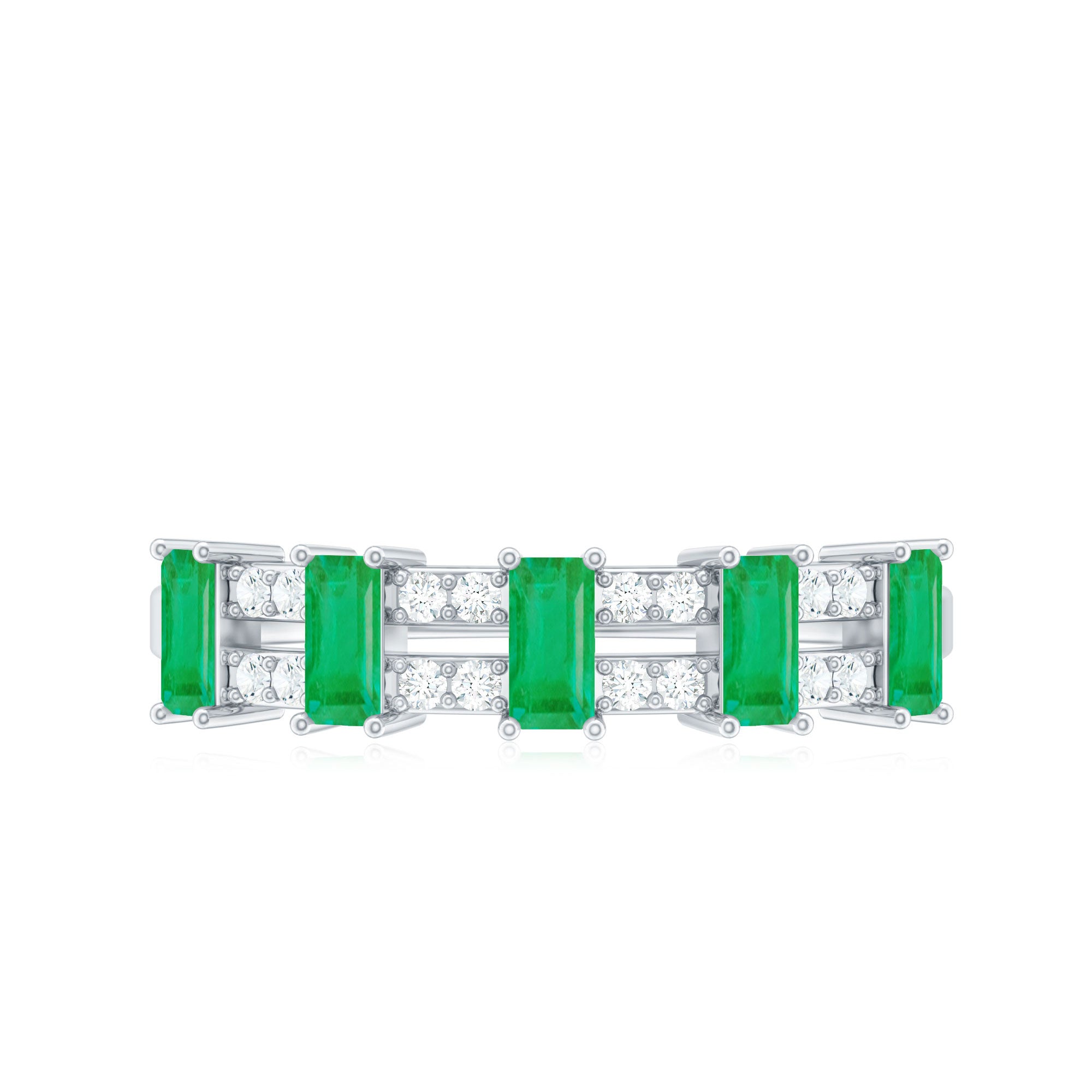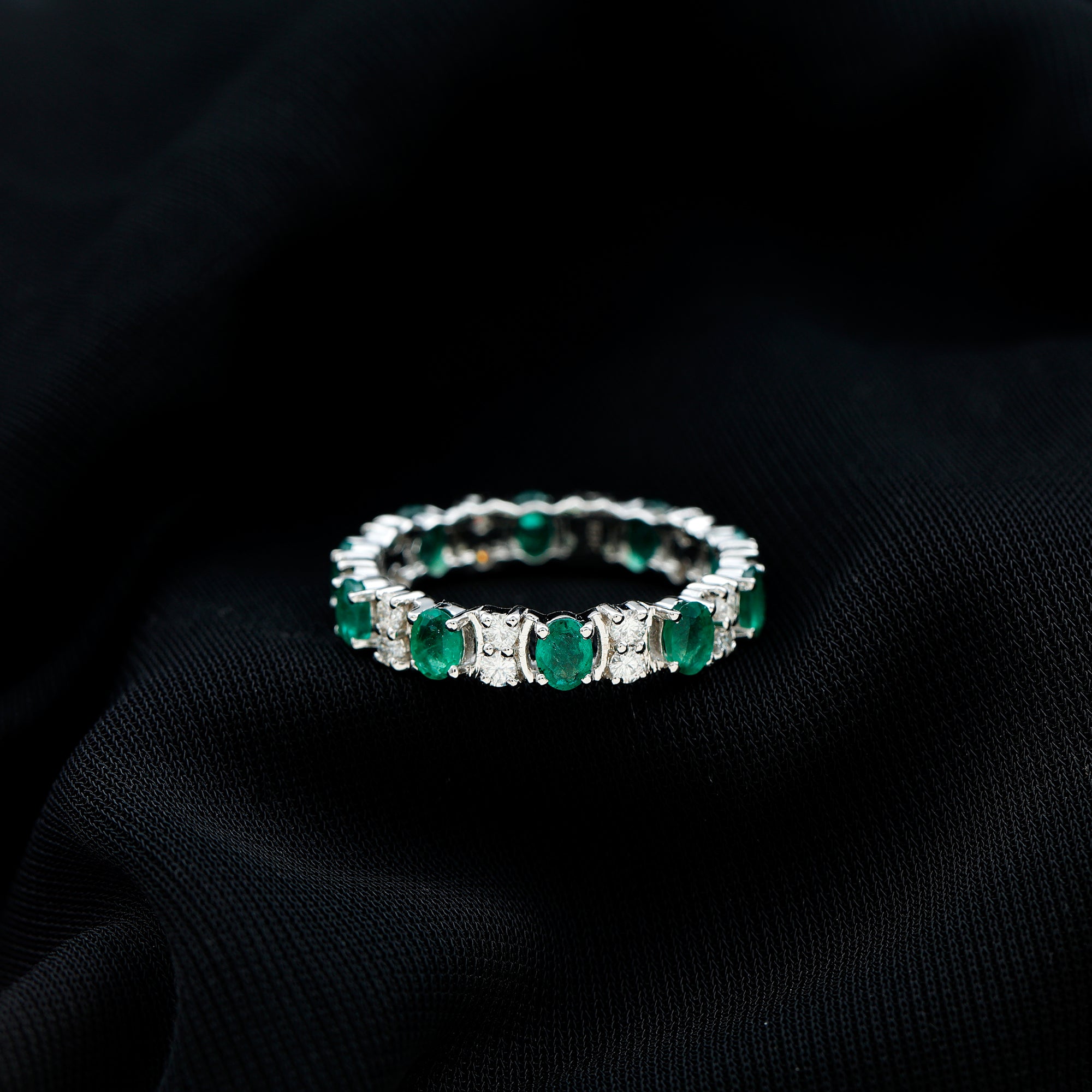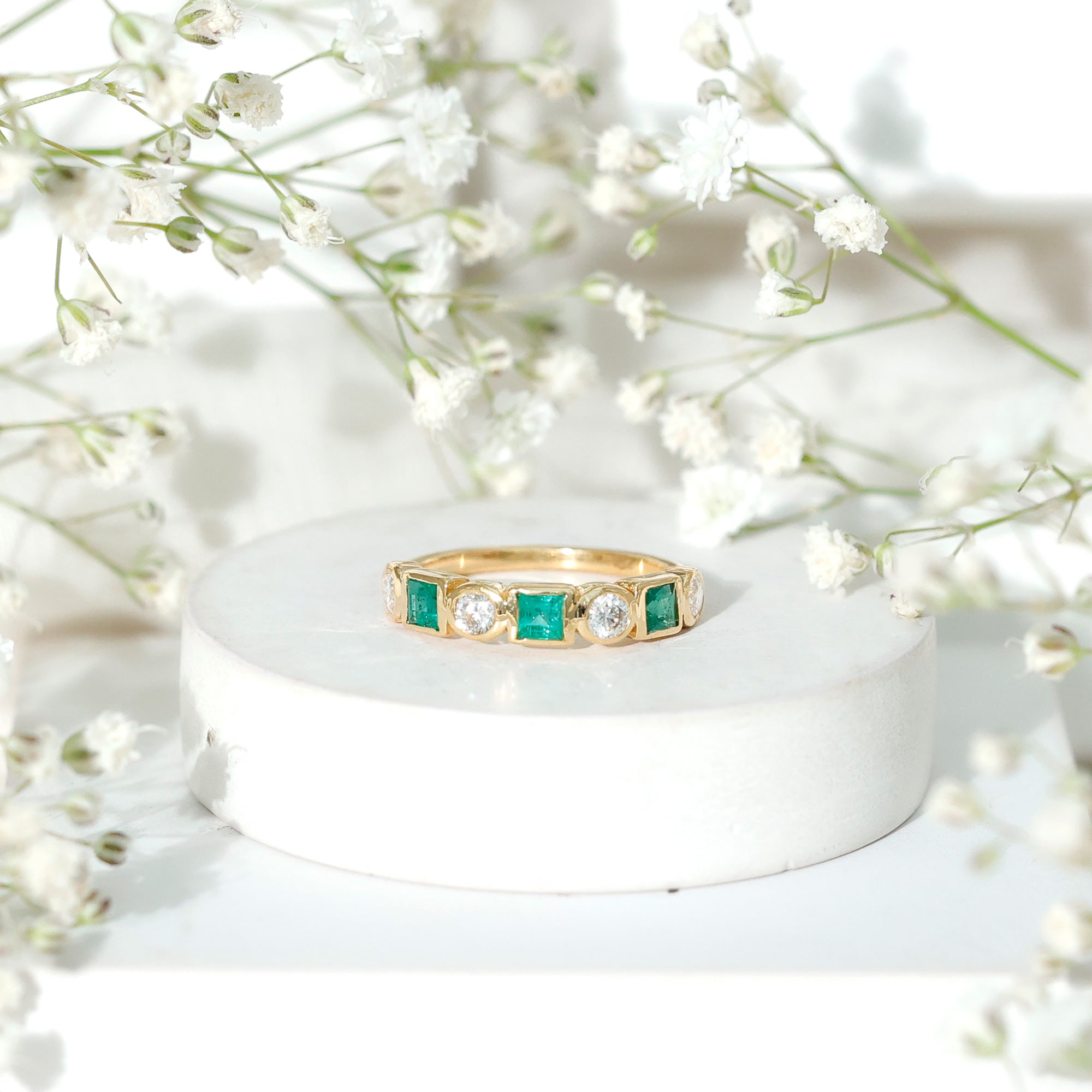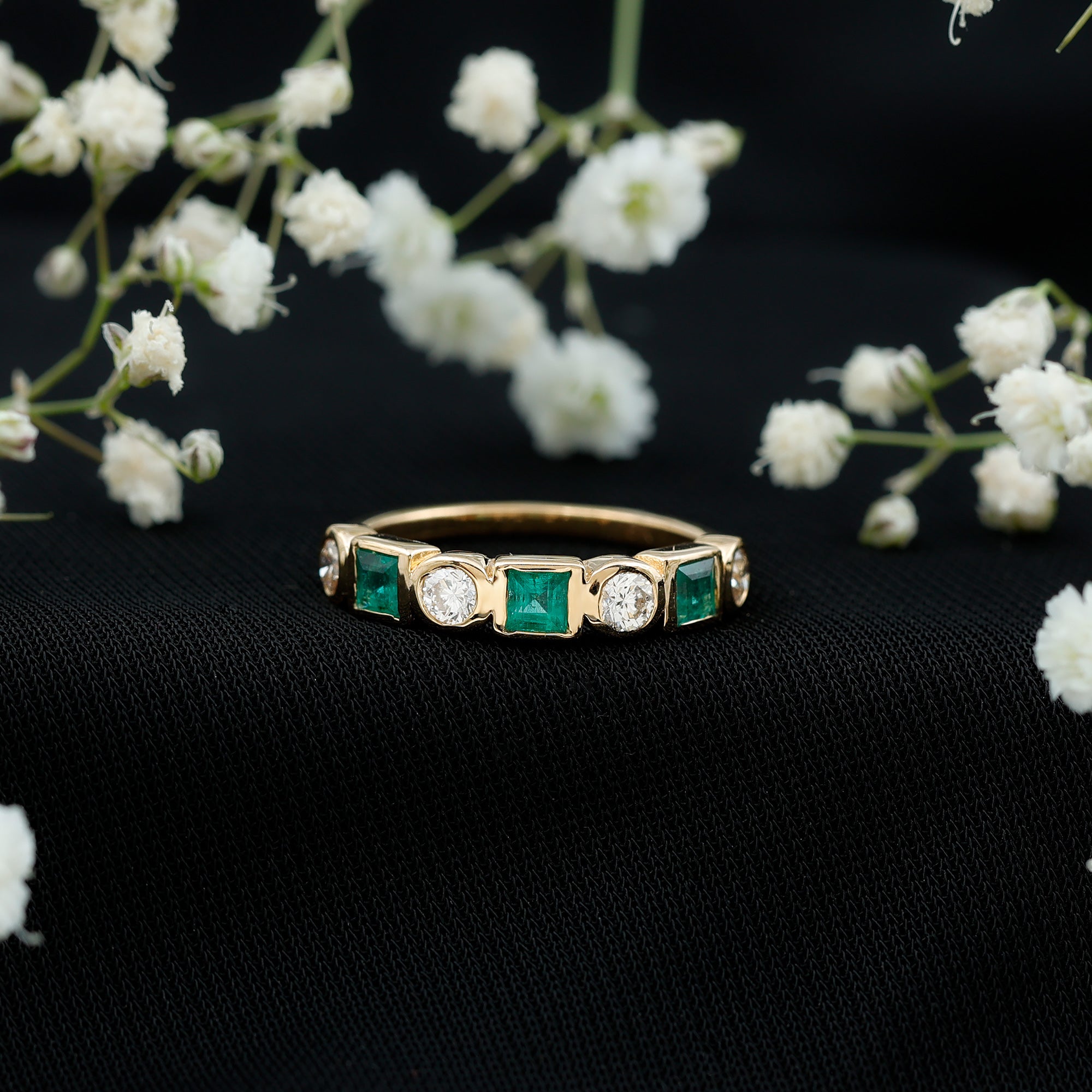Half-eternity bands offer comfort for daily wear, while full-eternity styles deliver maximum emerald coverage and visual impact.