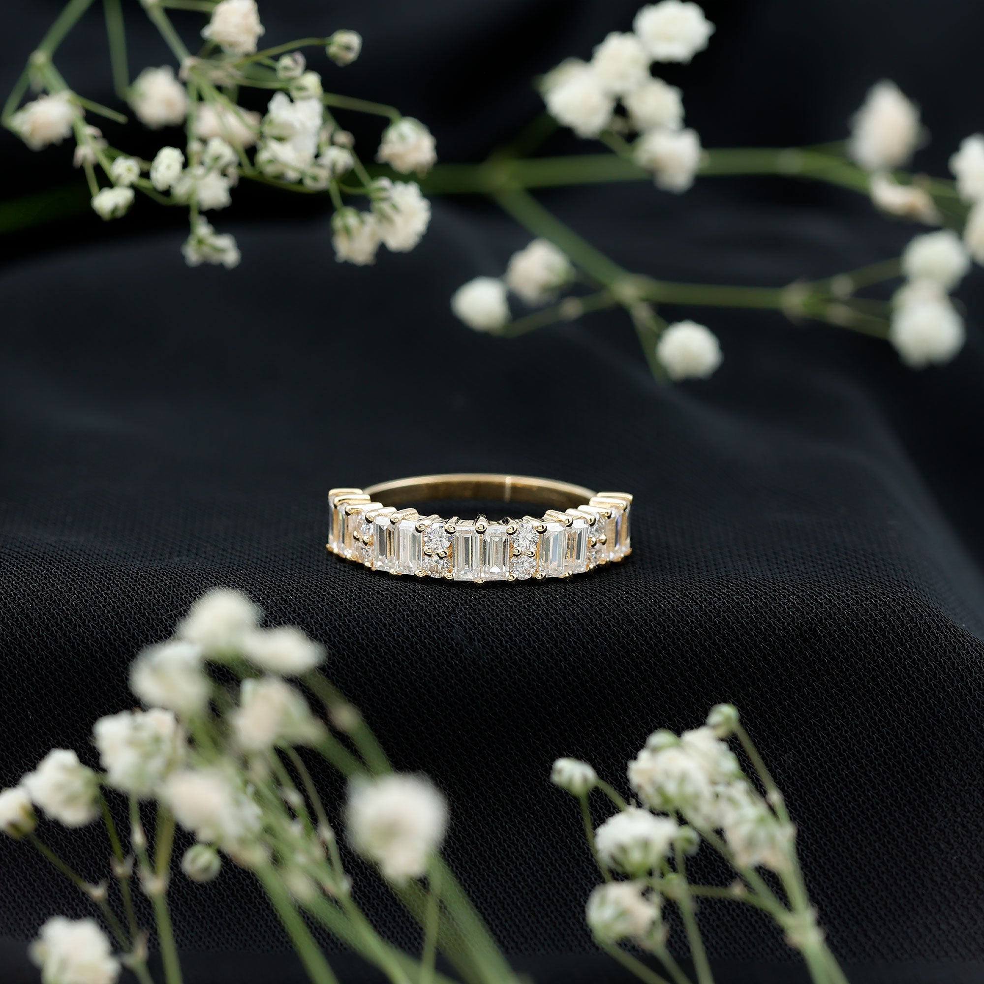Half eternity rings feature stones on the upper half, covering 1/2 or 3/4 of the band. Considered more practical and comfortable, they allow larger stones compared to full eternity rings.